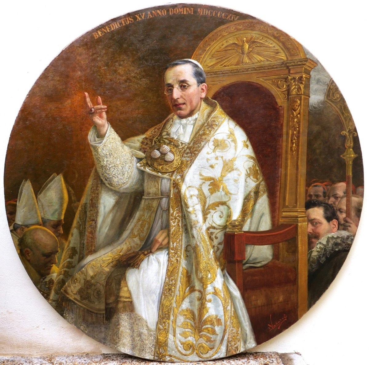 S723 Benedykt XV na papieskim tronie, Duży olej na płótnie, XX w.