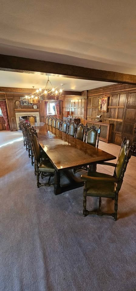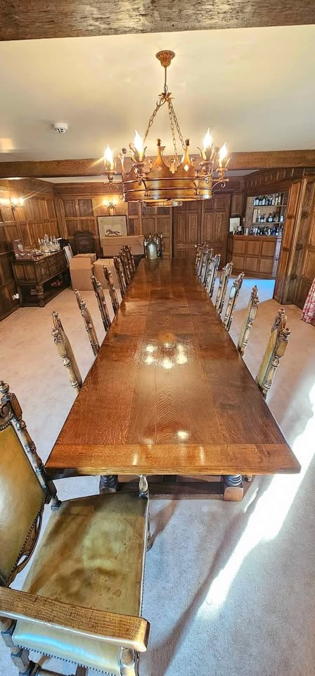 W skład kompletu z drewna dębowego wchodzi: stół, 2 x fotel, 18 x krzesło.