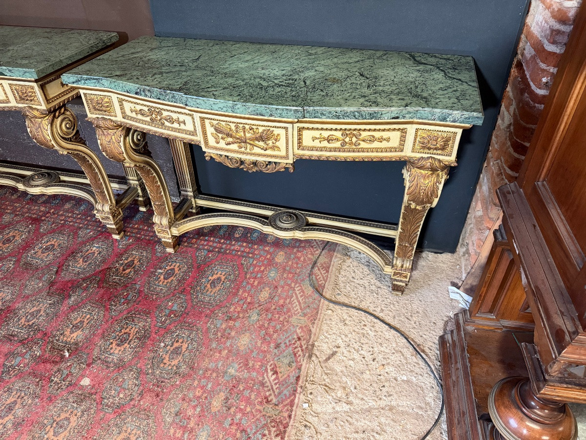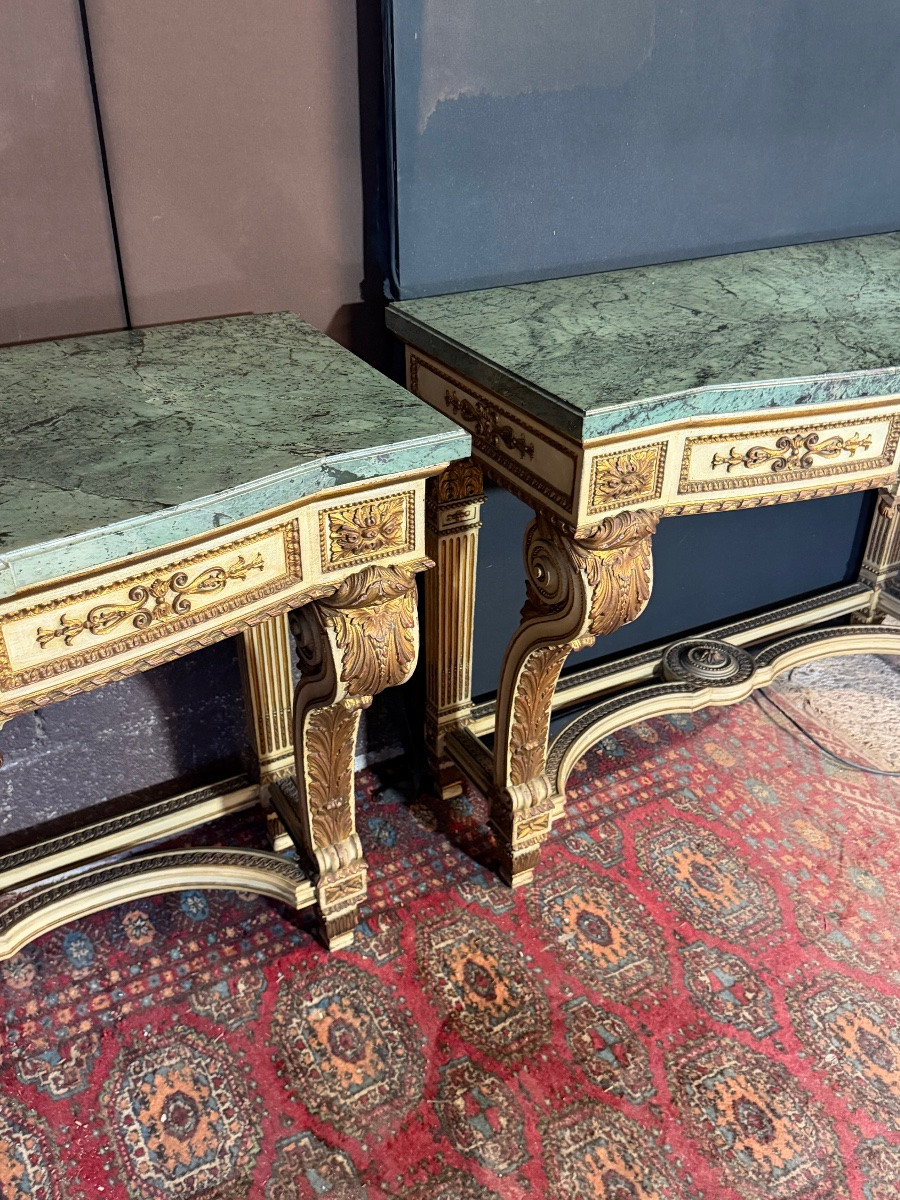 Wspaniała para konsoli z drewna pomalowanego na kolor szary z pozłacanymi akcentami, w idealnym stanie i wysokiej jakości.