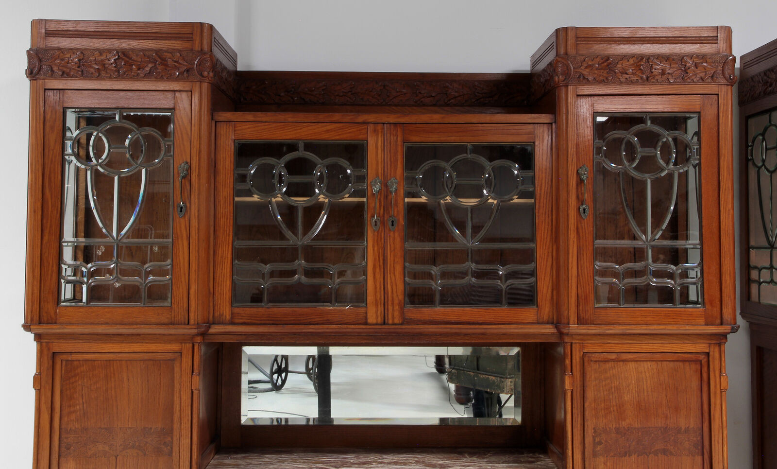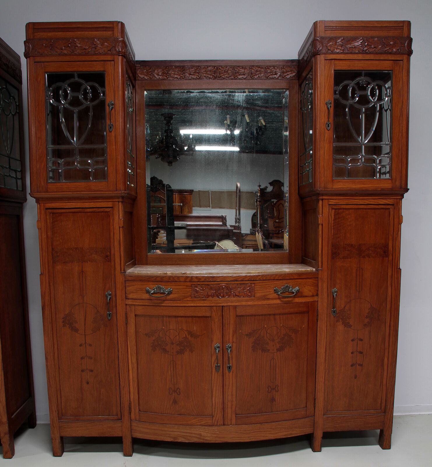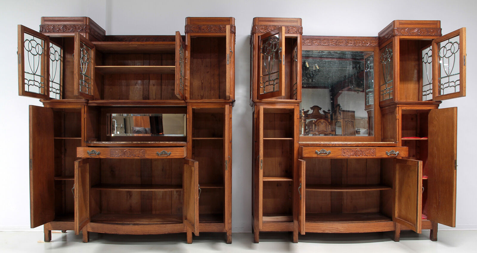 Szczególnie uderzająca jest inspirująca struktura architektoniczna z typowymi dla secesji intarsjami w panelach drzwi lub rzeźbieniach w szufladach. Absolutną atrakcją tych dwóch bufetów są niewiarygodne, ozdobne, fasetowane dyski.