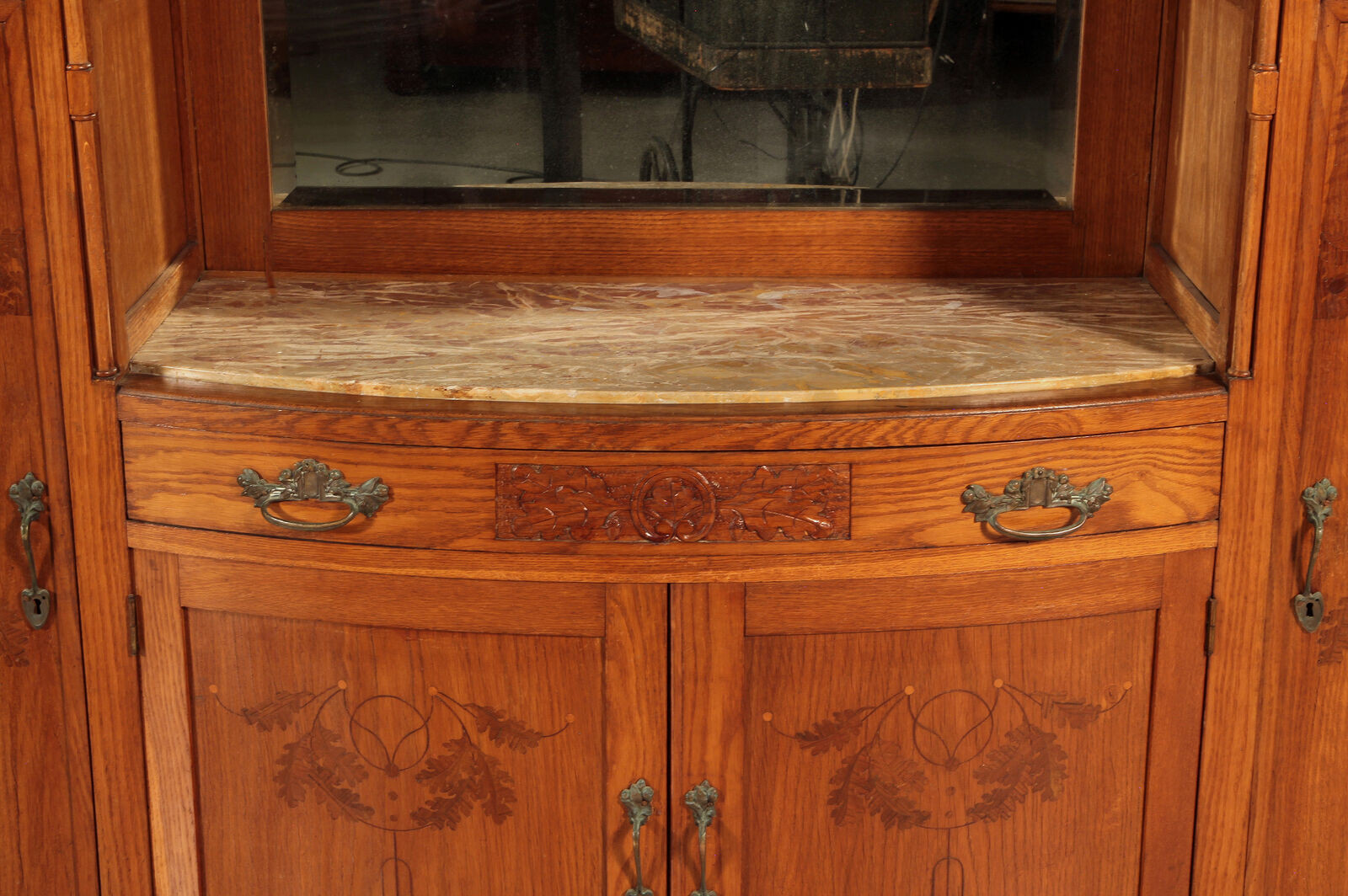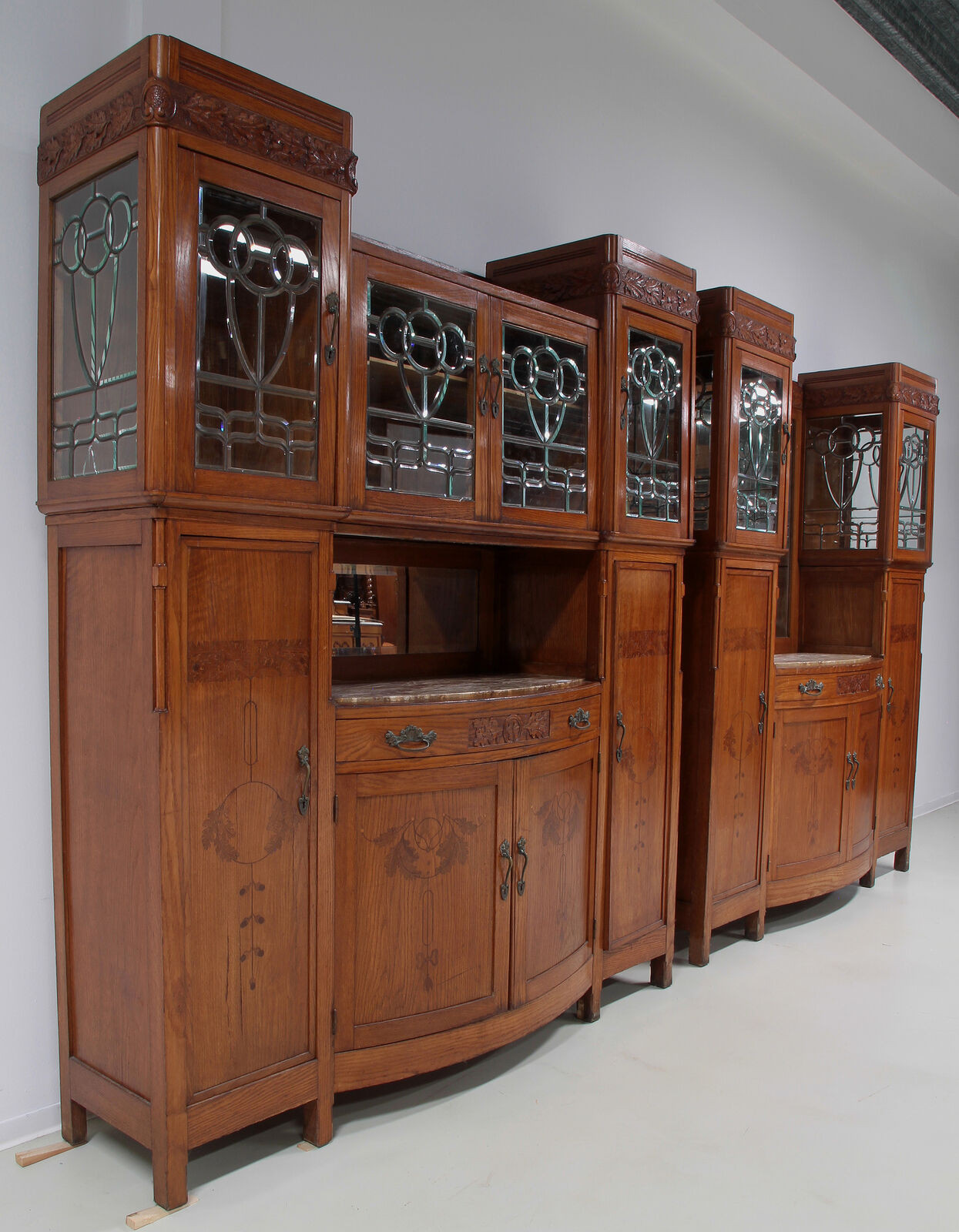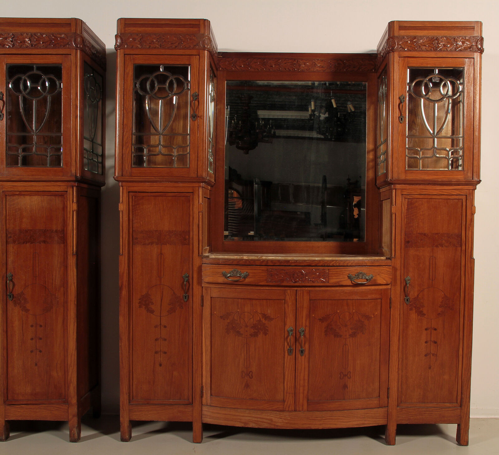 Szczególnie uderzająca jest inspirująca struktura architektoniczna z typowymi dla secesji intarsjami w panelach drzwi lub rzeźbieniach w szufladach. Absolutną atrakcją tych dwóch bufetów są niewiarygodne, ozdobne, fasetowane dyski.