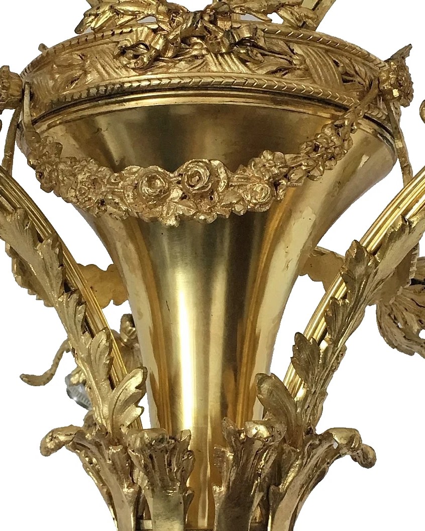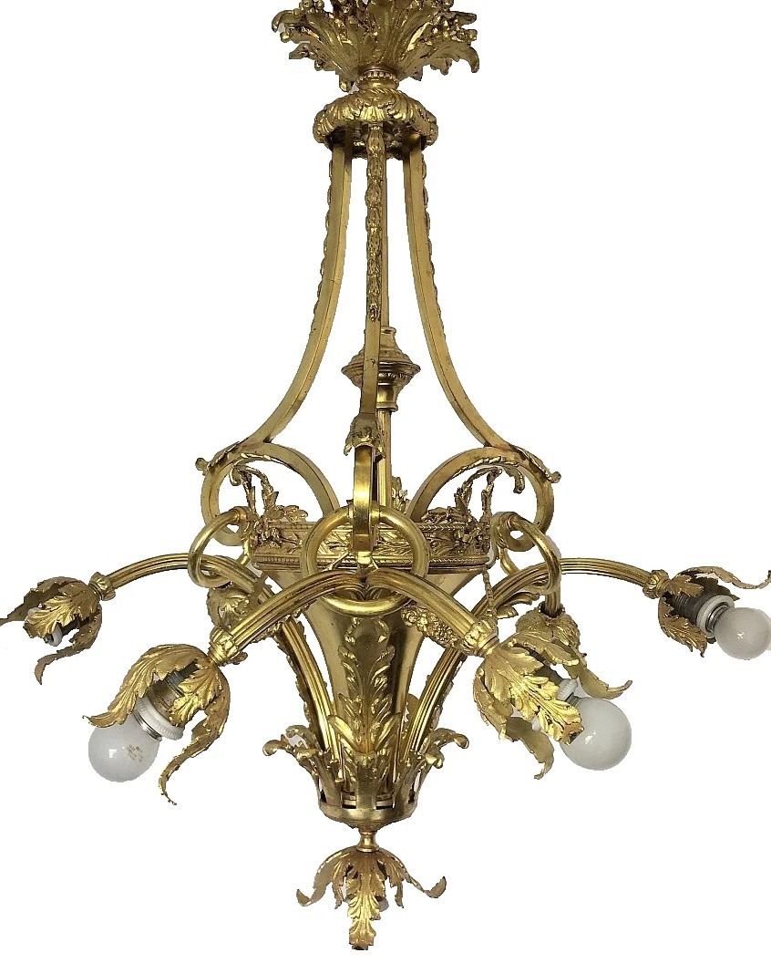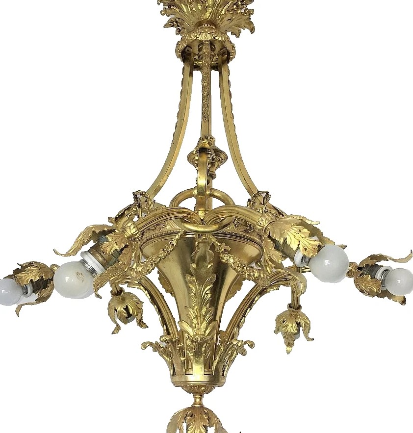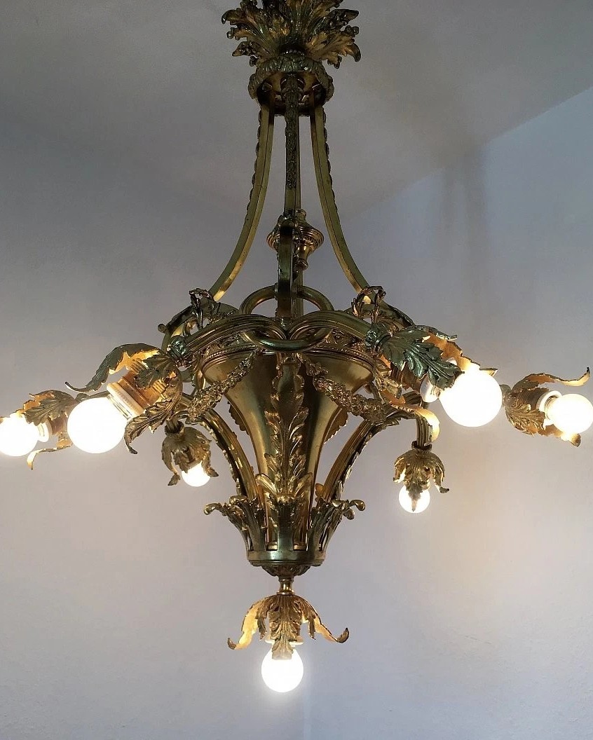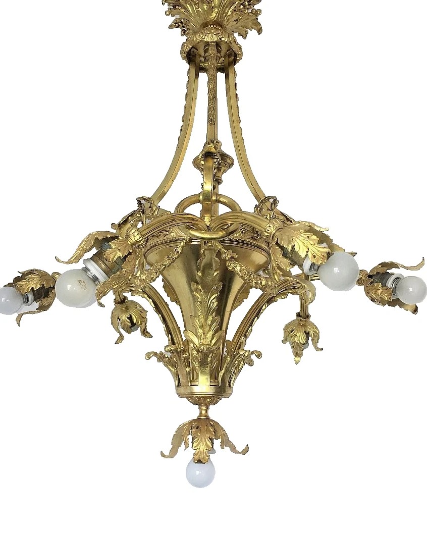 Francuski żyrandol antyczny z epoki Empire, stylu Louis Philippe, pochodzący z lat 15-16, wykonany ze złoconego brązu, z datą powstania 1890. Oferuje elegancki i wyszukany wygląd, idealny do klasycznych wnętrz.