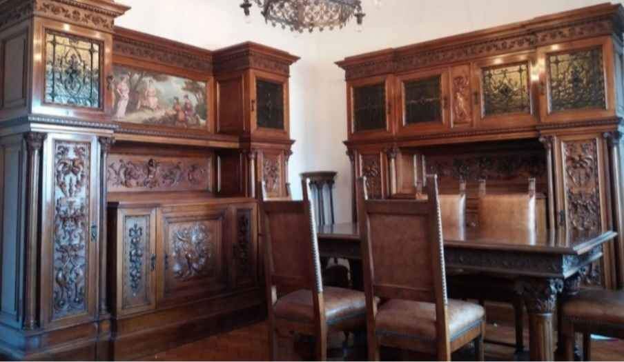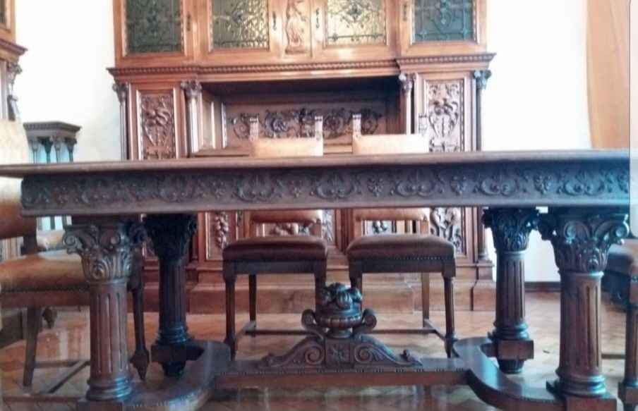 W skład kompletu wchodzi: 2 x kredens, rozkładany stół, 8 x krzesło.