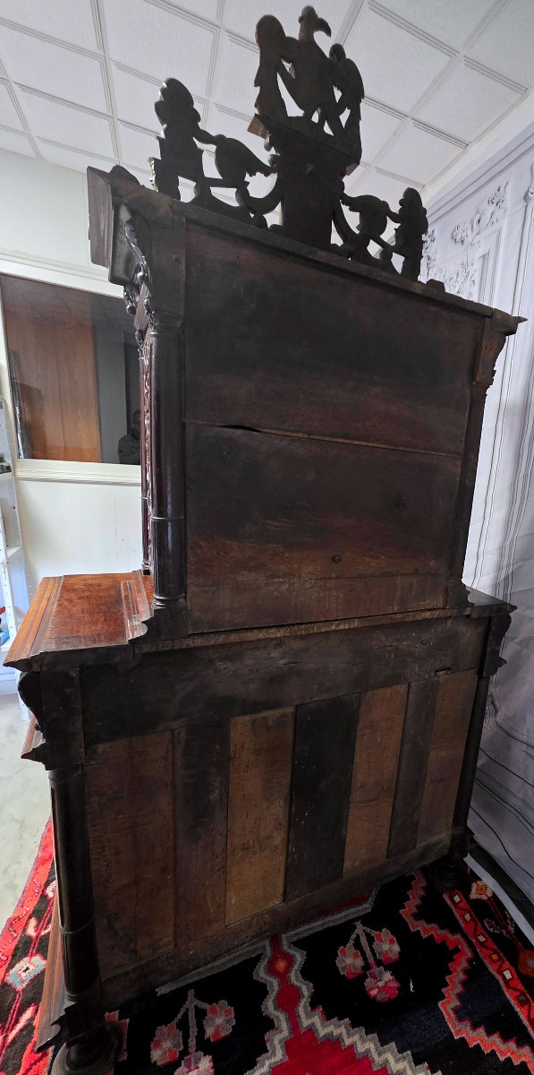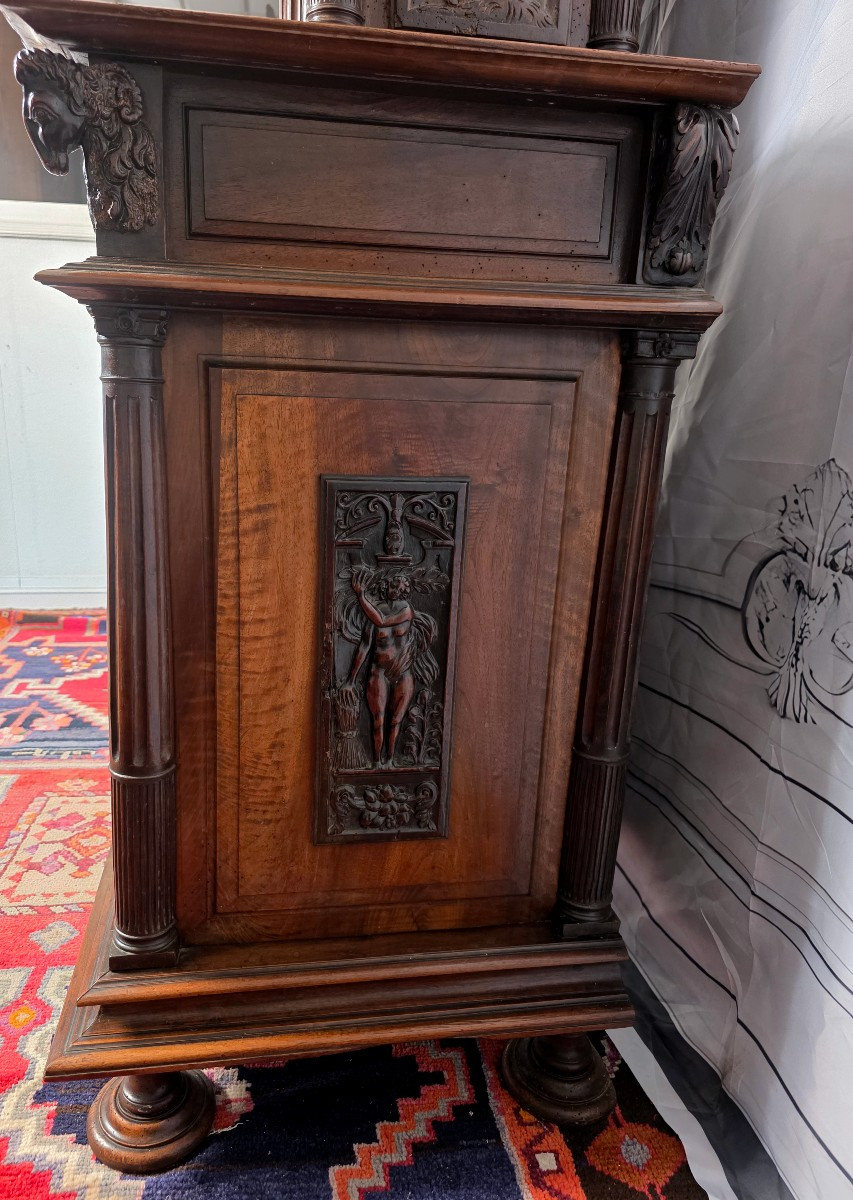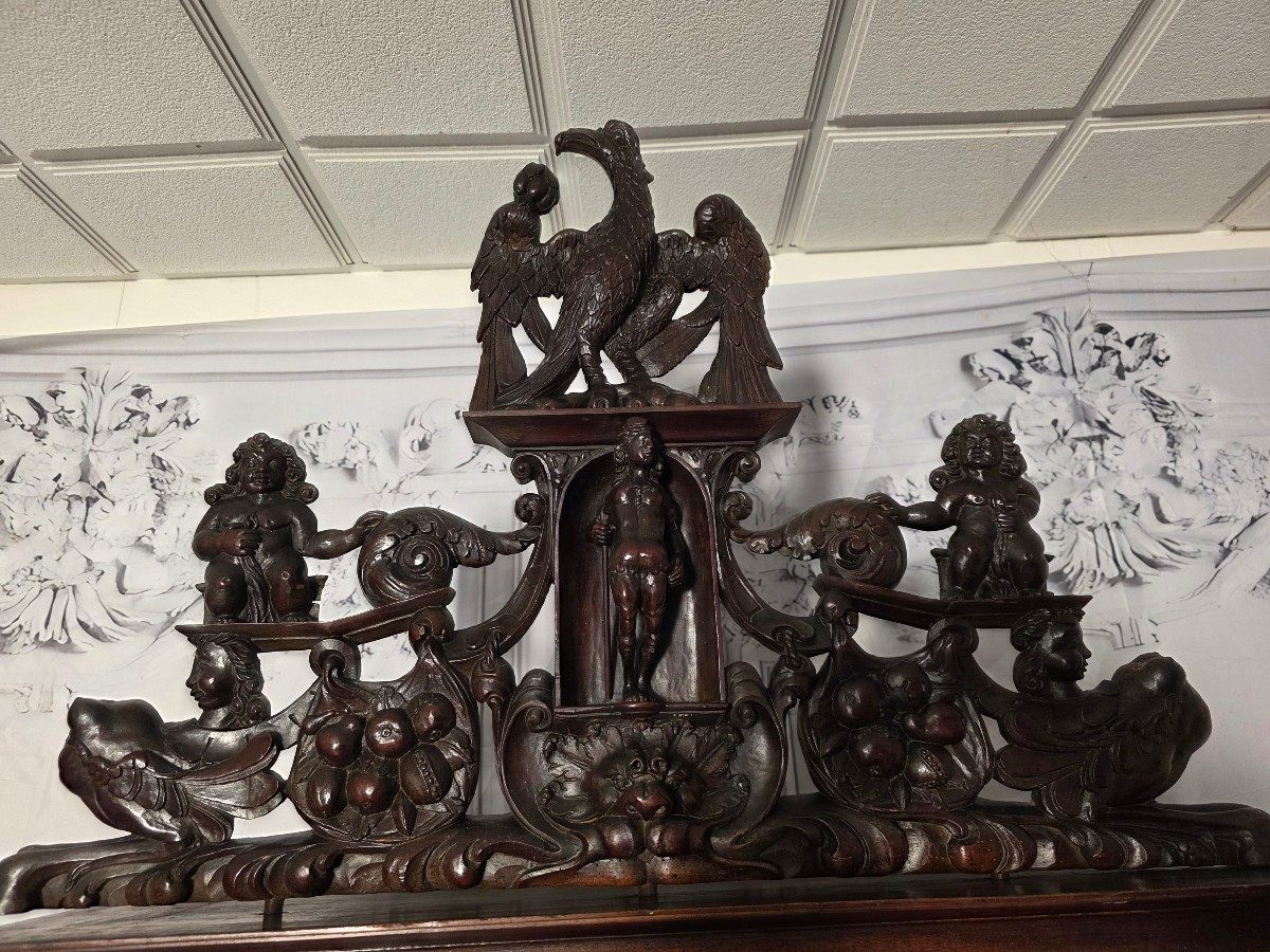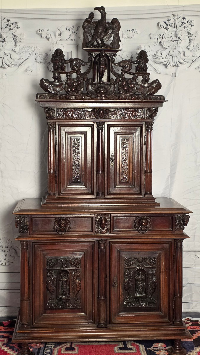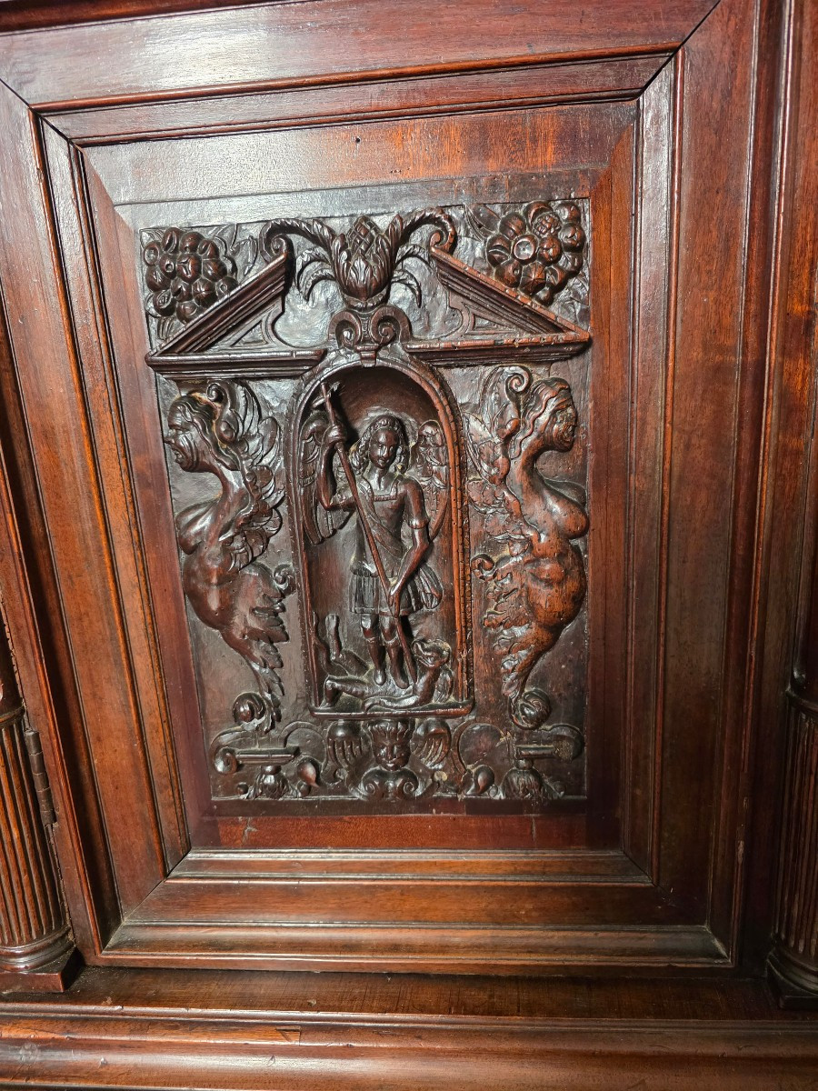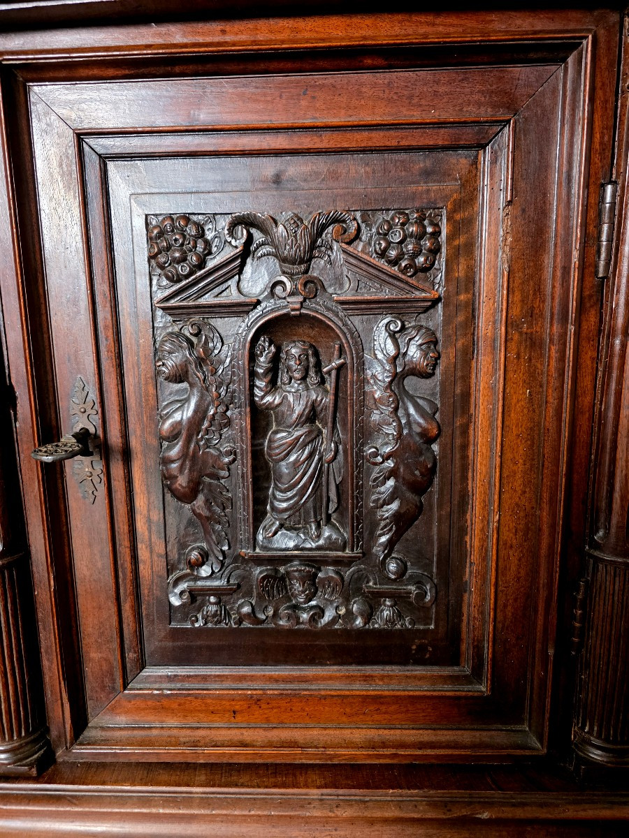 Piękna, głęboka, a nawet antyczna patyna podkreśla jakość rzeźbienia i wiek dzieła. Okres: XIII wiek. Przeznaczenie: Mały bufet. Materiał: Rzeźbione lite drewno.