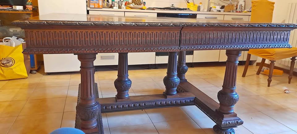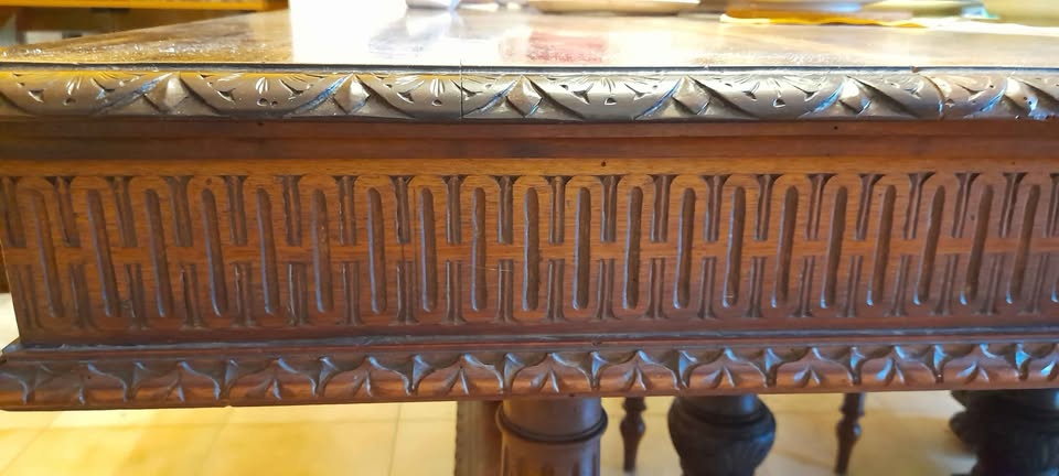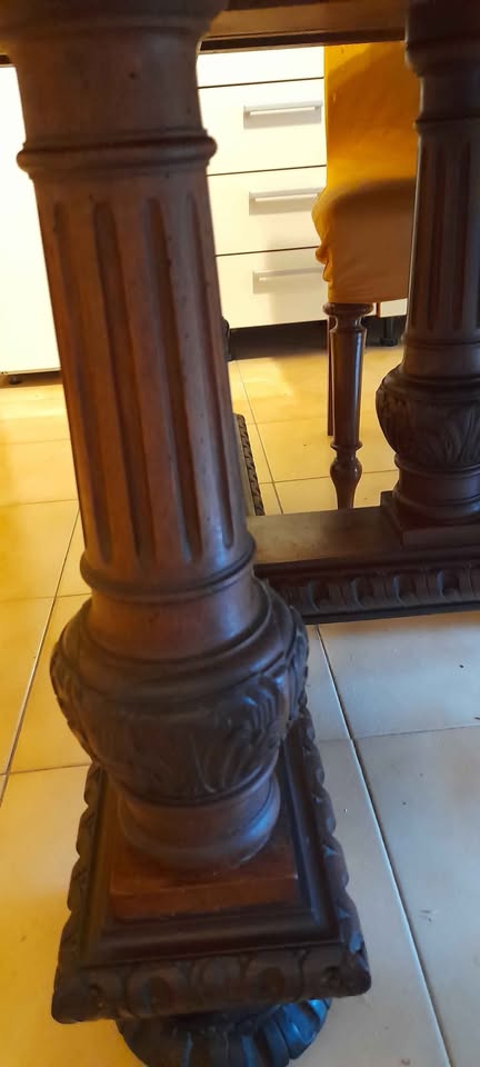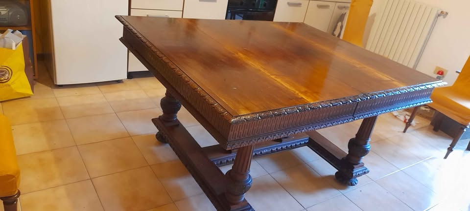 Stół sześcioosobowy rozkładany do 12 osób, 120 x 150 cm x 78 cm wysokości, kasztanowy. Około 1850 roku.