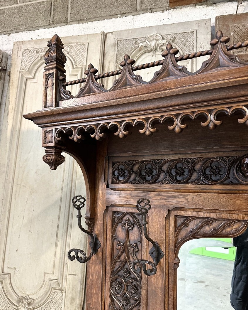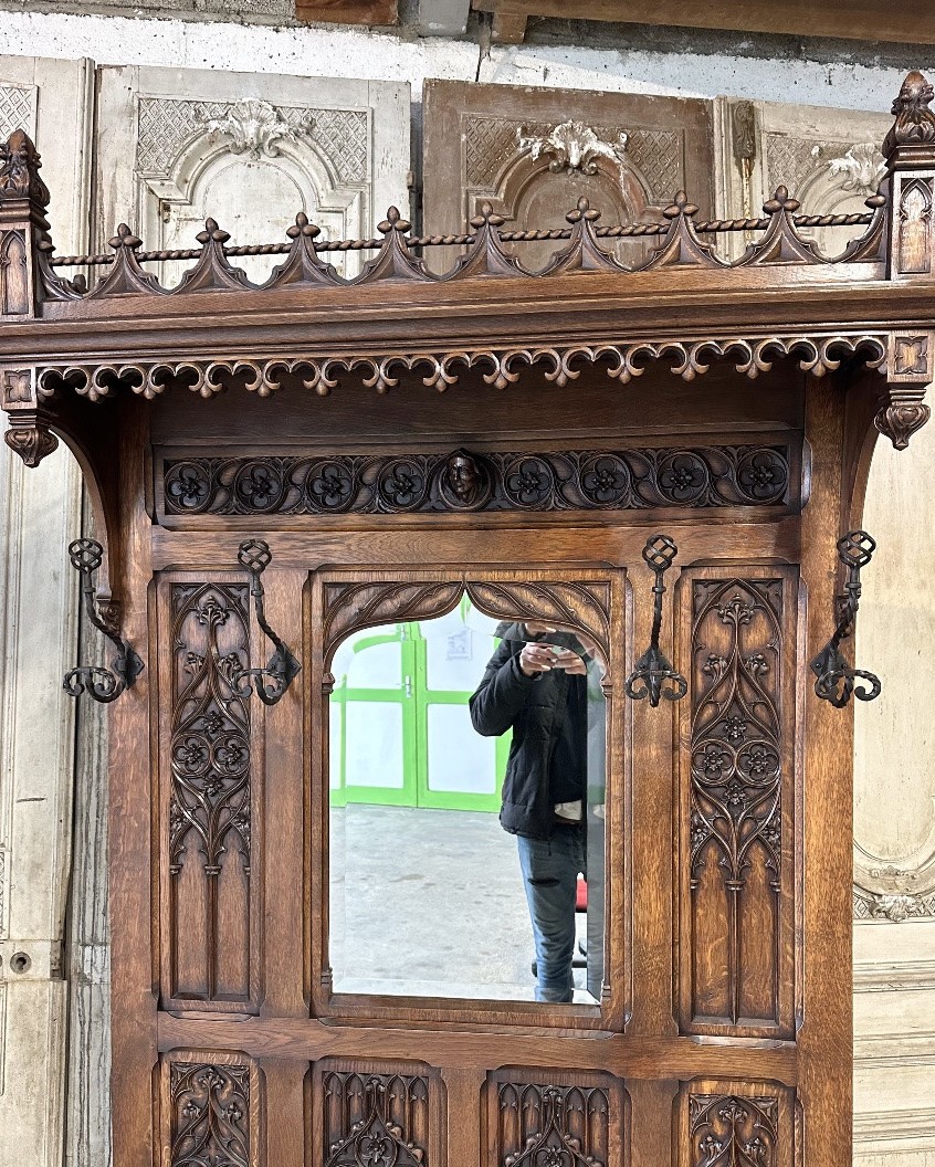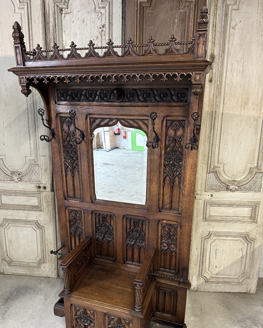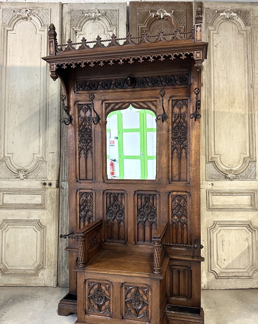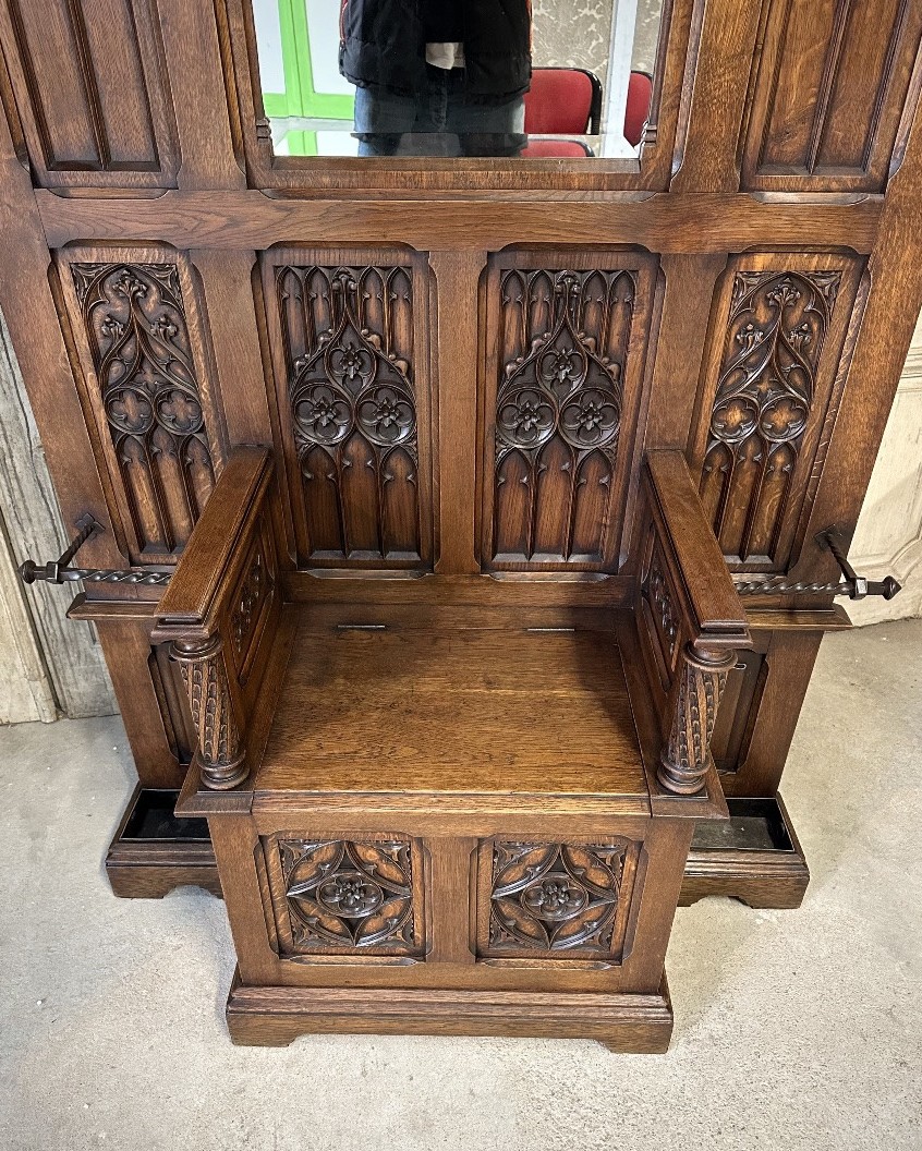 Szuflada w stylu neo-gotyckim, datowana na około 1900 rok, wyróżnia się wyjątkowym designem, który łączy charakterystyczne cechy gotyki z nowoczesnymi elementami tamtej epoki. Jej zdobienia oraz detale odzwierciedlają mistycyzm i romantyzm tego stylu, a solidne wykonanie świadczy o wysokiej jakości rzemiosła.