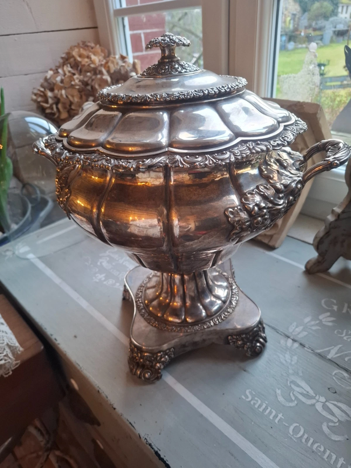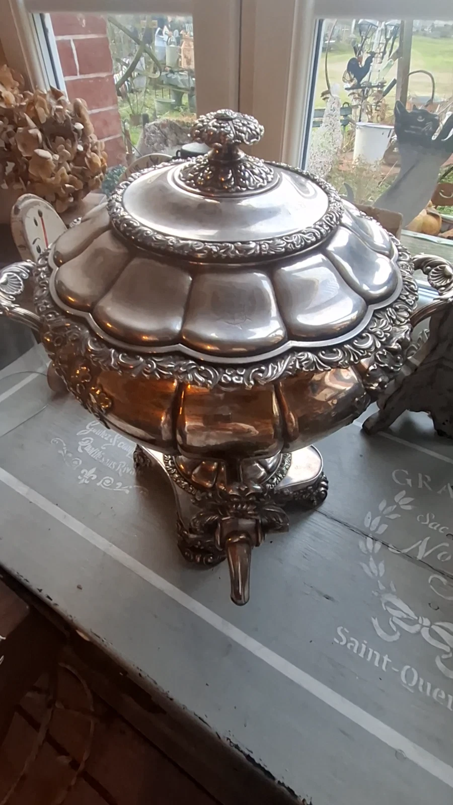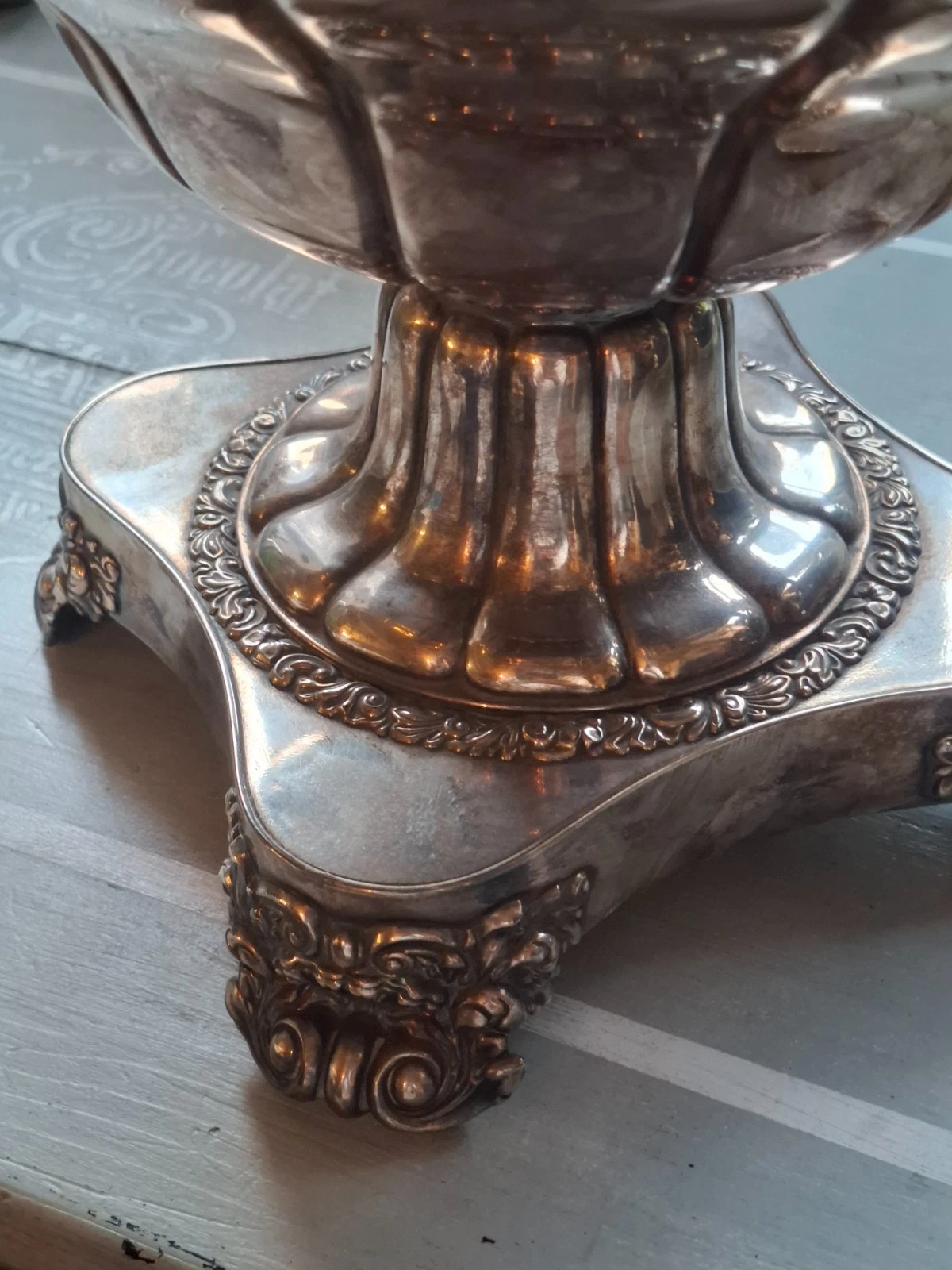 Wyjątkowy samowar metalowy posrebrzany, inspirowany stylem Ludwika XVI oraz rokoko, datowany na koniec XIX wieku. Ozdobiony herbem, stanowi piękny przykład rzemiosła artystycznego z tego okresu.