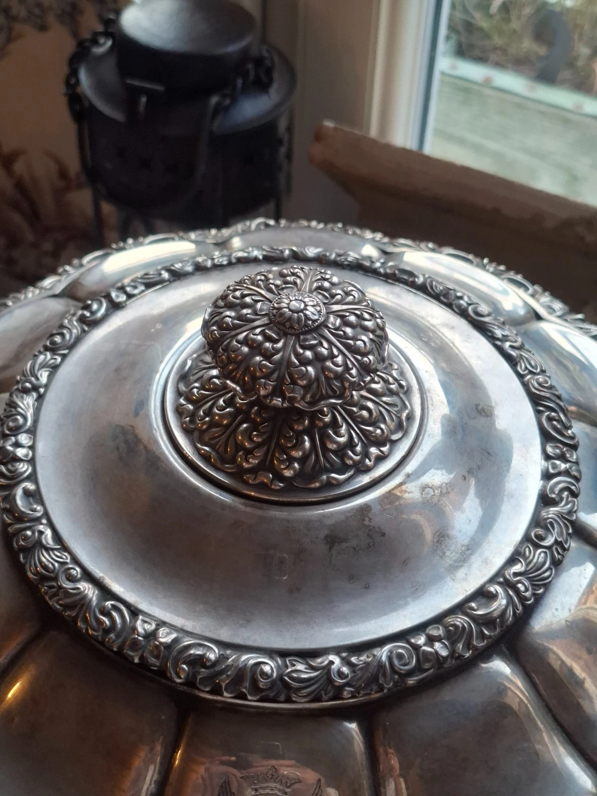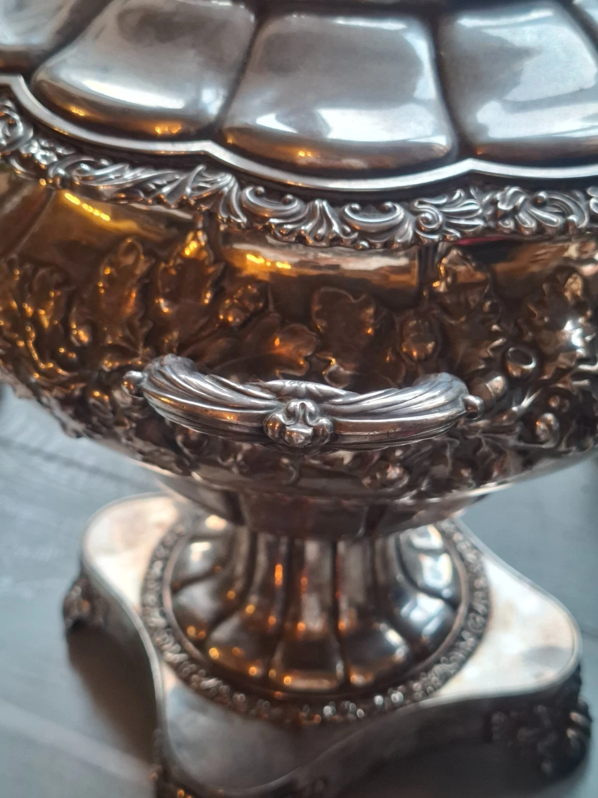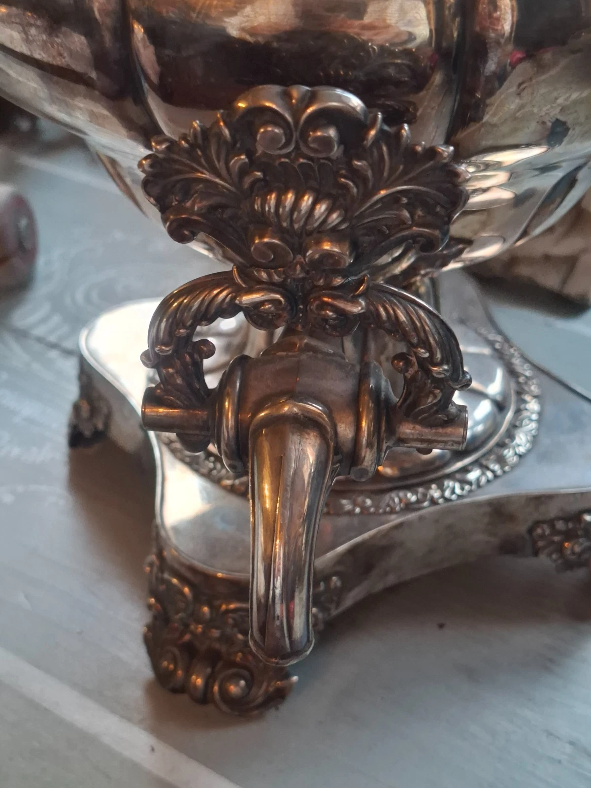 K129 Wyjątkowy samowar metalowy posrebrzany w stylu Ludwika XVI, rokoko, koniec XIX wieku, herb.