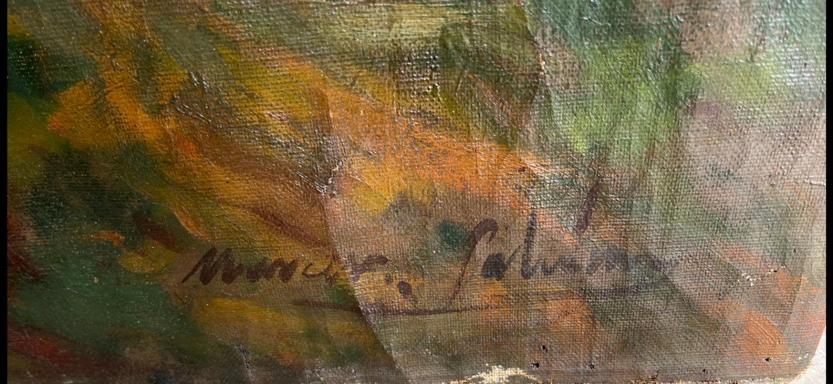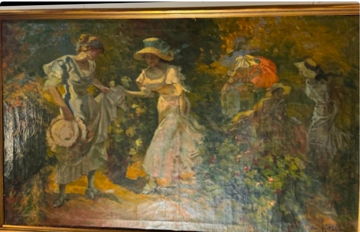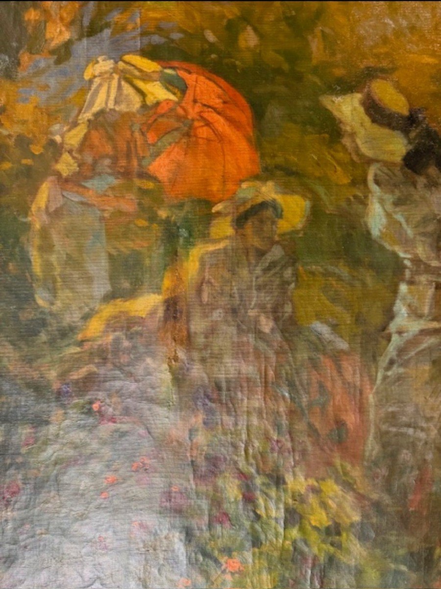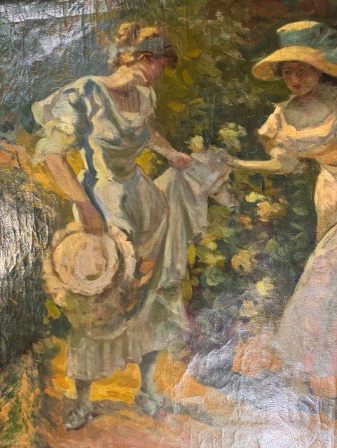 postimpresjonistyczny obraz olejny na płótnie przedstawiający eleganckie kobiety w ogrodzie różanym, podpis nieczytelny, z tyłu widoczne są dwa niewielkie miejsca renowacji, rama współczesna