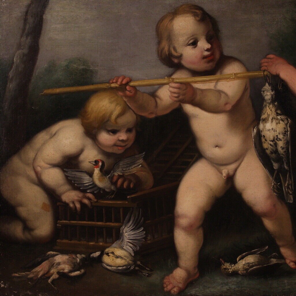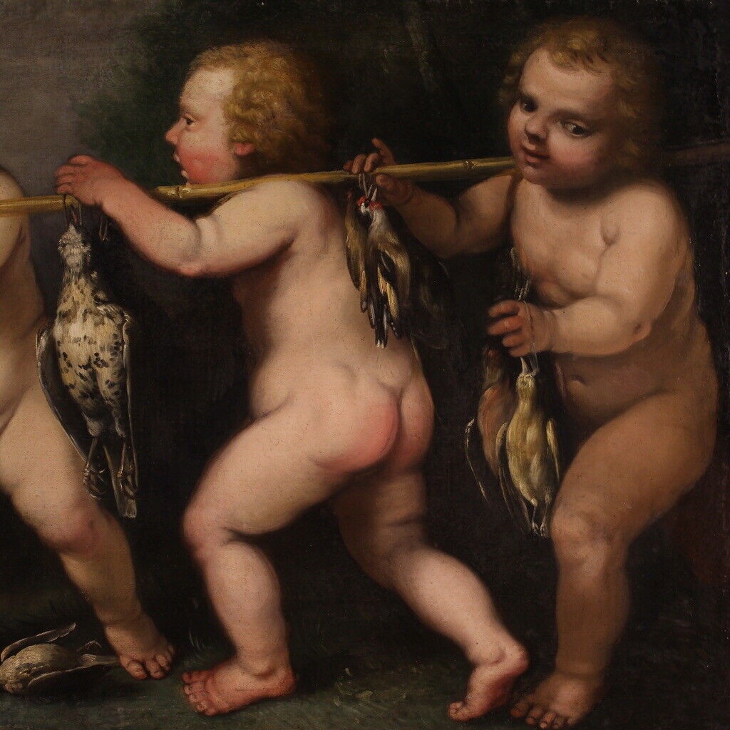 Obraz olejny przedstawiający alegoryczną zabawę puttów ze zwierzyną. Obraz po renowacji. W dobrym stanie.