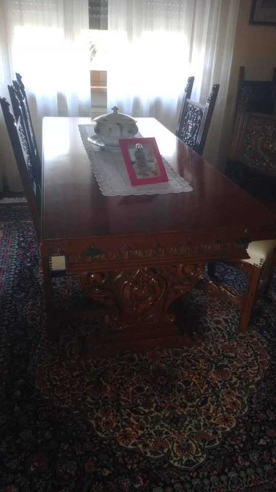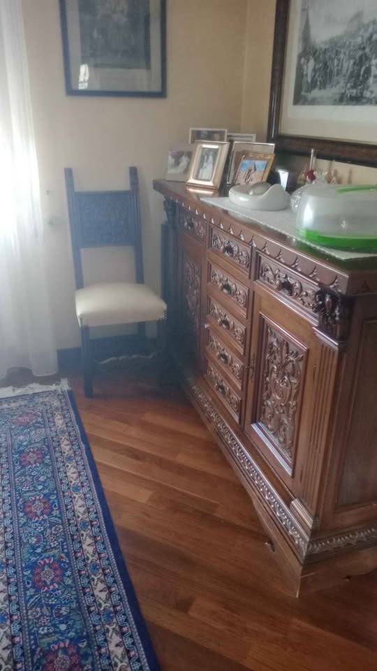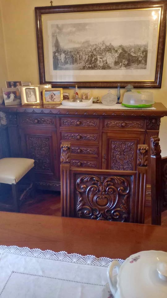 Komoda o wymiarach 180 cm x 55 cm długości plus stół o wymiarach 180 cm x 80 cm długości plus 6 krzeseł z siedziskami z tkaniny, w idealnym stanie