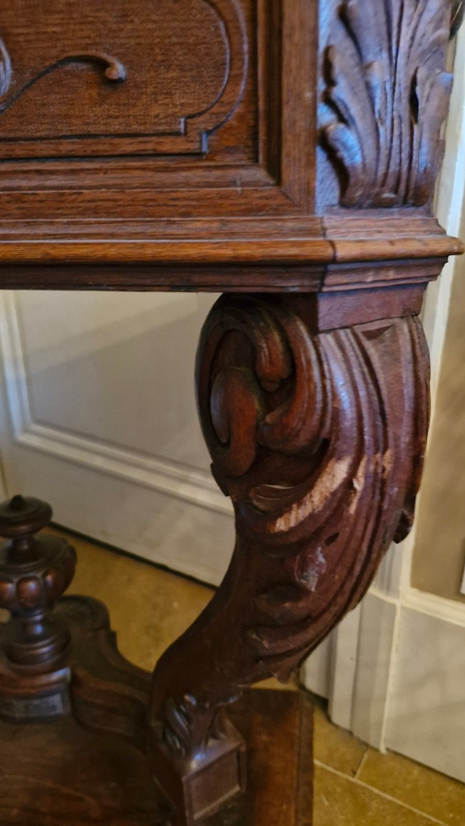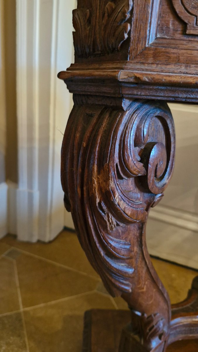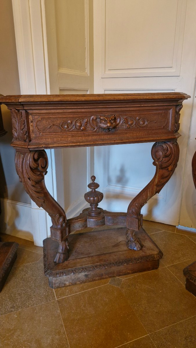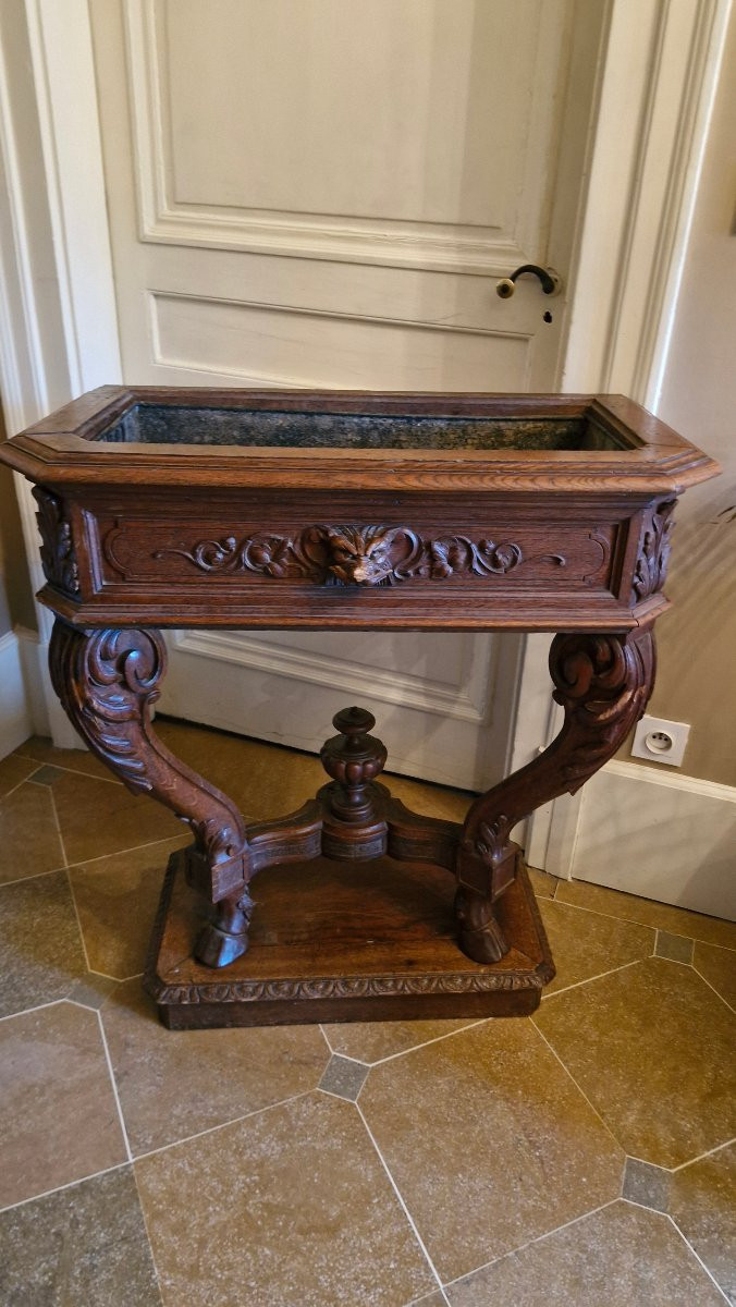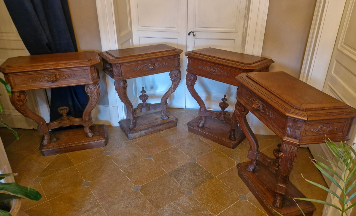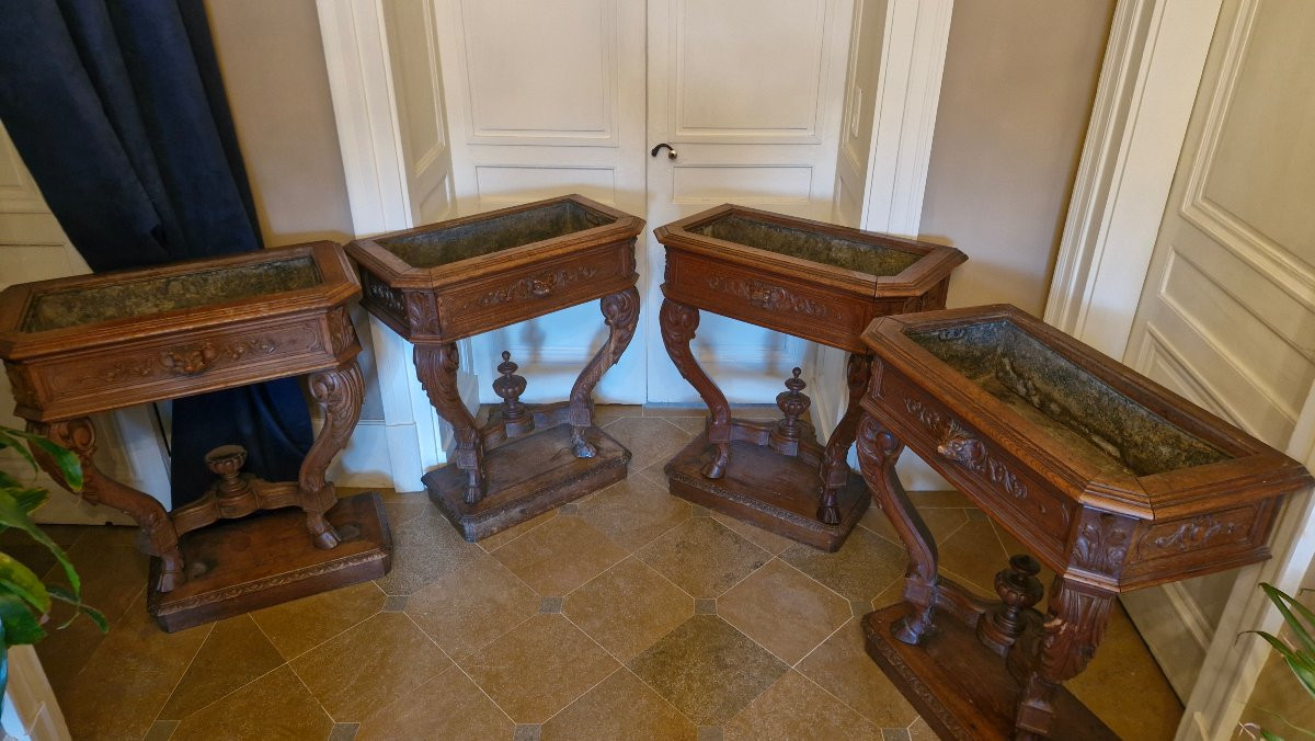 Rzadki zestaw czterech rzeźbionych dębowych konsoli w stylu renesansowym, tworzących donice. Pochodzą one z zamku we Franche-Comté i datowane są na koniec XIX wieku. Są ozdobione głowami lwów z przodu, a ich nogi zakończone są kopytami jelenia.