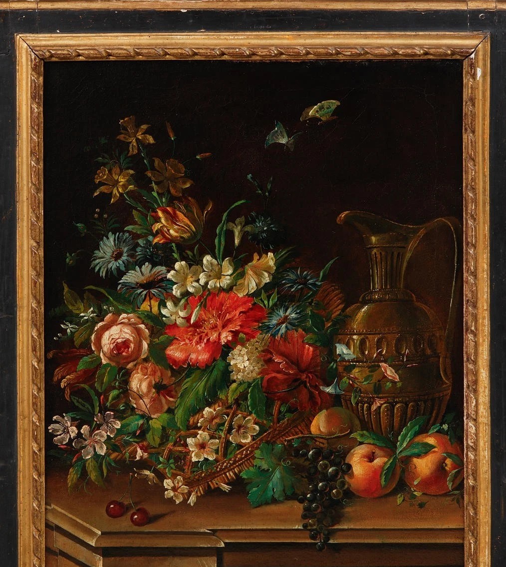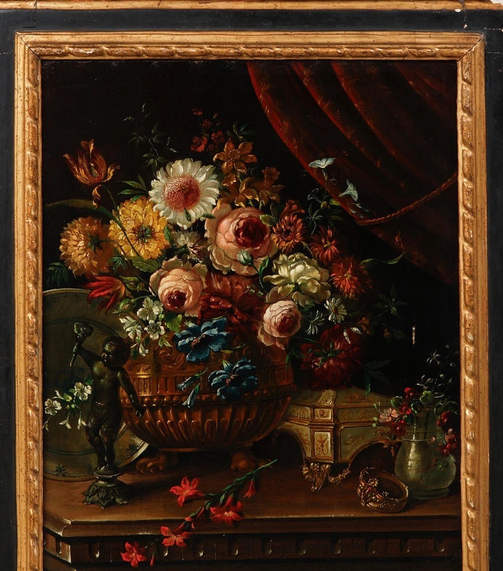 Obraz olejny z XVIII wieku, przedstawiający parę martwych natur z kwiatami. Jest to niderlandzki antyk w stylu barokowym, charakteryzujący się dużymi wymiarami oraz bogatą paletą kolorów.