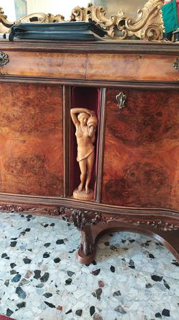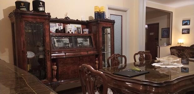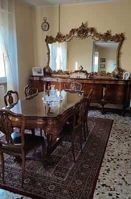 Luksusowa jadalnia w stylu Chippendale na sprzedaż. Meble zostały wyprodukowane w latach 30. XX wieku i wyróżniają się bogatymi zdobieniami oraz imponującymi wykończeniami (kolumny, statuy itp.). Jadalnia składa się z głównej kredensu z dużym złotym lustrem, witryny mostkowej z dwoma witrynami kolumnowymi oraz zintegrowanym barem, z witrażami przedstawiającymi Castel Sant’Angelo w Rzymie. W skład zestawu wchodzi również stół dla 8 osób oraz 8 oryginalnych krzeseł z siedziskami winylowymi.
