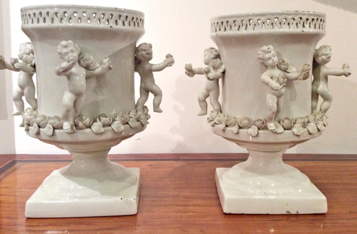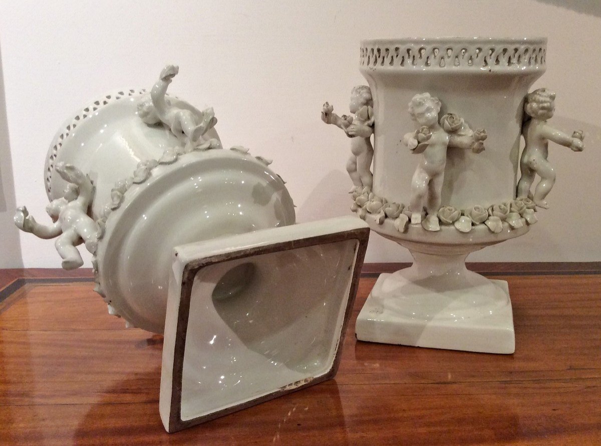 Piękna para wazonów rokoko z porcelany d’Este z XVIII wieku to wyjątkowy przykład kunsztu rzemieślniczego z tego okresu. Wykonane z najwyższej jakości porcelany, wazy zachwycają finezyjnymi kształtami i bogatymi zdobieniami typowymi dla stylu rokoko. Ich elegancki design sprawia, że stanowią wspaniałą ozdobę każdego wnętrza.