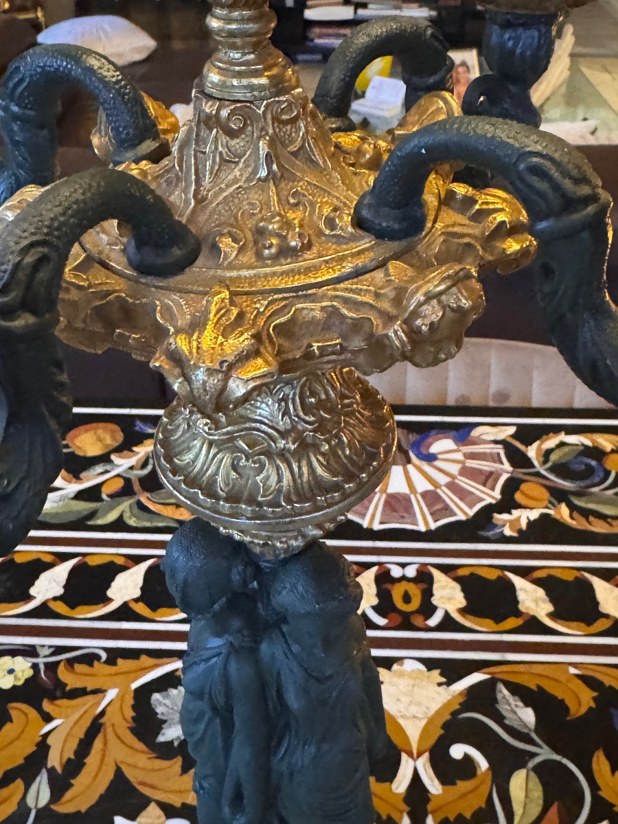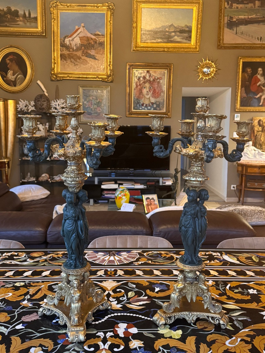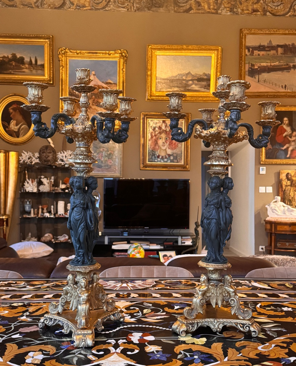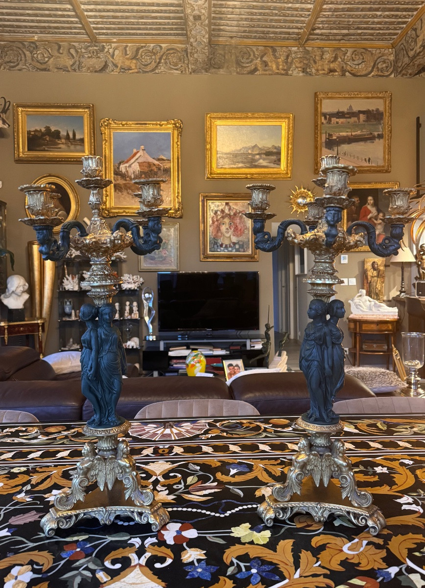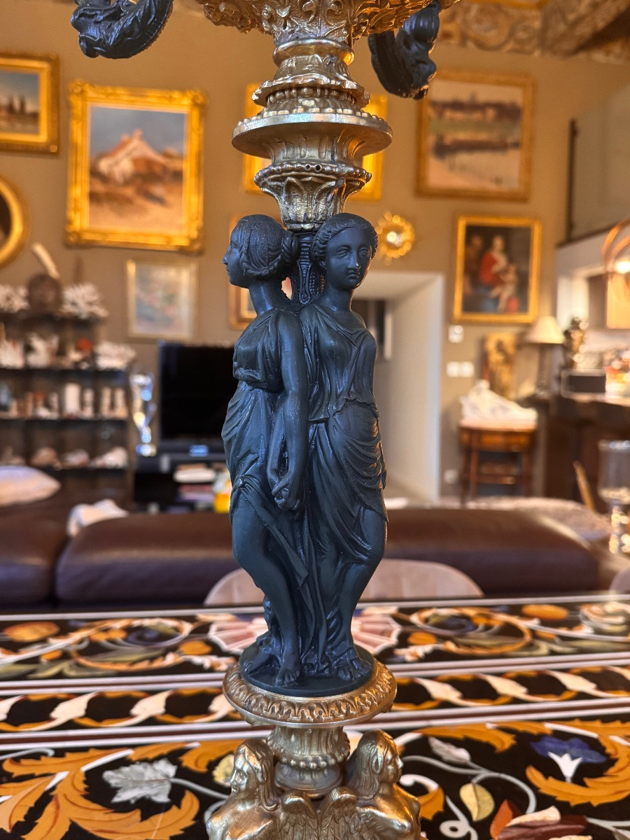 Para dużych świeczników z Trzema Gracjami, pozłacany brąz oraz patynowany stop – okres napoleoński. Wysokość: 64cm