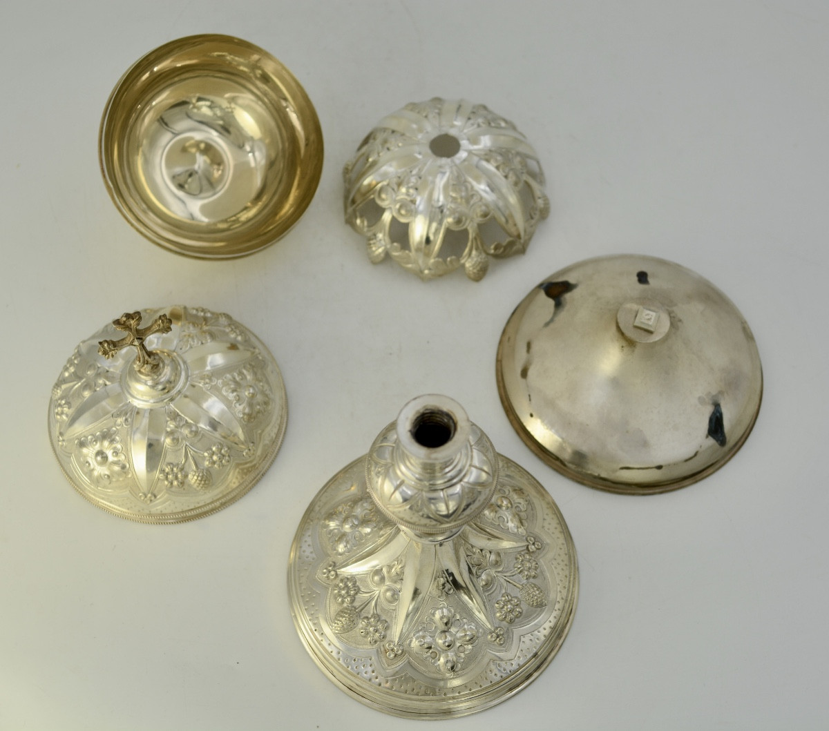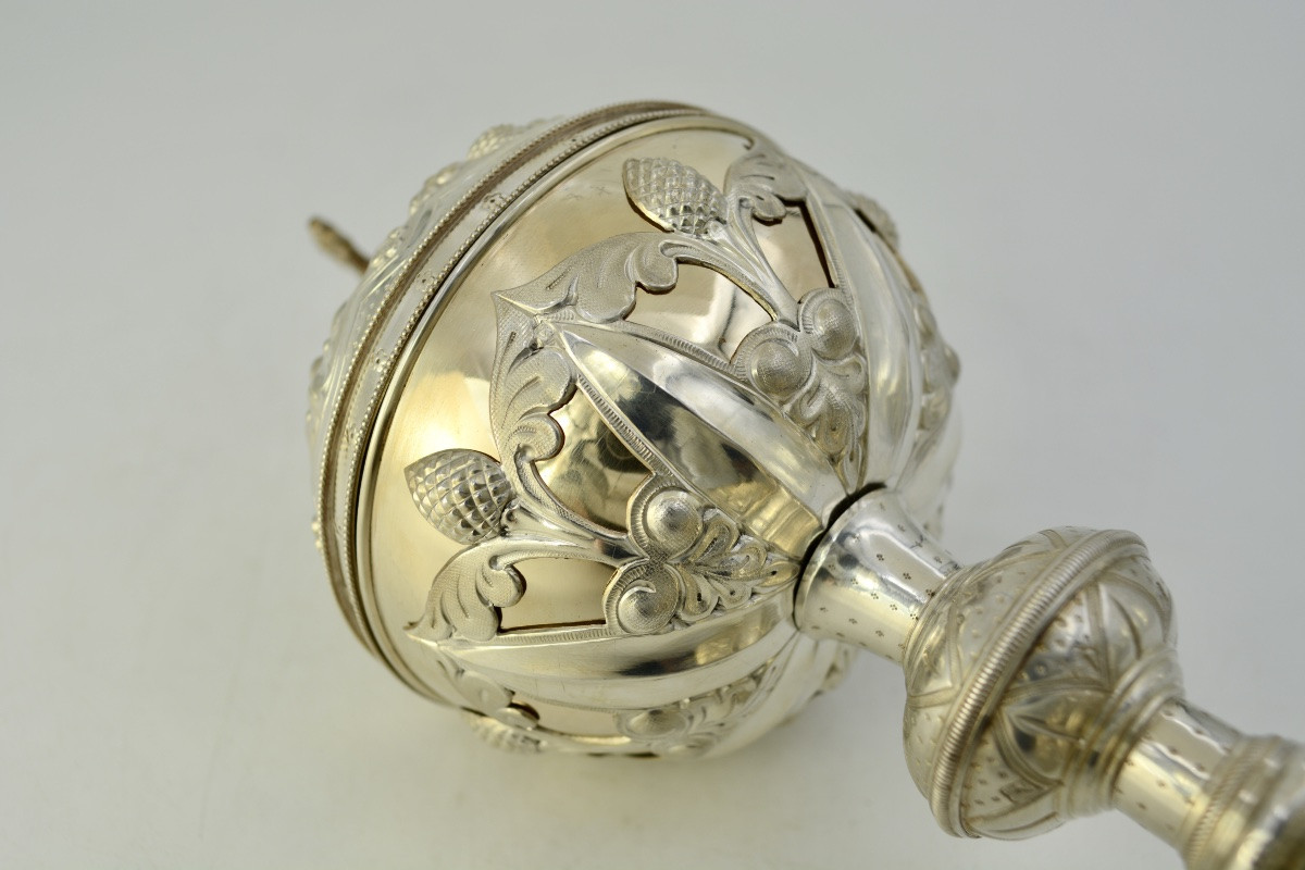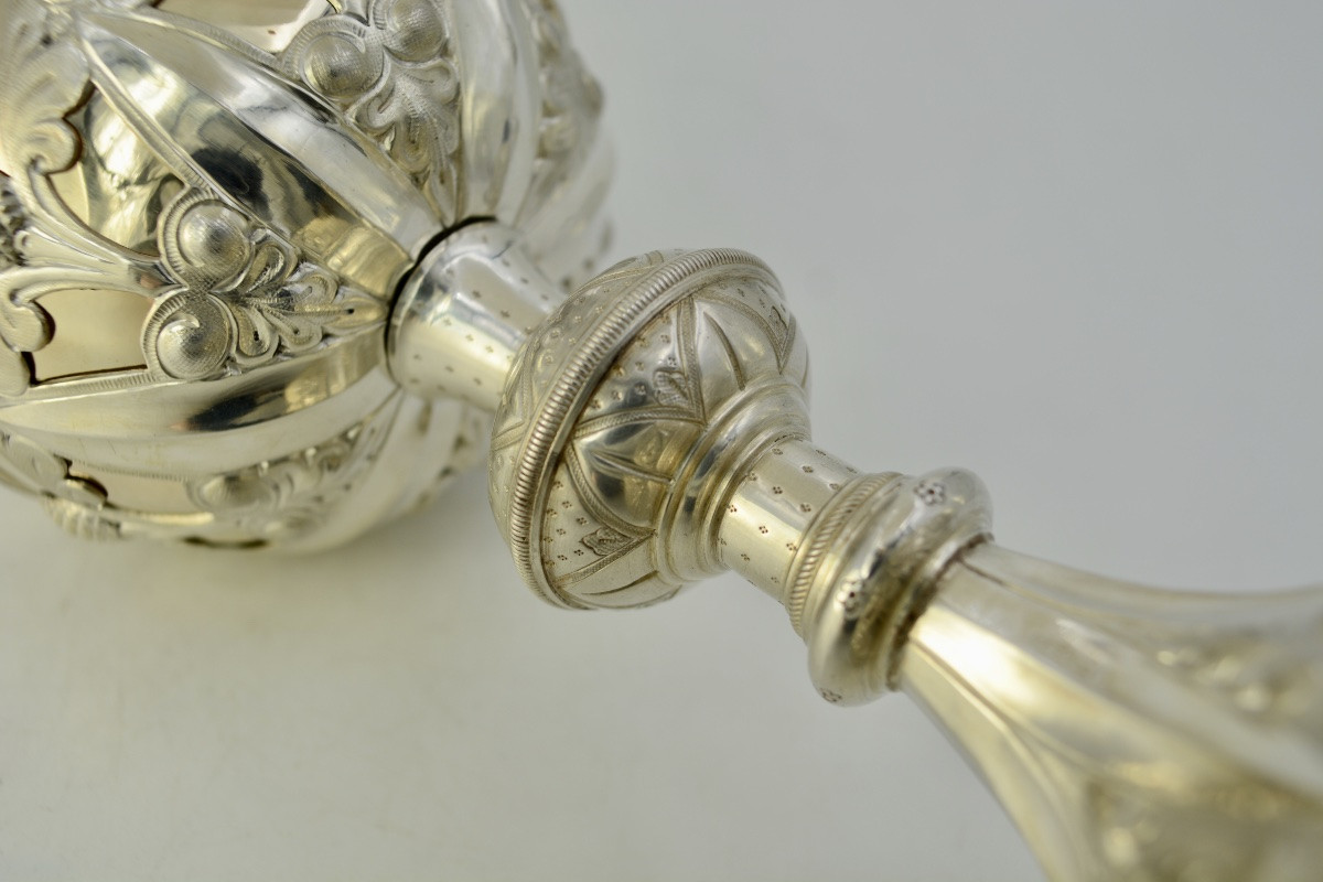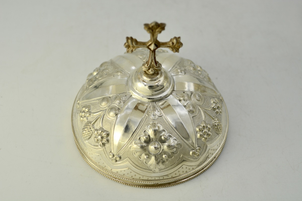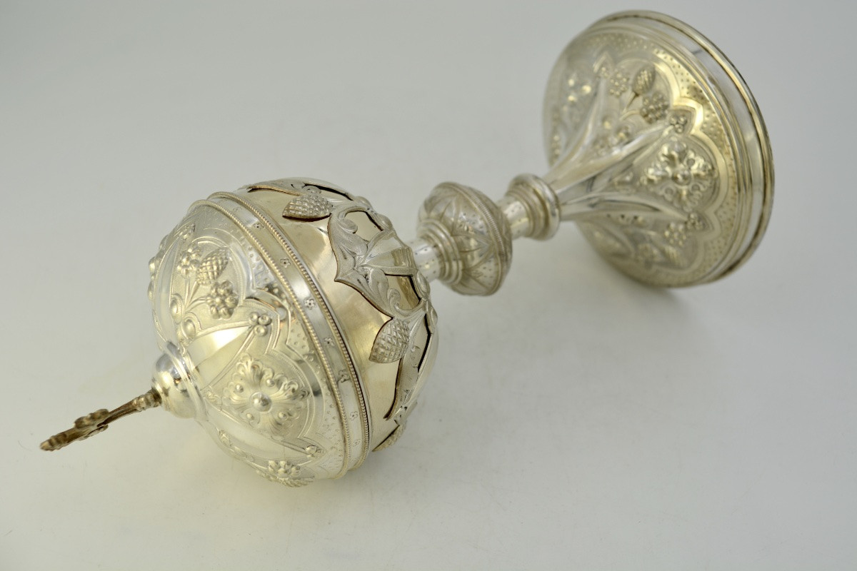 Srebrne ciborium pochodzące z Francji, datowane na koniec XIX wieku, zachwyca elegancją i kunsztem wykonania. Zostało starannie wyrzeźbione i zdobione, co podkreśla jego liturgiczne znaczenie oraz estetyczny walor. Ciborium, jako naczynie liturgiczne, służy do przechowywania konsekrowanej Hosts, co czyni je nie tylko przedmiotem kultu, ale także dziełem sztuki.