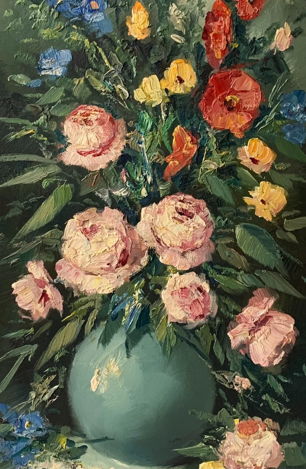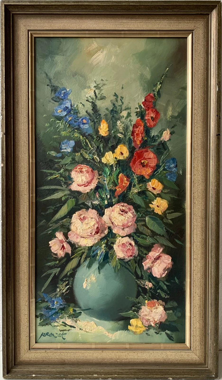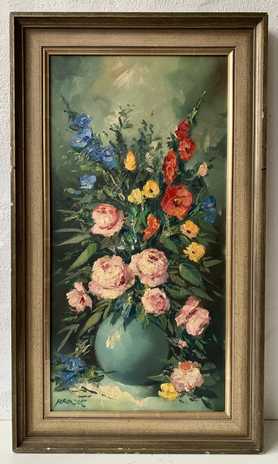 Obraz olejny przedstawiający impresjonistyczne kwiaty, w tym róże, w technice martwej natury. Praca ma nieczytelny podpis i wymiary 94 x 54,3 cm.