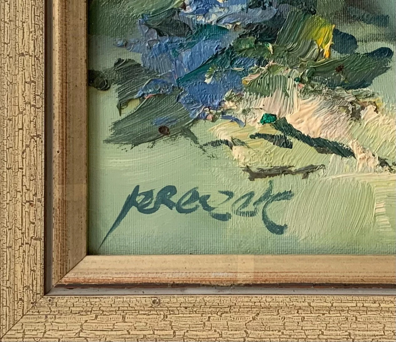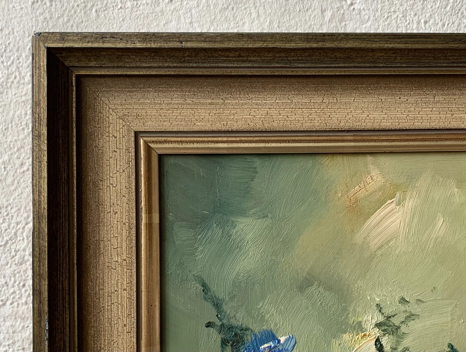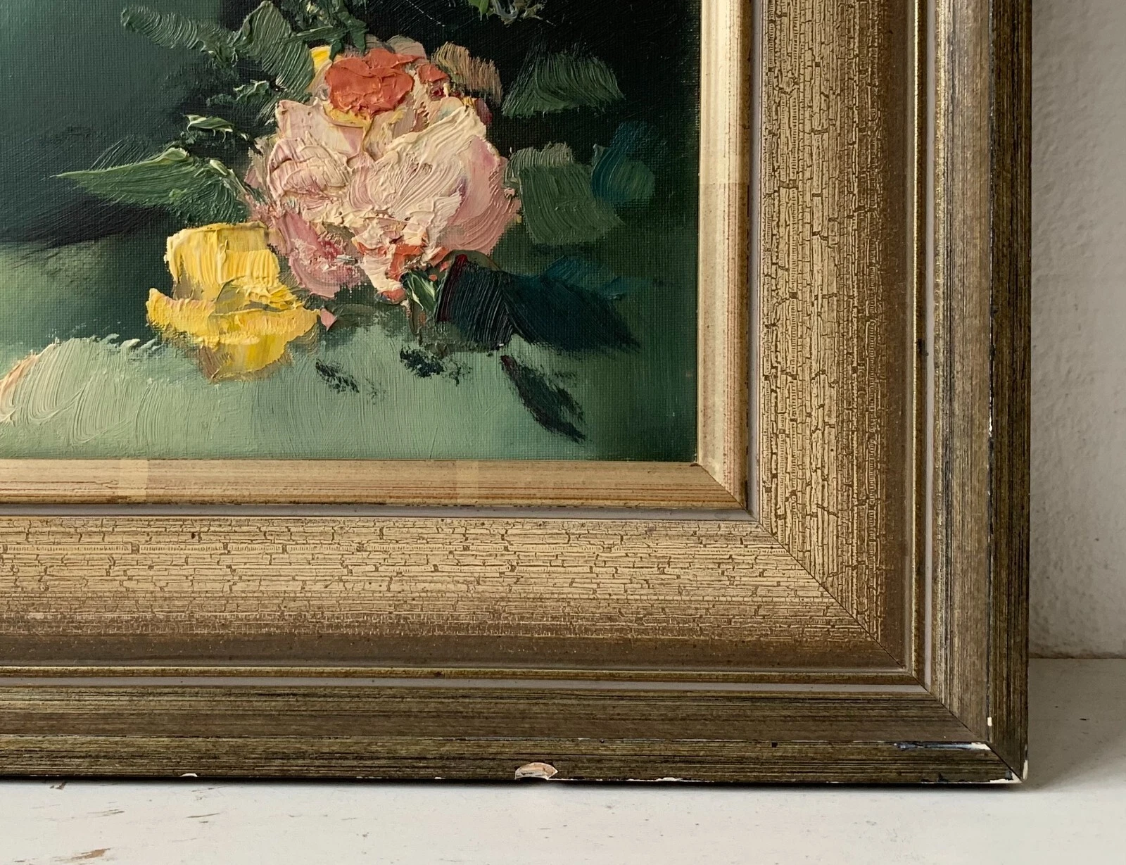 Obraz olejny przedstawiający impresjonistyczne kwiaty, w tym róże, w technice martwej natury. Praca ma nieczytelny podpis i wymiary 94 x 54,3 cm.