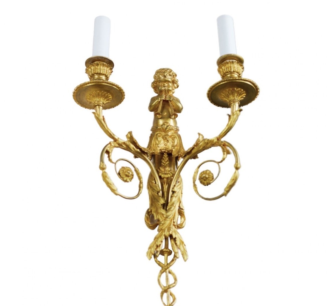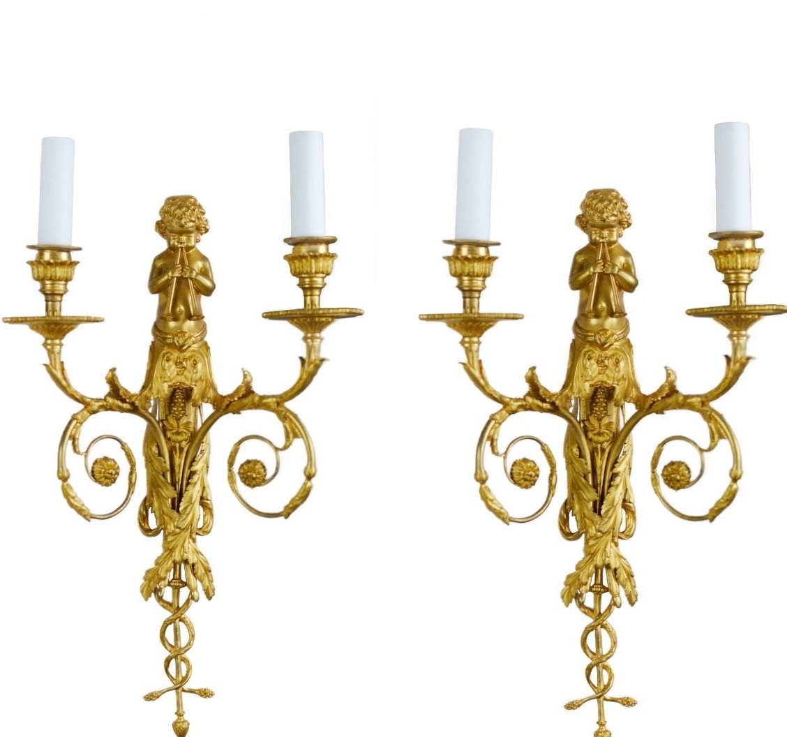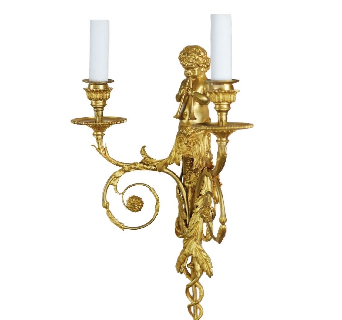 Para francuskich złoconych świeczników ściennych w stylu Ludwika XVI z XIX wieku. Wykonane z brązu, w dobrym stanie. Dostępne w magazynie.