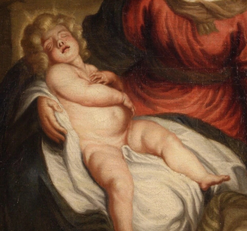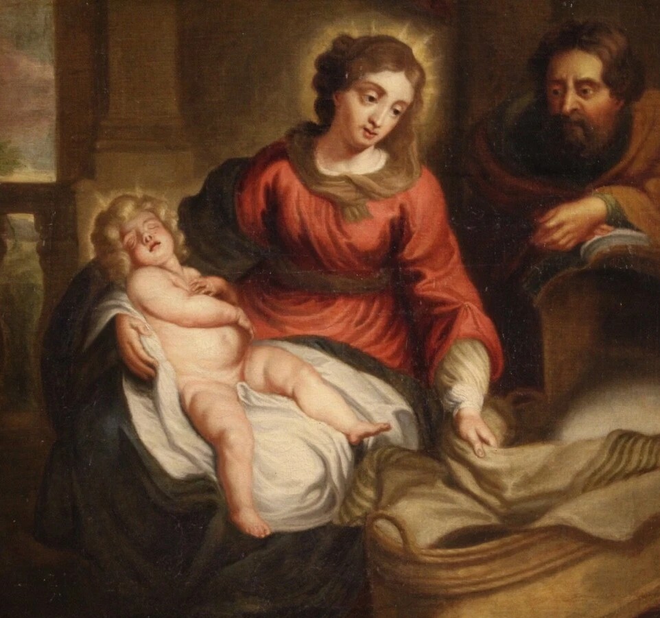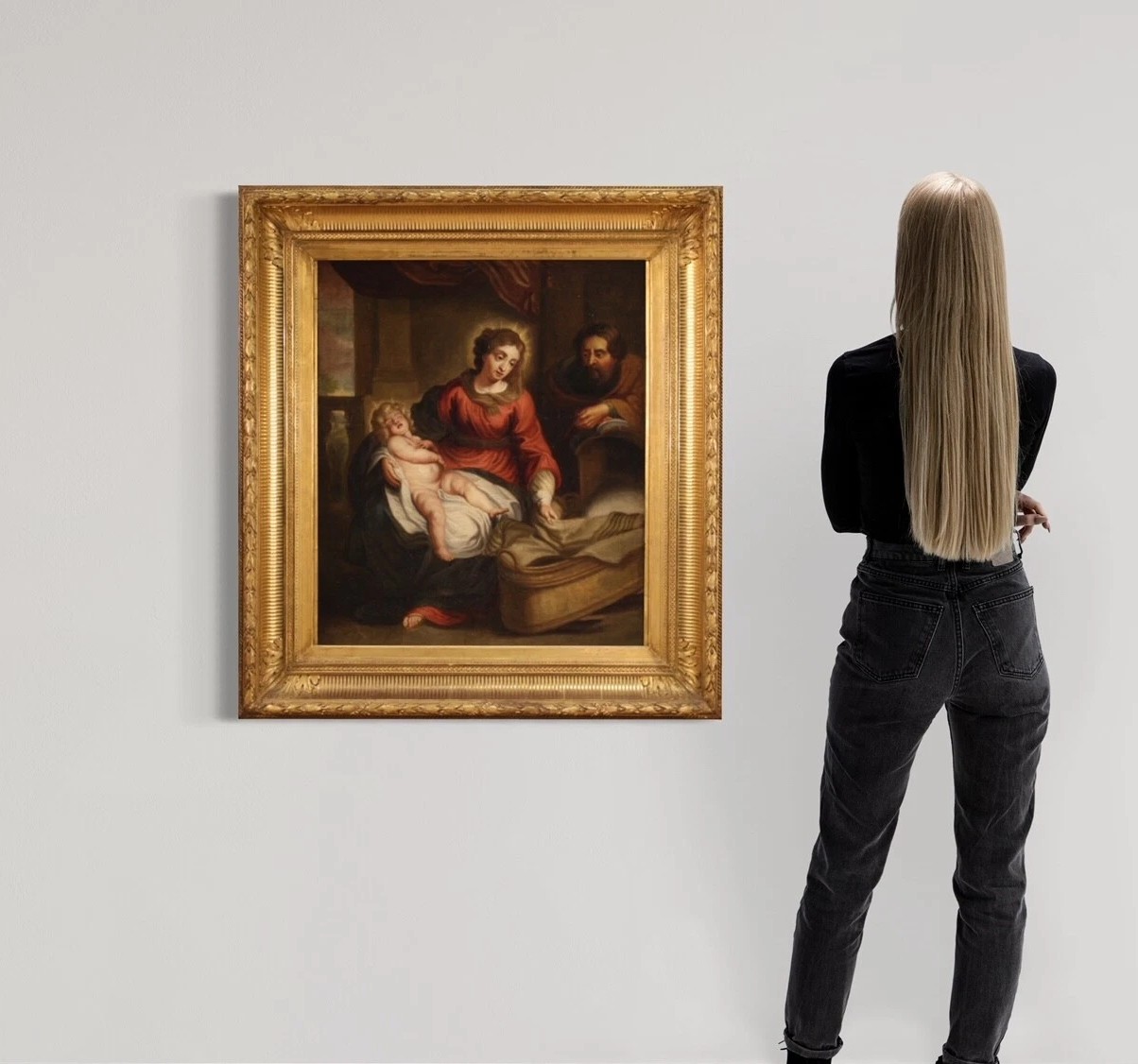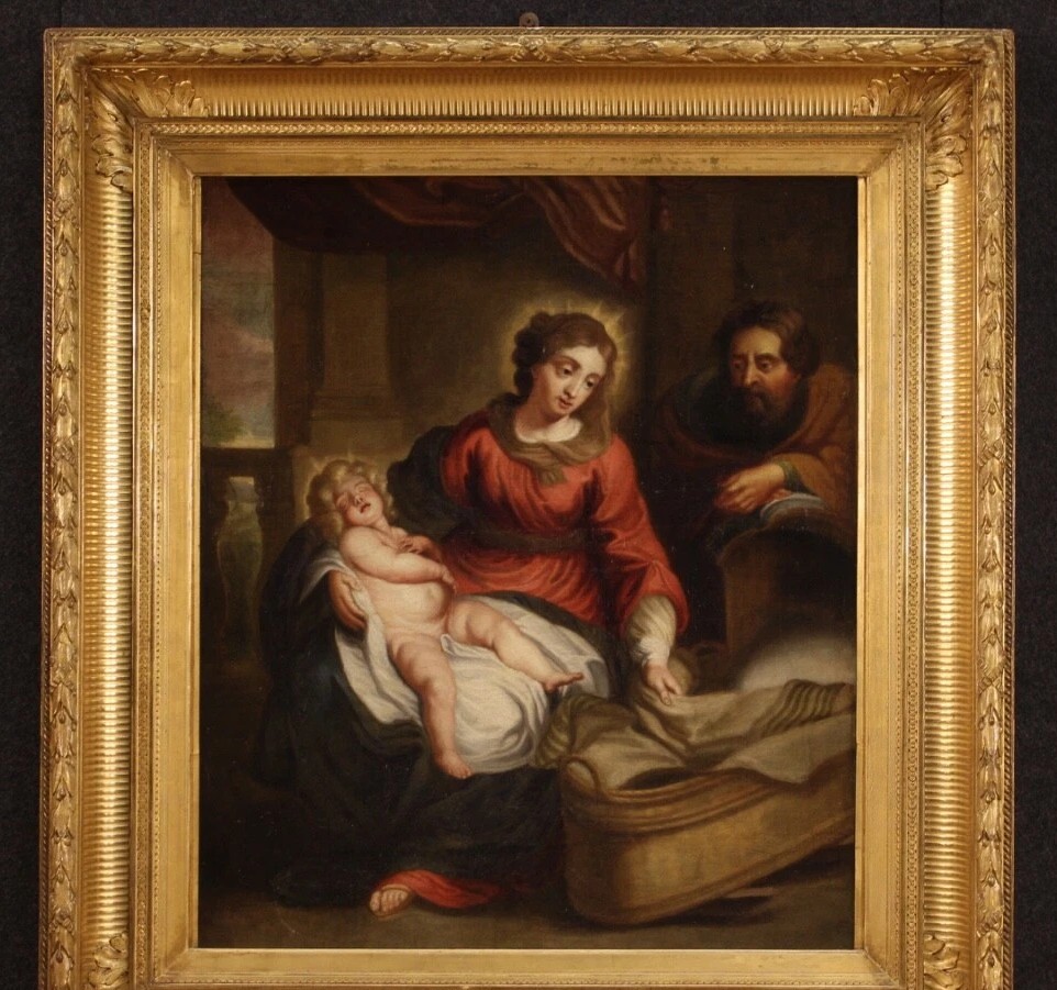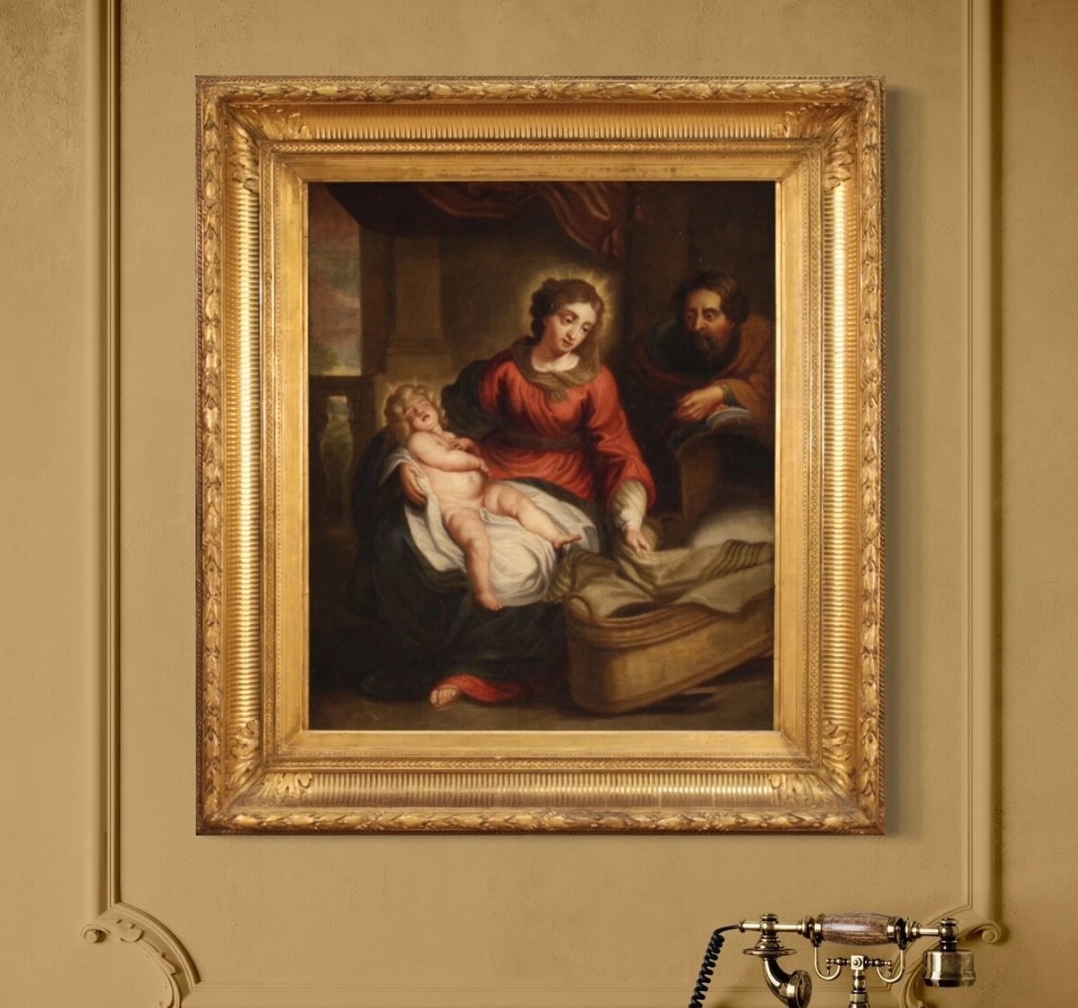 Święty obraz rodziny, olej na płótnie, reprezentujący religijną tematykę z XVIII wieku. Dzieło jest przykładem antycznej sztuki, charakteryzującej się bogatymi detalami i głębokim przesłaniem duchowym.