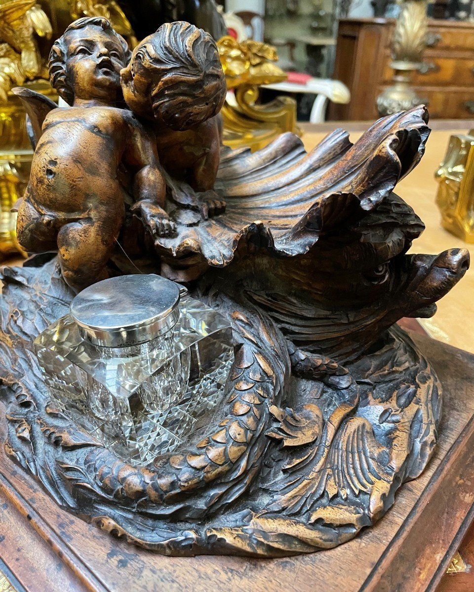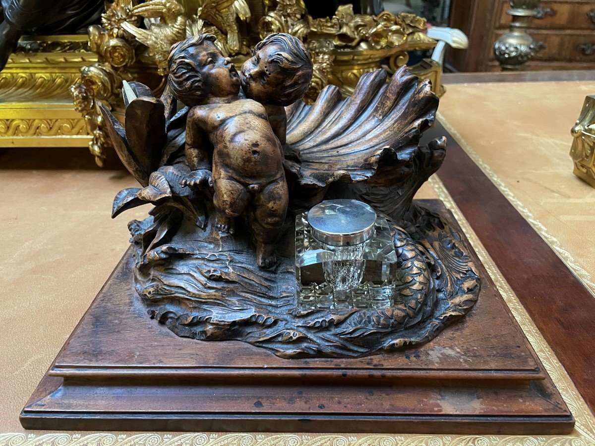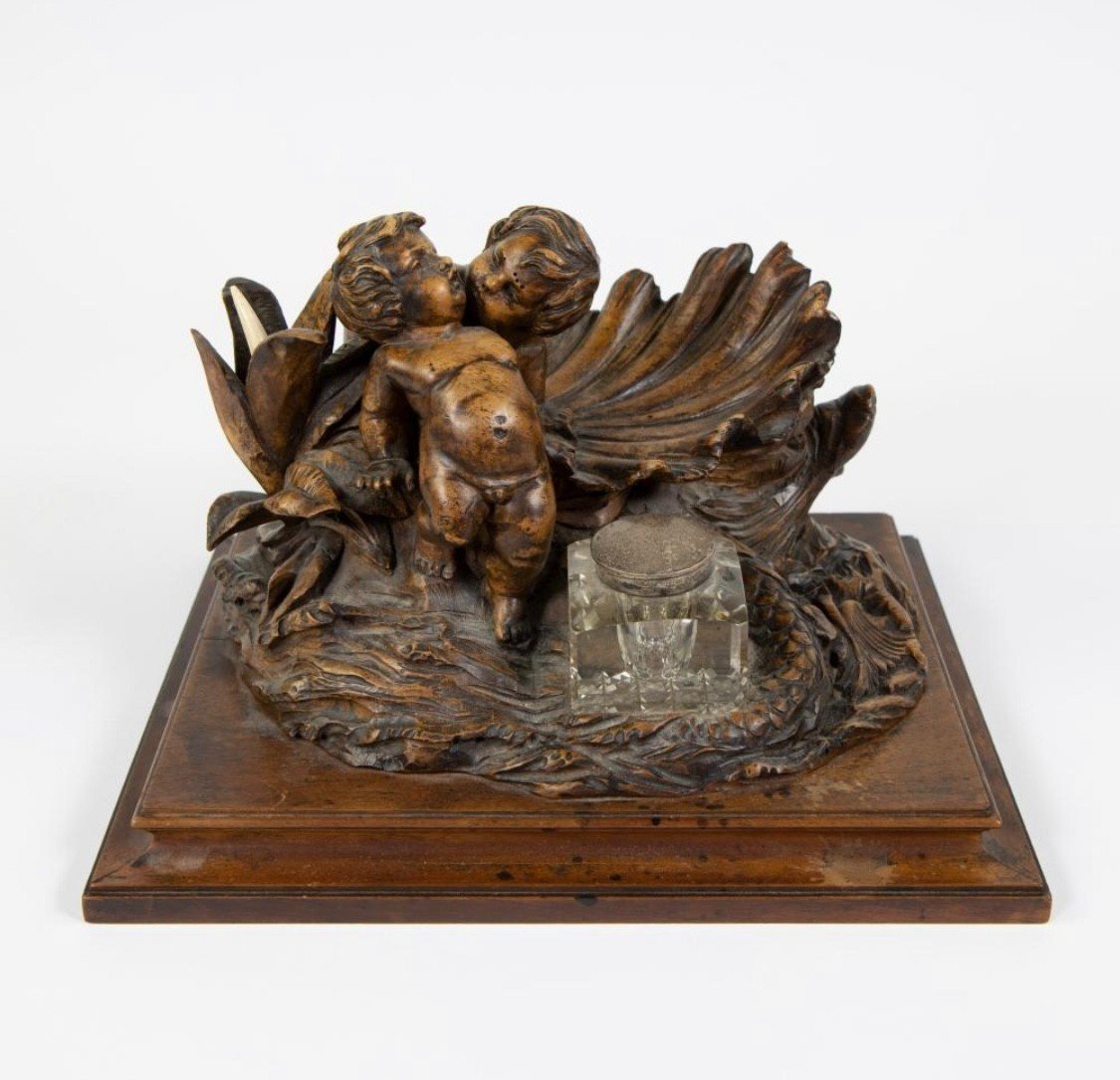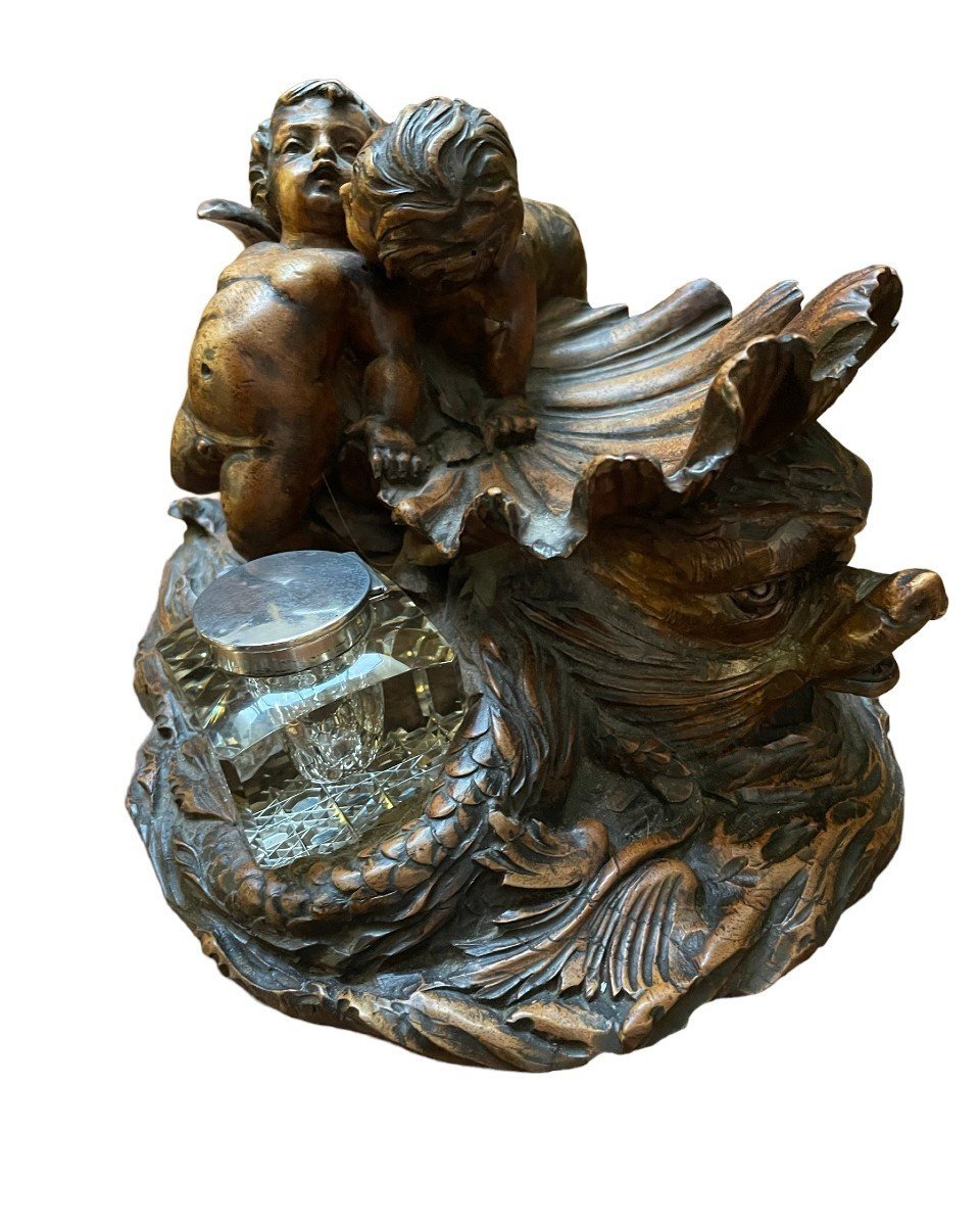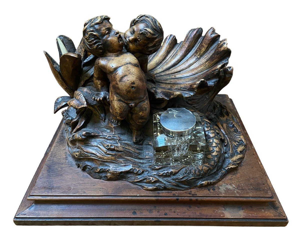 K28 Piękny kałamarz „2 Putti z rybą” w orzechu, XIX wiek.