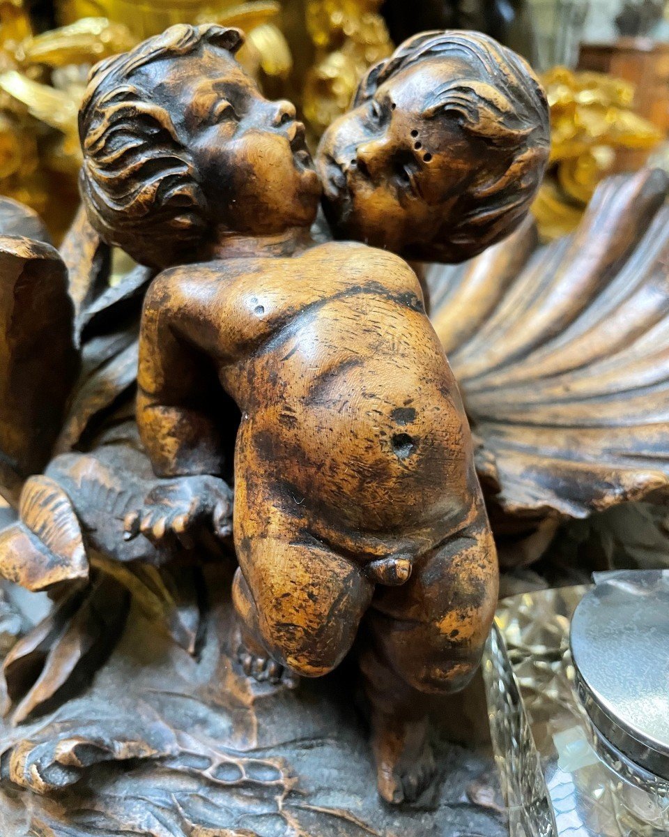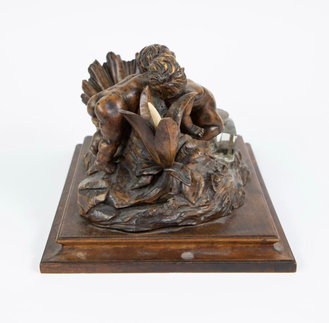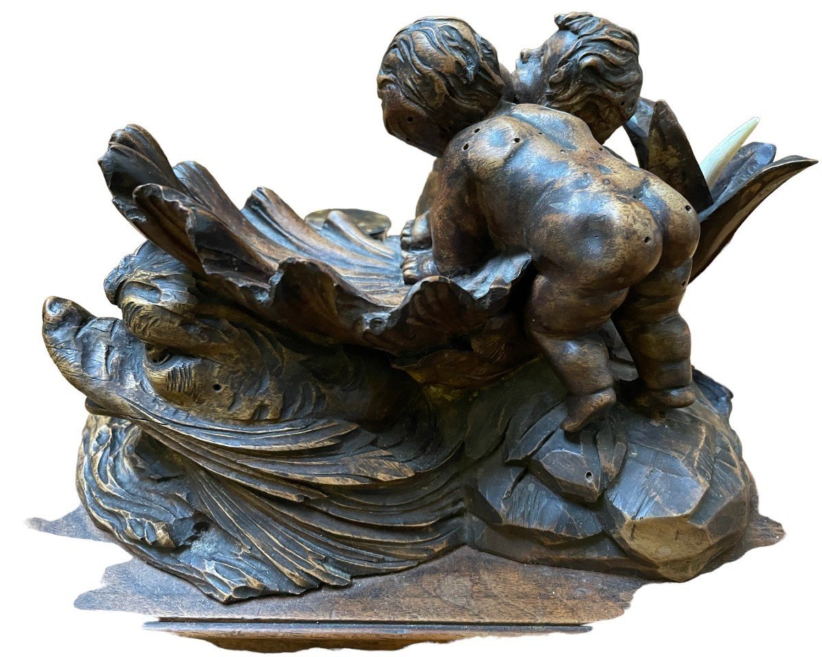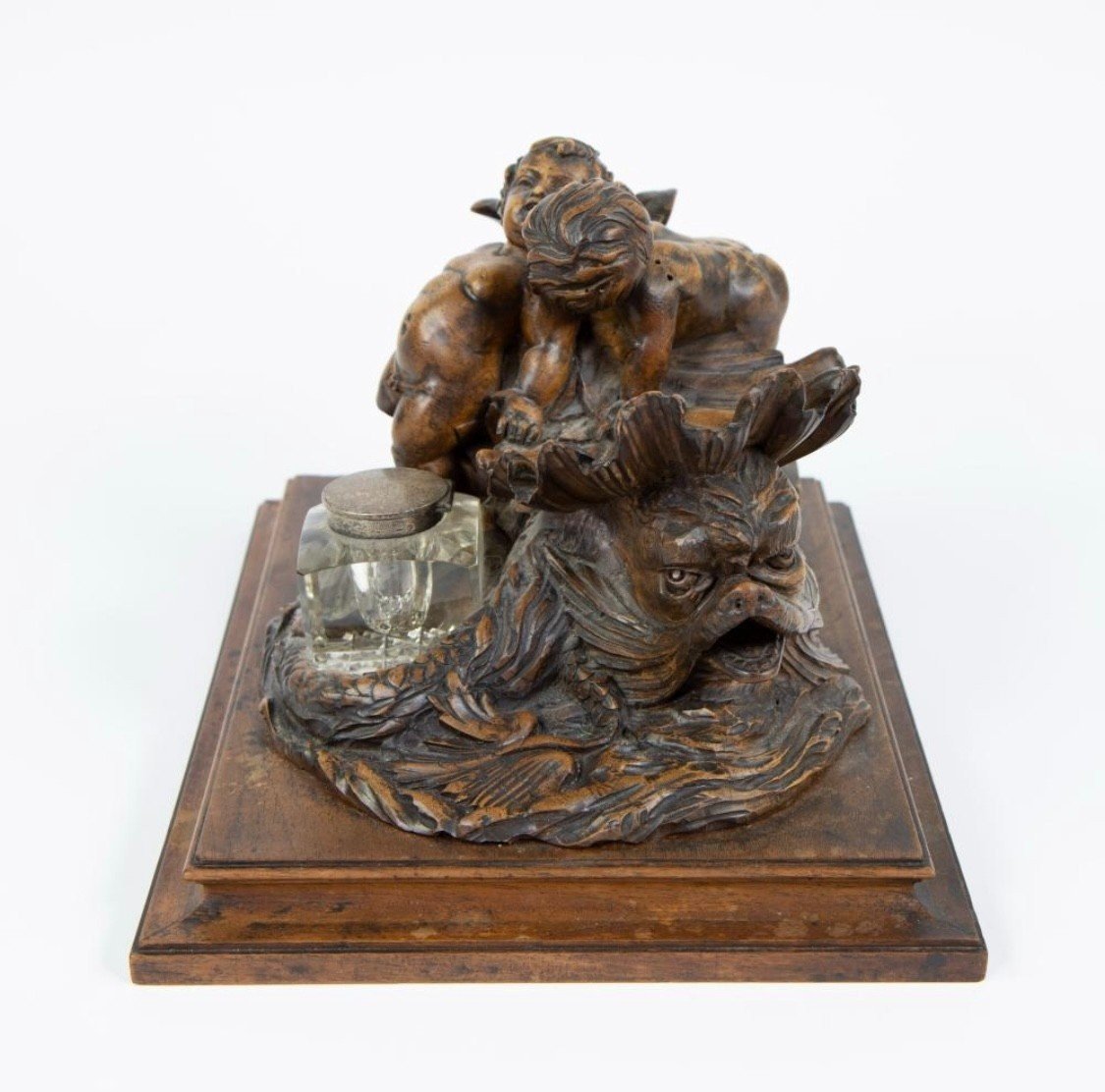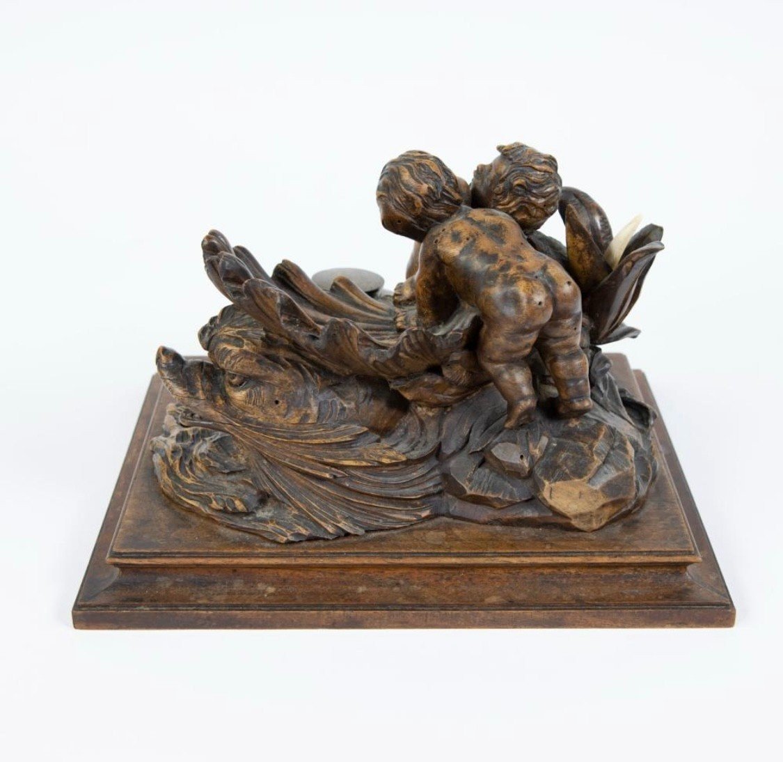 K28 Piękny kałamarz „2 Putti z rybą” w orzechu, XIX wiek.