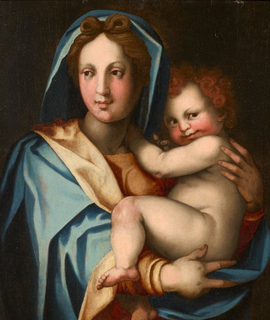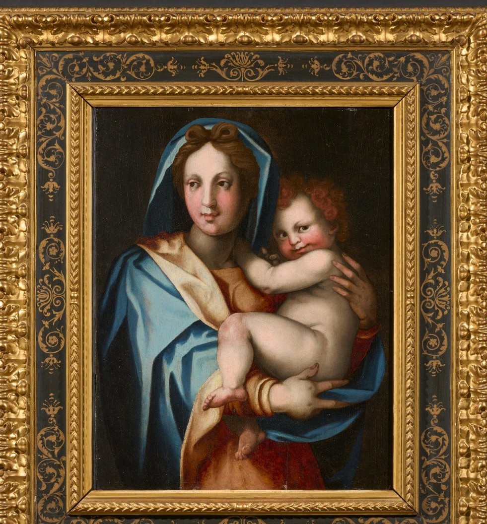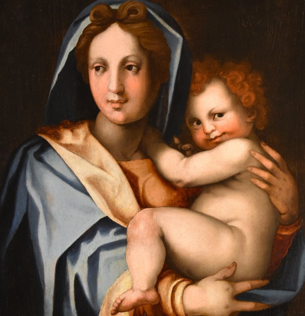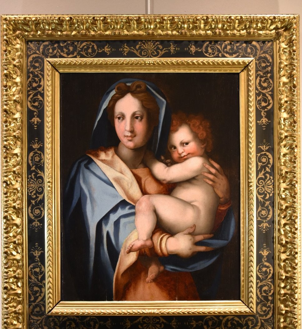 Madonna z Dzieciątkiem z XVI wieku, w stylu renesansowym i w stylu Ludwika XIII. Obraz olejny na drewnie, w doskonałym stanie. Wymiary: 94 cm szerokości, 109 cm wysokości (w ramie).