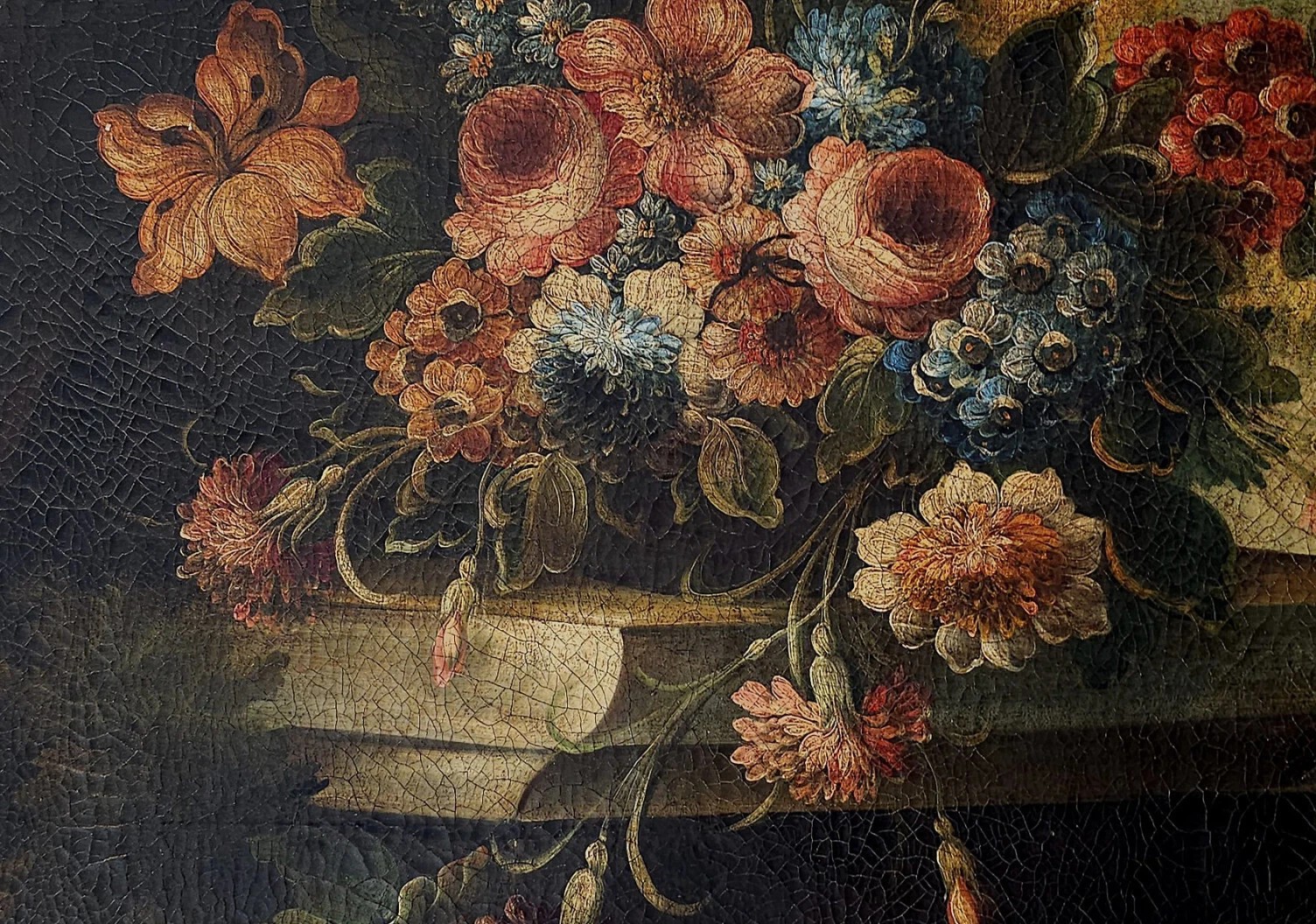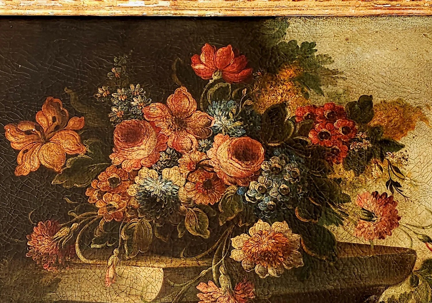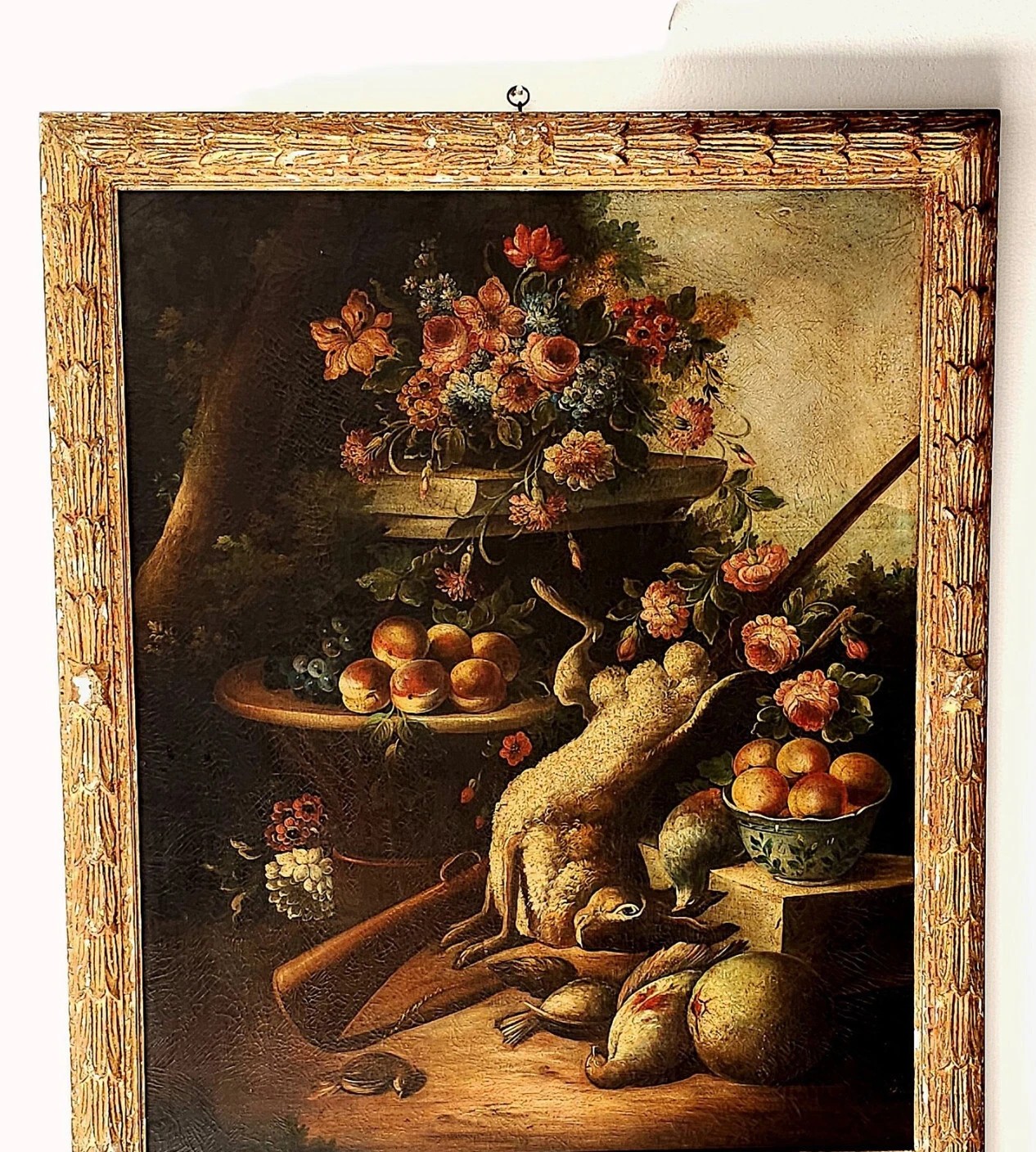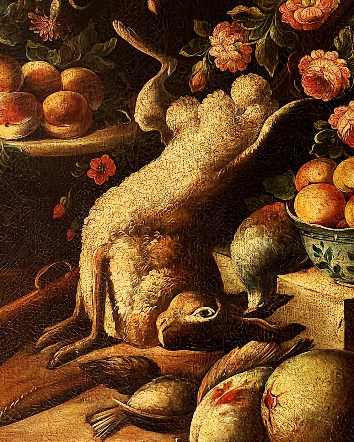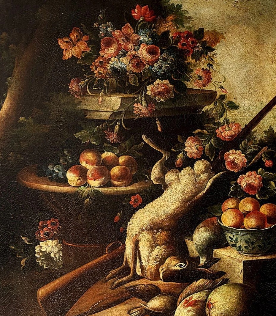 Martwa natura z owocami, kwiatami i dziczyzną przedstawia harmonijną kompozycję naturalnych elementów. W obrazie uwagę przyciągają soczyste owoce, które symbolizują obfitość i płodność, oraz piękne kwiaty, dodające świeżości i kolorów. Elementy dziczyzny wnoszą do dzieła pierwotny charakter, podkreślając bliskość człowieka do natury. Całość tworzy zrównoważoną scenę, zachęcającą do refleksji nad pięknem i różnorodnością przyrody.