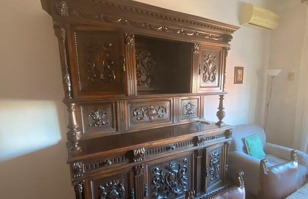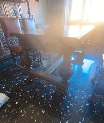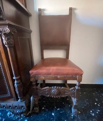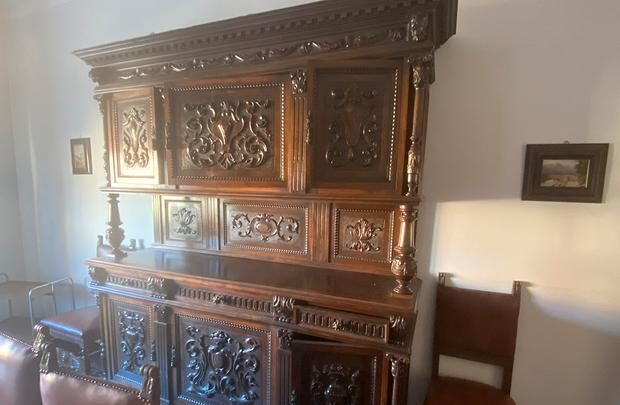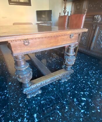 Wspaniała sala obrad notarialnych z litego drewna z początku XX wieku w stylu neorenesansowym, składająca się z: rozsuwanego stołu z dwóch stron, dwóch bufetów, sześciu krzeseł z drewna i skóry oraz nóg w kształcie cebuli.