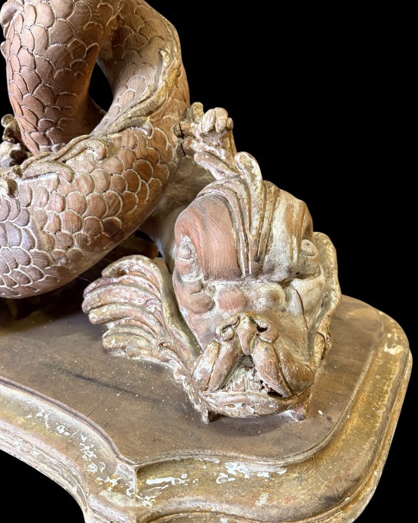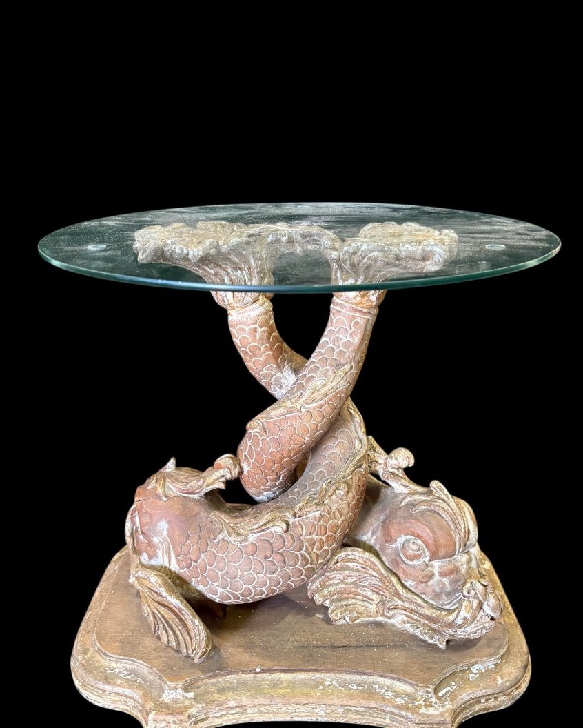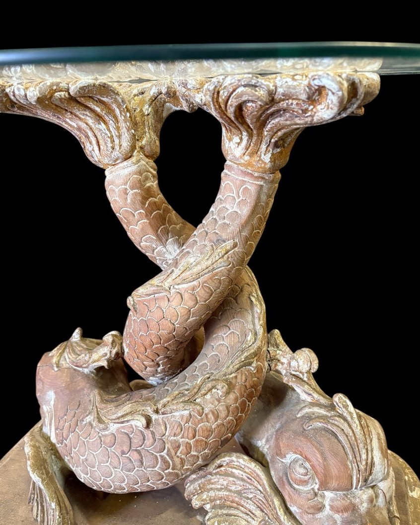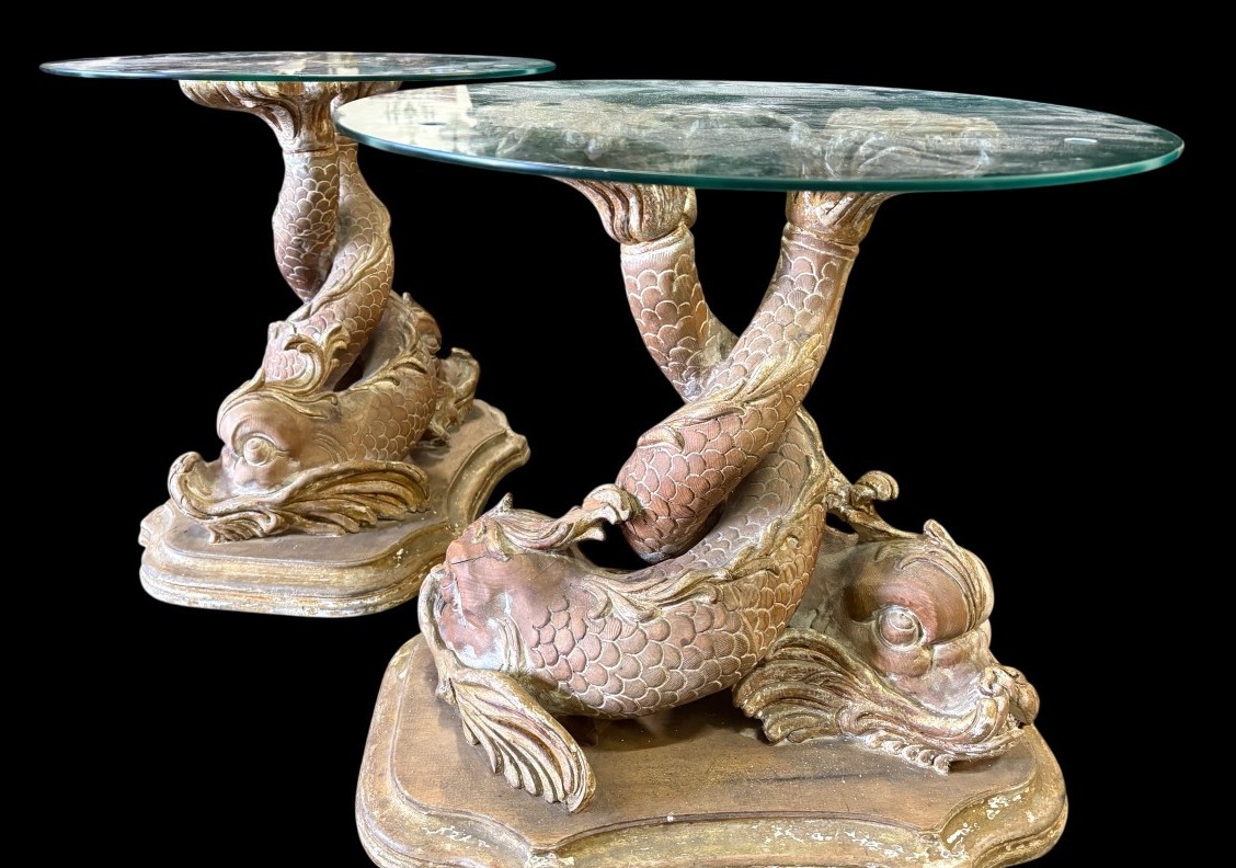Para „mitologicznych ryb” stolików kawowych wykonanych z drewna, pochodzących z końca XIX wieku. Te unikalne meble łączą w sobie artystyczne rzemiosło oraz inspiracje mitologiczne, nadając wnętrzom niepowtarzalny charakter.