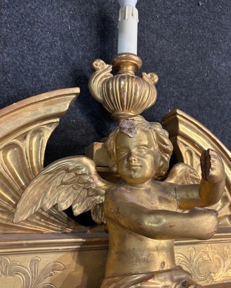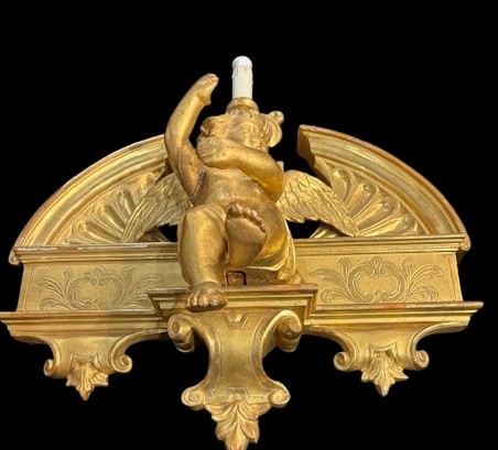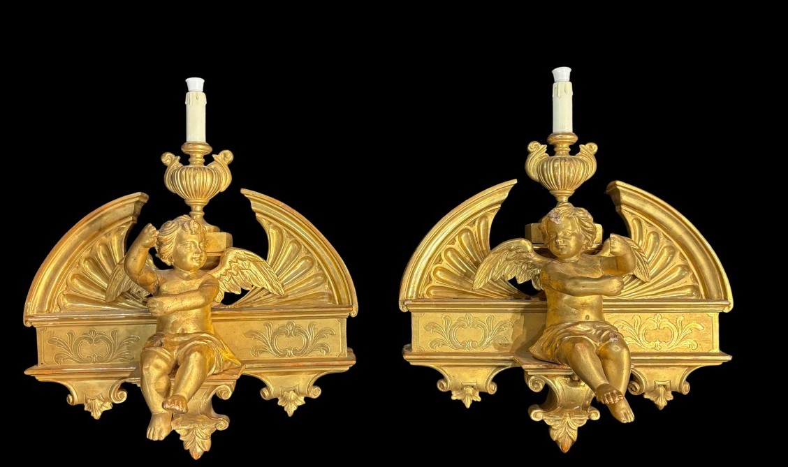 Para rzeźb przedstawiających anioły wykonana w XIX wieku, w stylu Louis Philippe oraz Charlesa X. Rzeźby są z pozłacanego drewna. Wymiary: szerokość 50 cm, wysokość 50 cm, głębokość 25 cm.
