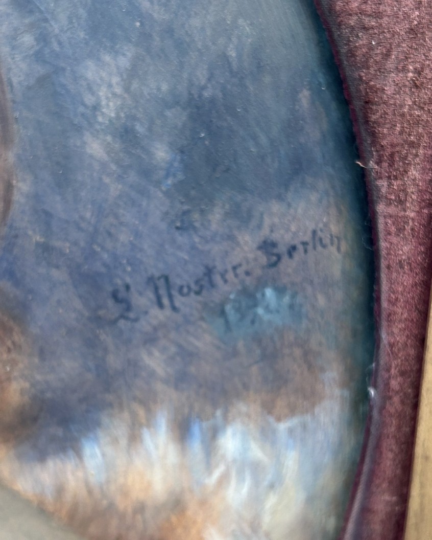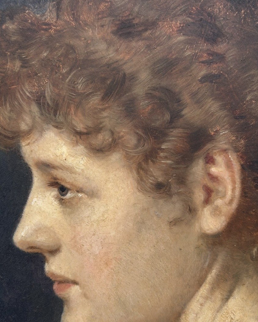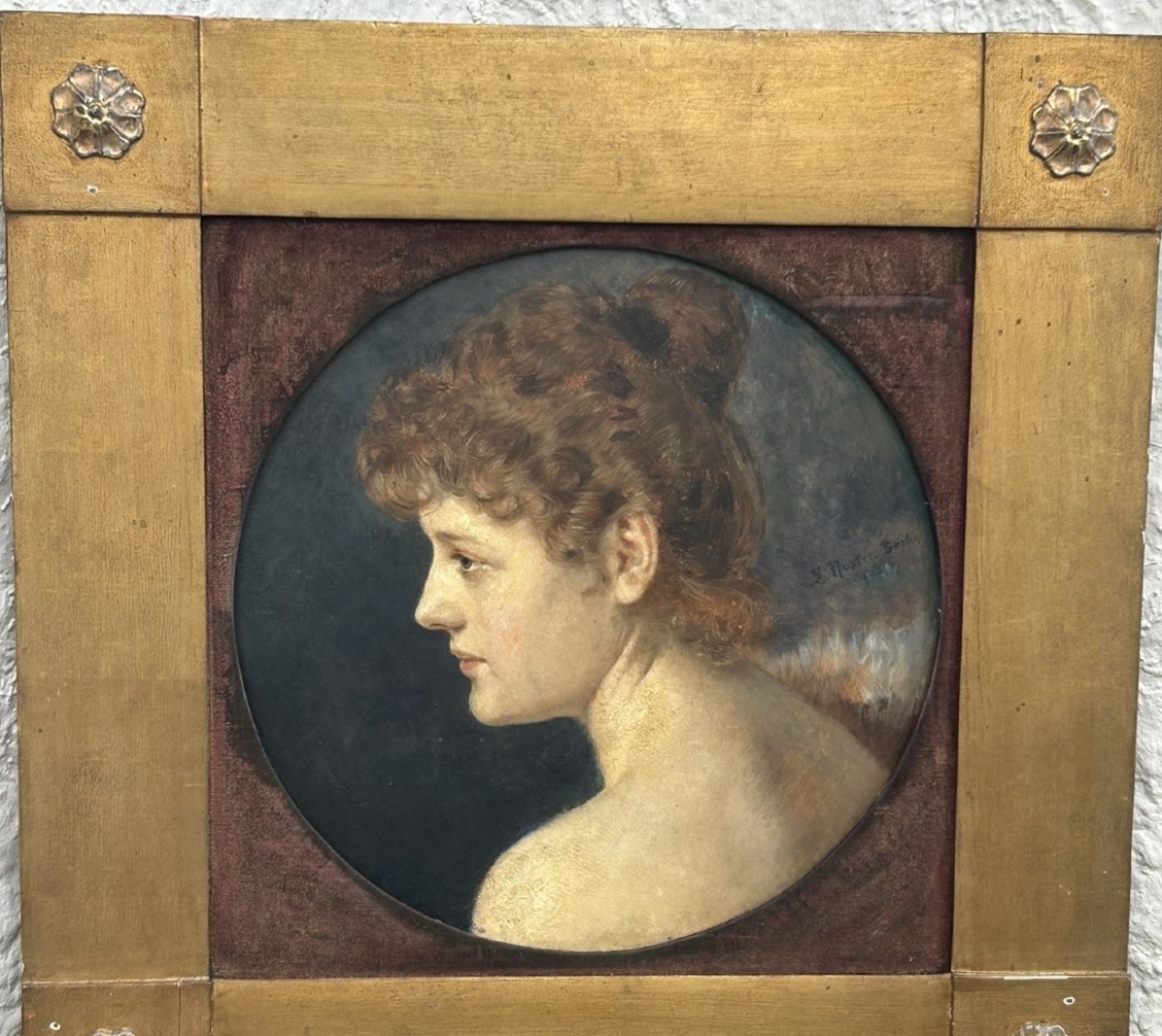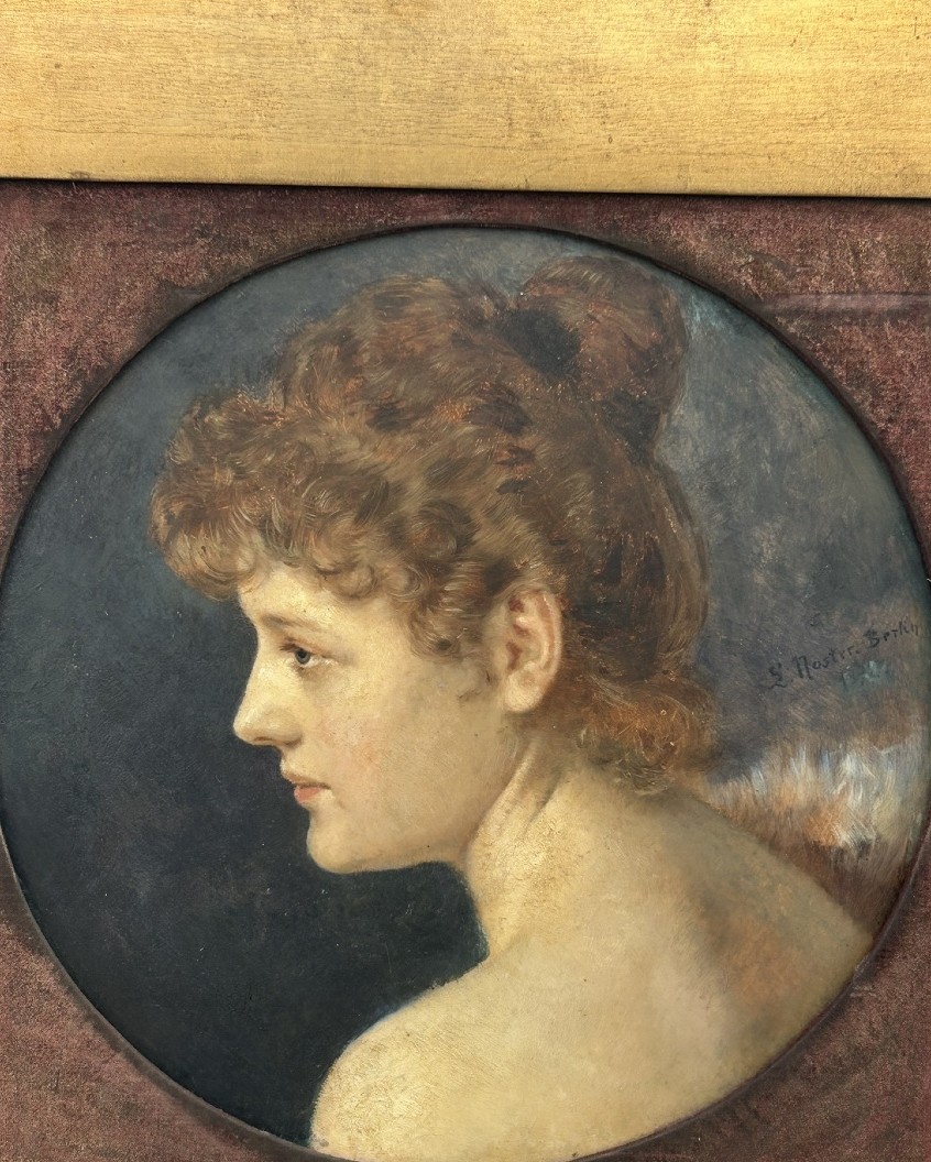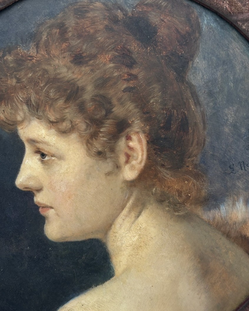 Portret kobiety w profilu, obraz na drewnie, sygnowany i datowany 1892. Wykonany w stylu secesyjnym, z XIX wieku. Obraz jest w dobrym stanie, namalowany farbą olejną na drewnie. Wymiary: 61 cm x 61 cm.