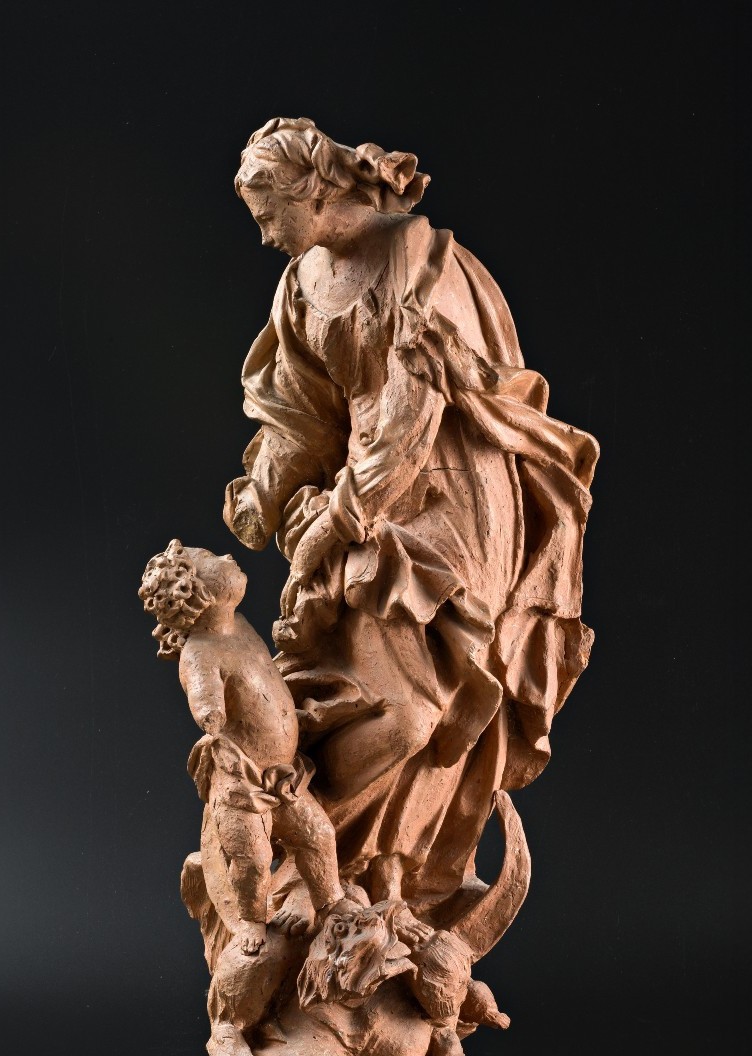 Szkoła lombardzka XVIII wieku, Nasza Pani Pomocy. Okres: XVIII wiek. Styl: Ludwika XVI, Dyrektorat. Stan: Dobry. Materiał: Terrakota. Wysokość: 68 cm. Referencja (ID): 1725621. Dostępność: W magazynie.