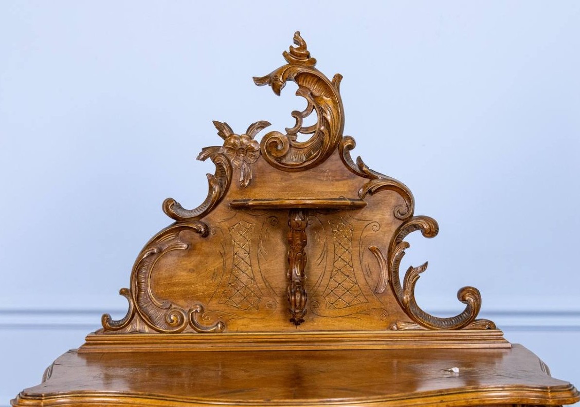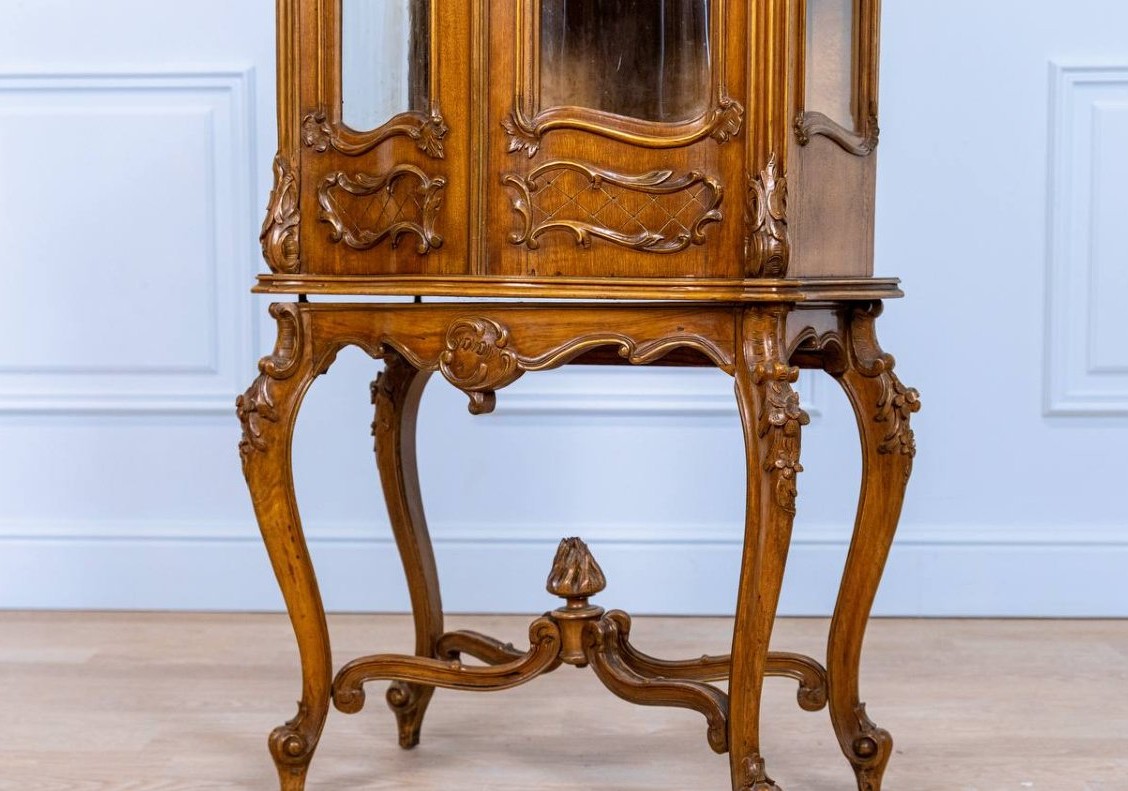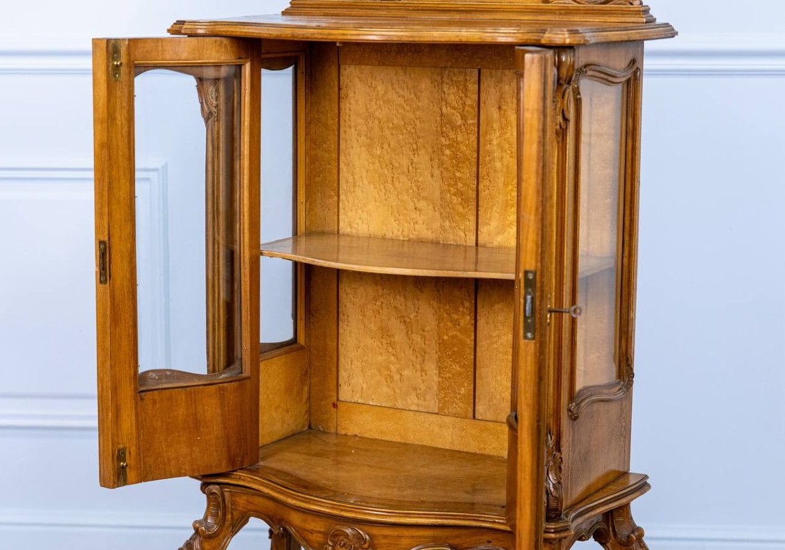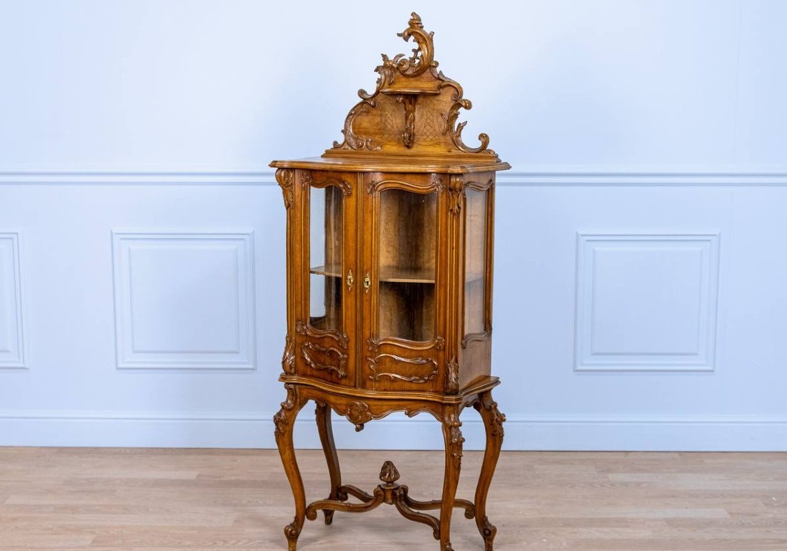 Gablotka w stylu rokoko z XIX wieku, wykonana z solidnego drewna. W dobrym stanie.