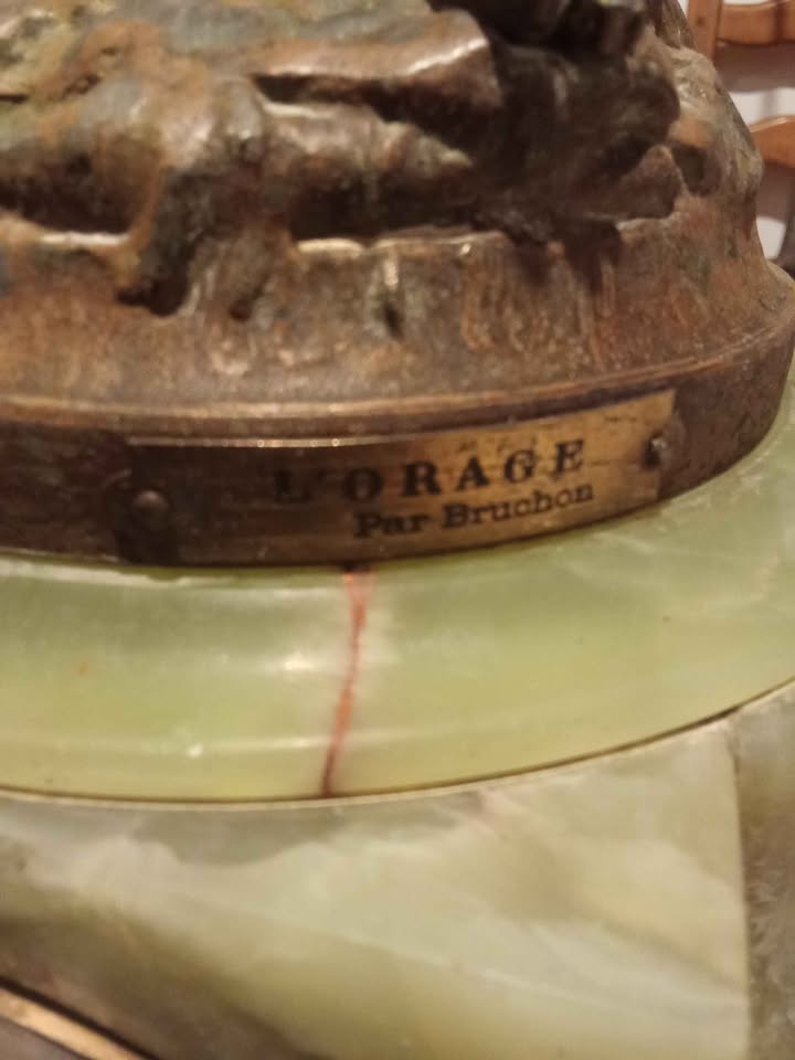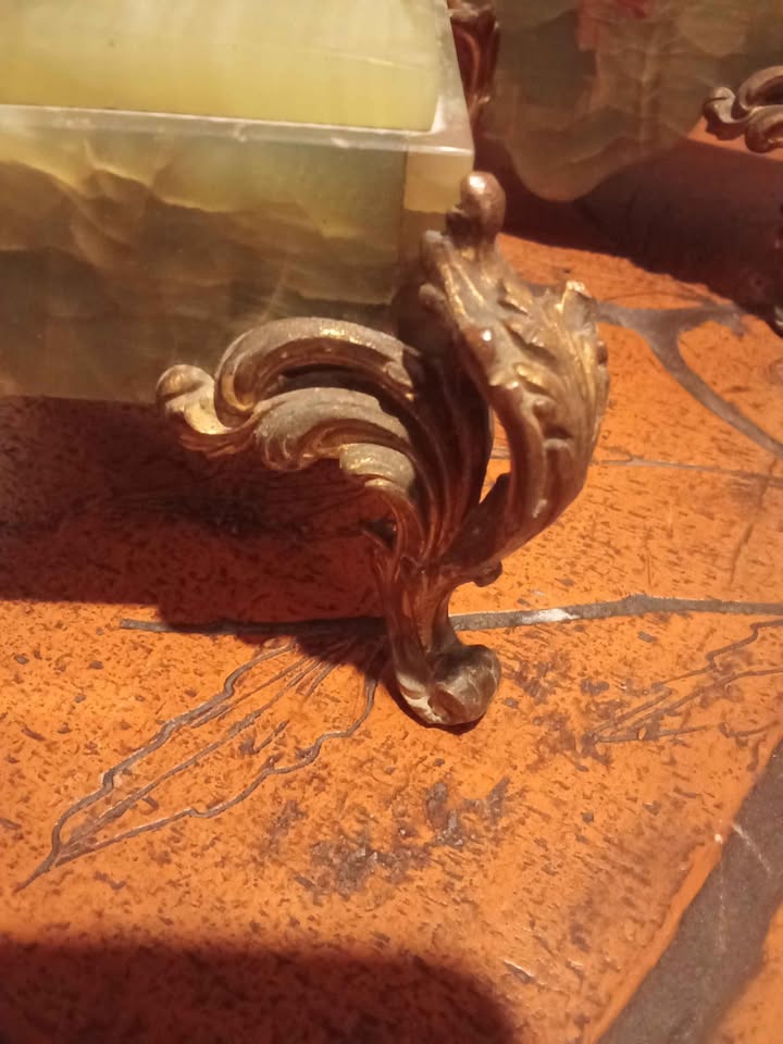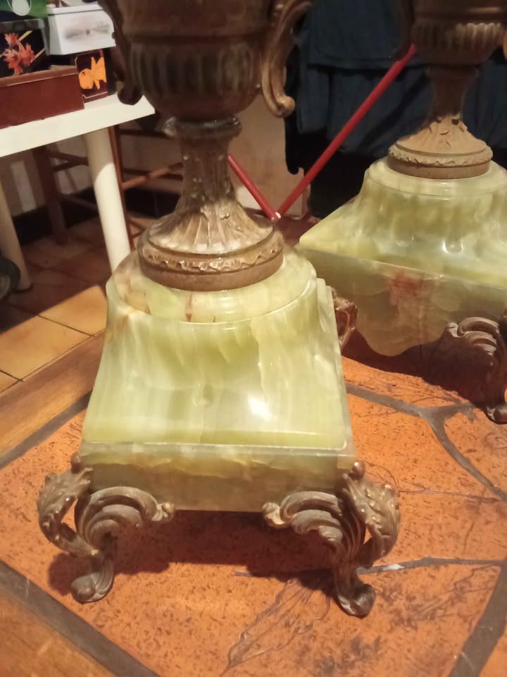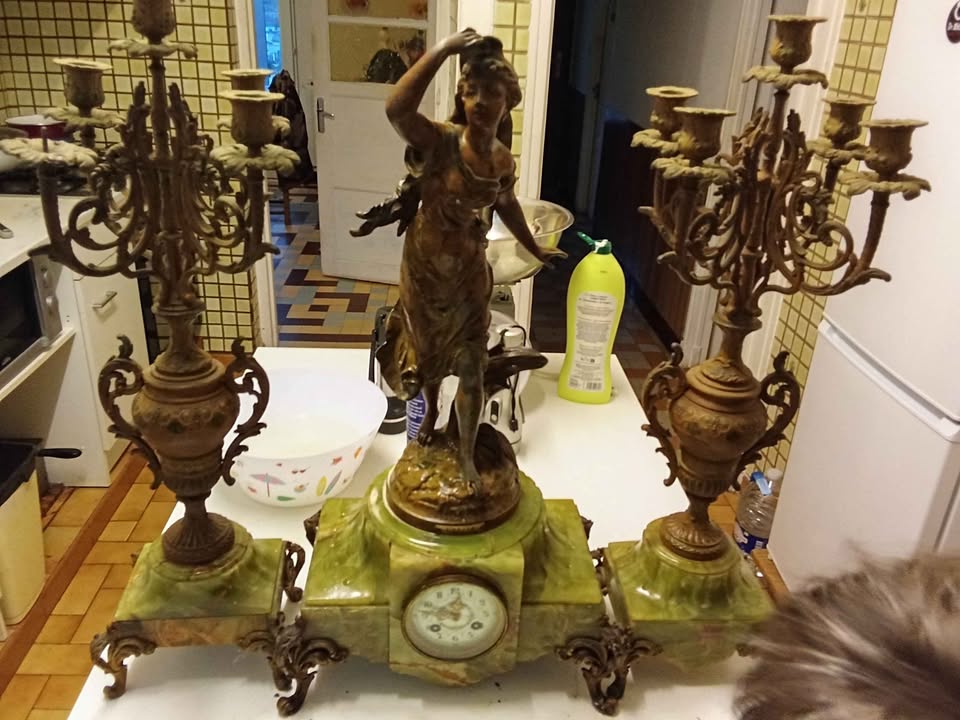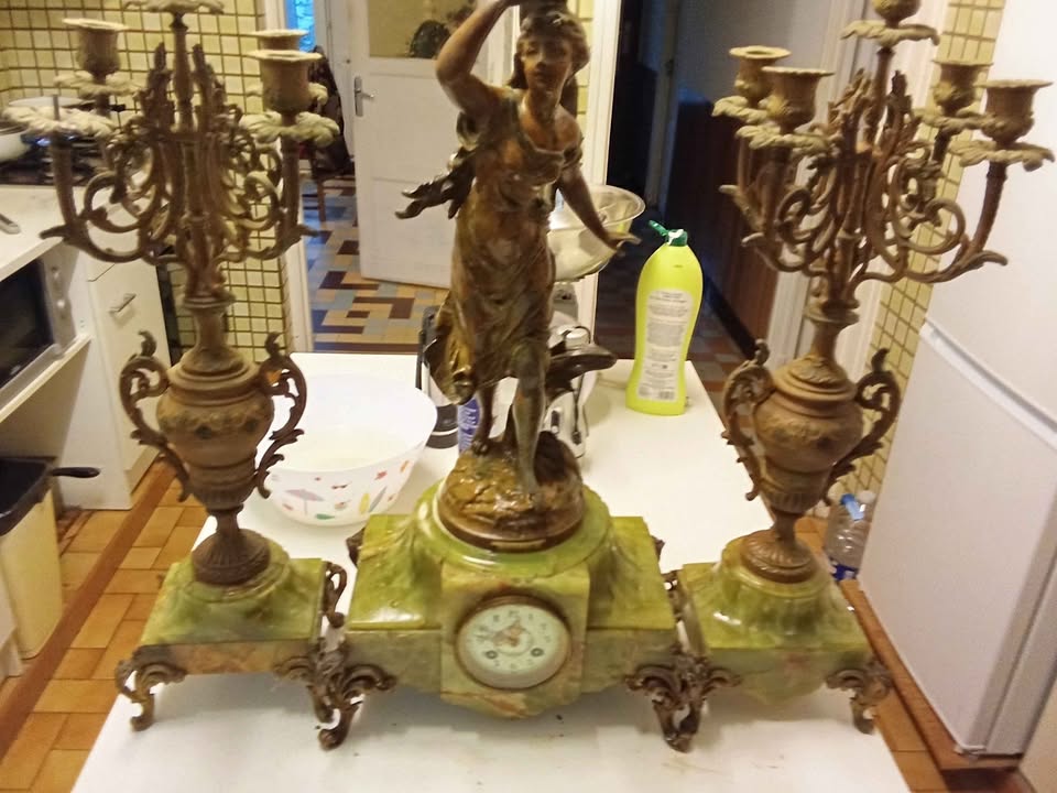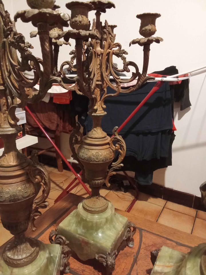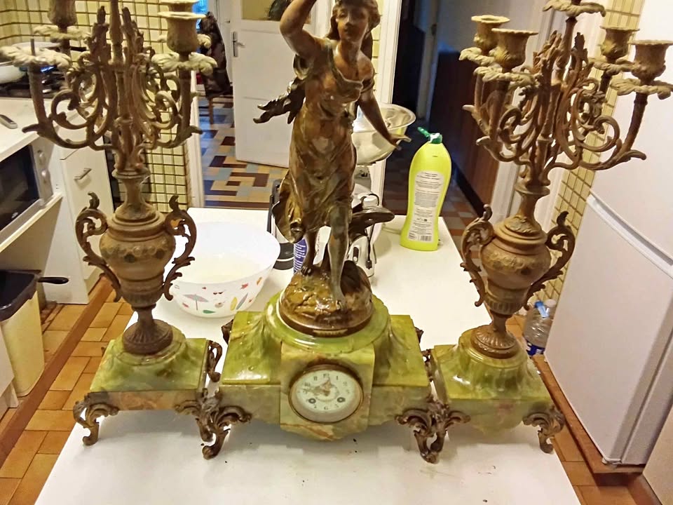 Piękna statuetka wykonana z zielonego marmuru z dwoma pięciogłowymi kandelabrami, wysokość 63 cm mosiężnego i zielonego marmuru XIX wieku.