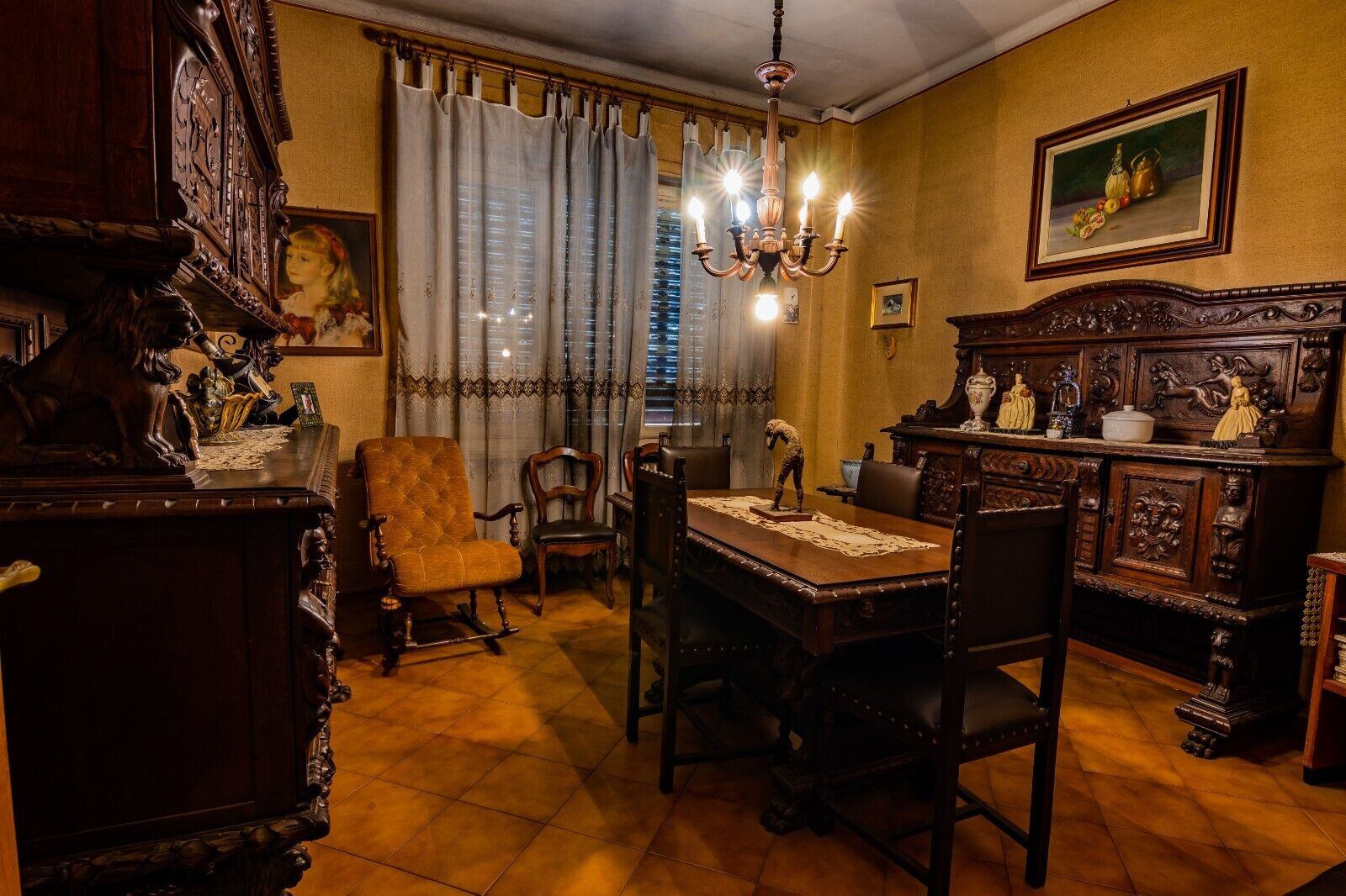 W skład kompletu z drewna orzechowego wchodzi: kredens, pomocnik, stół, 6 x krzesło.
