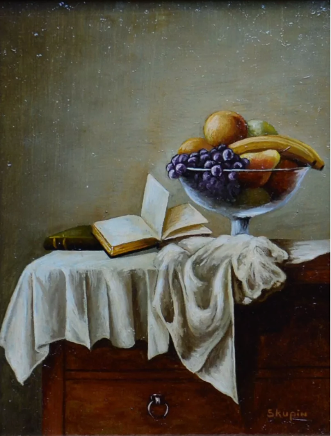 Ks112 Miniatura, Oryginał, Ryszard Skupin (1930-2005), Martwa Natura z książką i miską owoców