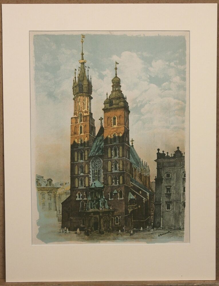 Ks27 Litografia barwna, Oryginał, Jan Kanty Gumowski ( 1883 – 1946), Widok kościoła Mariackiego w Krakowie, 1920r.