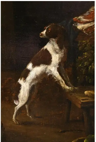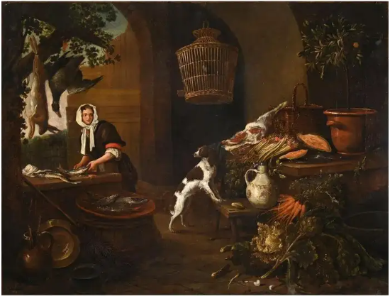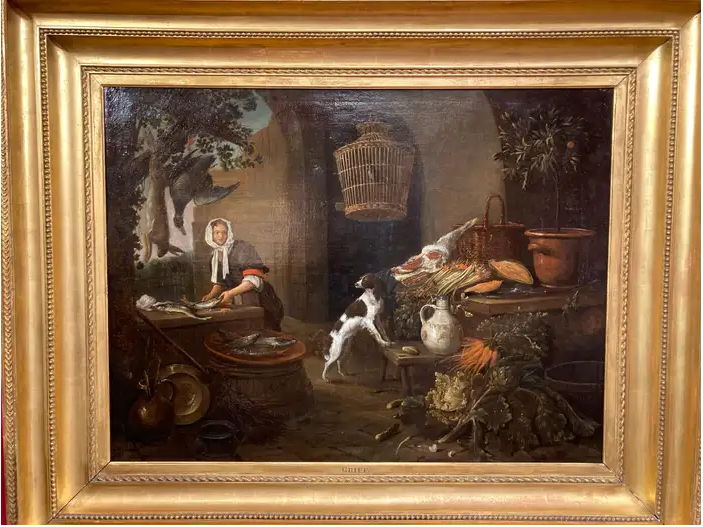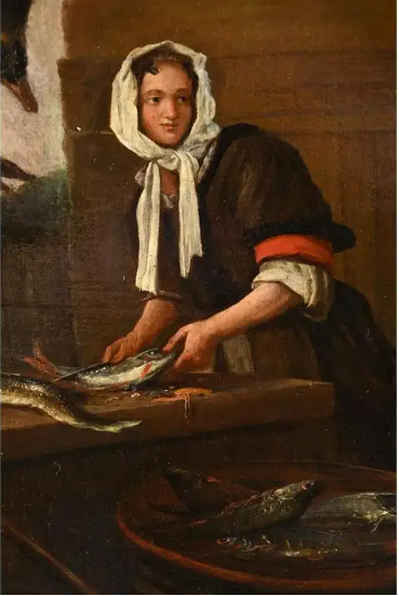 Ks469 Obraz, Oryginał, Kucharka łuskająca ryby w kuchni, XVII/XVIIIw.