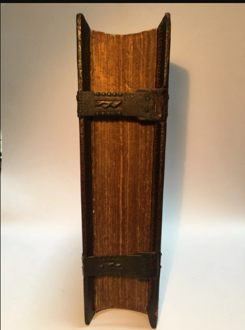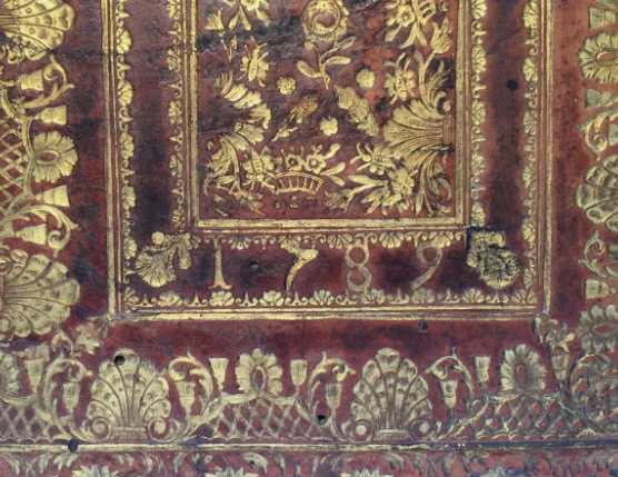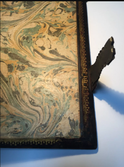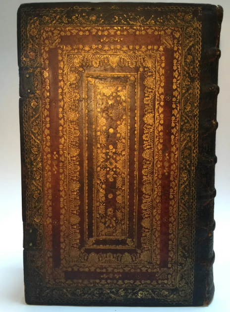Oprawa: Wykonana z brązowej i czerwonej skóry z bogatymi złotymi tłoczeniami i dwoma funkcjonalnymi zapięciami