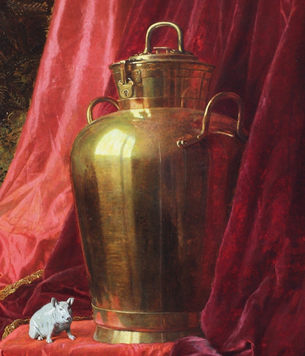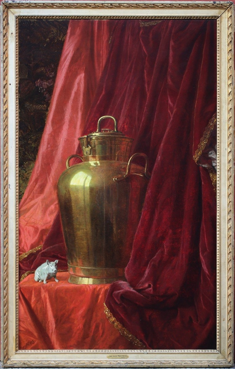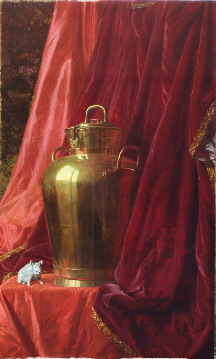 Ks942 Duży Obraz, Oryginał, Hrabia Andrzej Mniszek (1823-1905), Martwa Natura z miedzianym garnkiem i świnką skarbonką, 1903r.