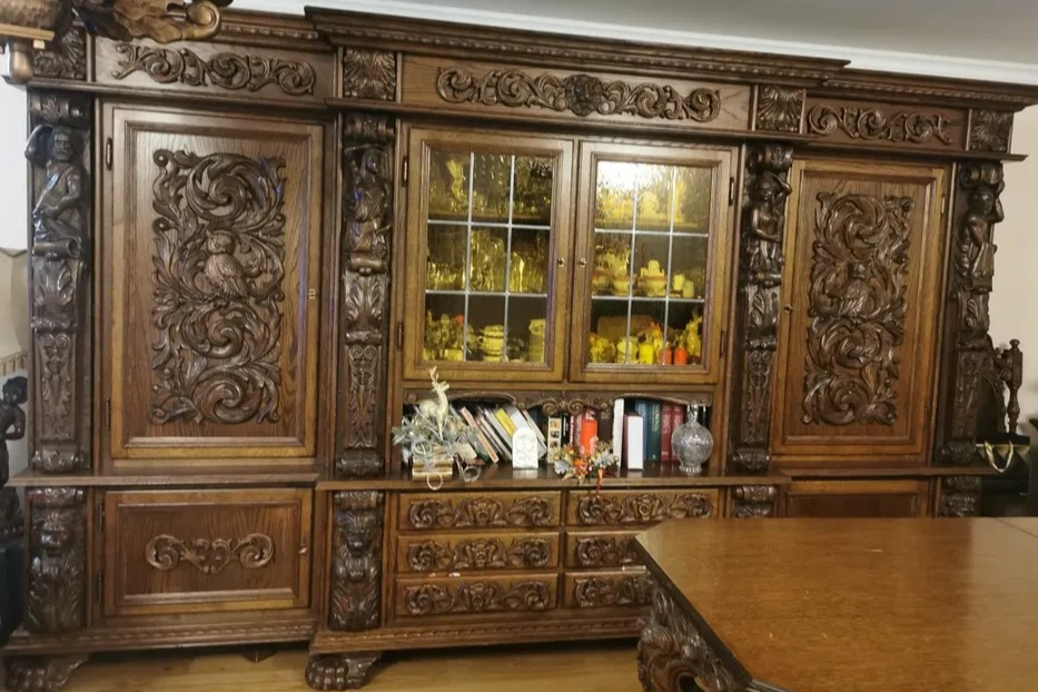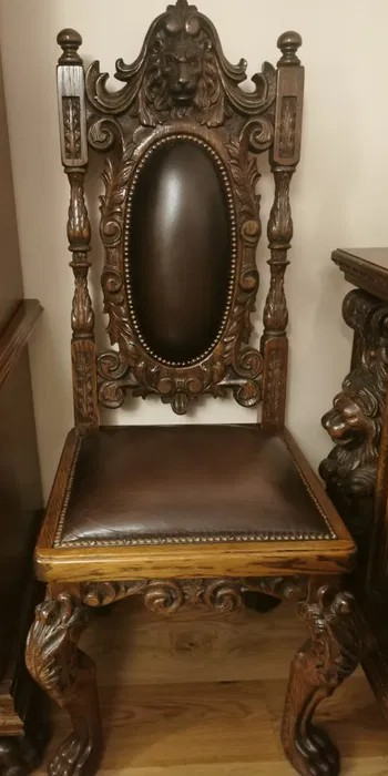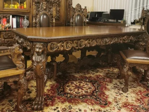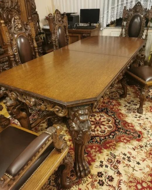 W skład kompletu z drewna dębowego wchodzi: duży kredens, rozkładany stół, 2 x fotel, 6 x krzesło.