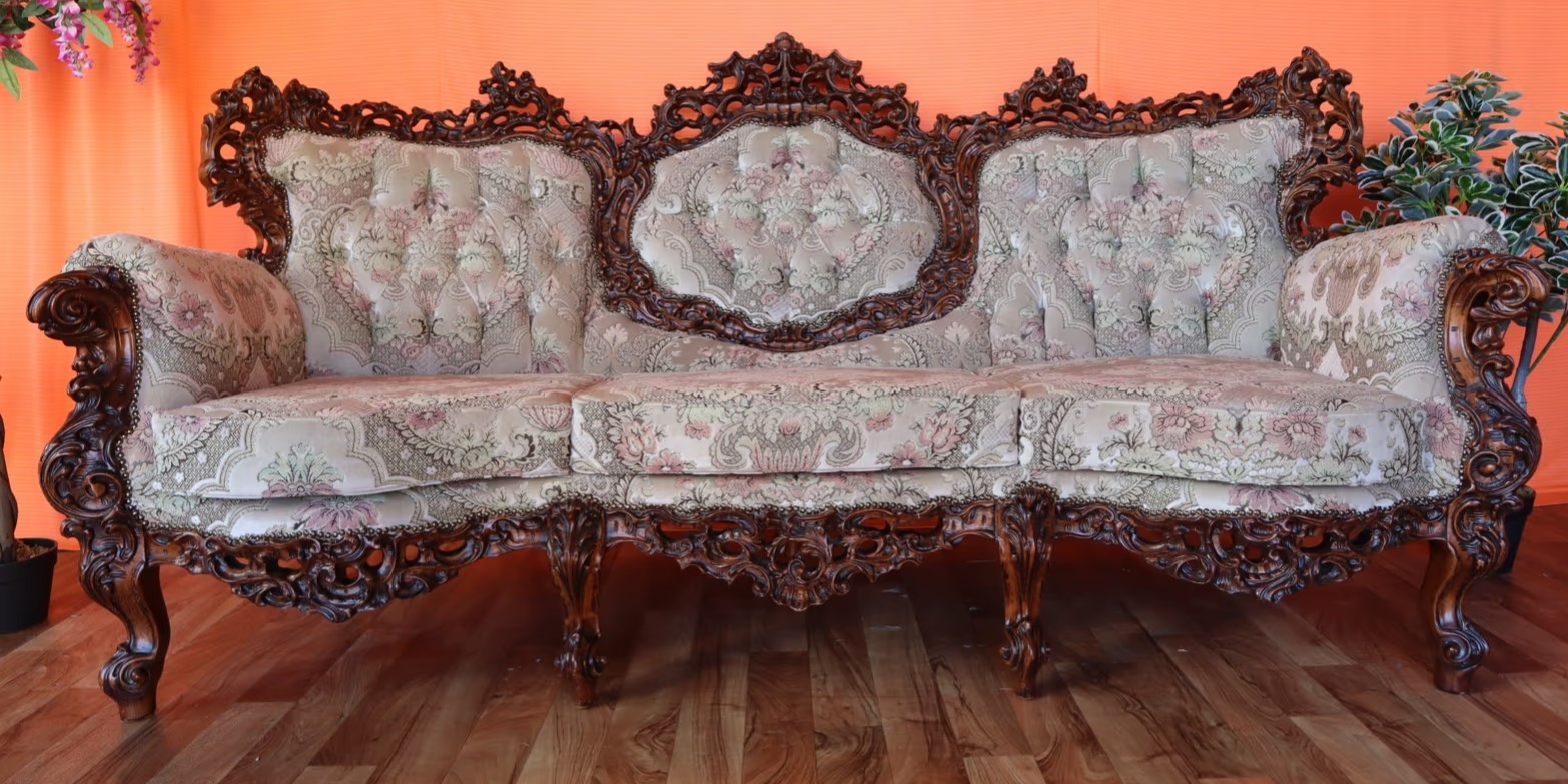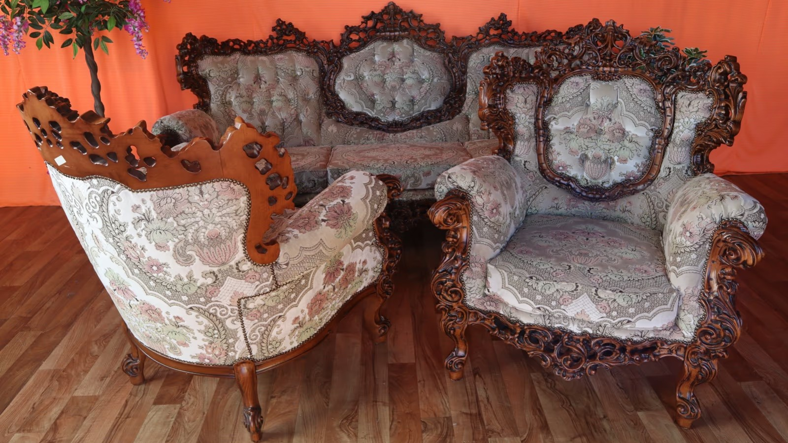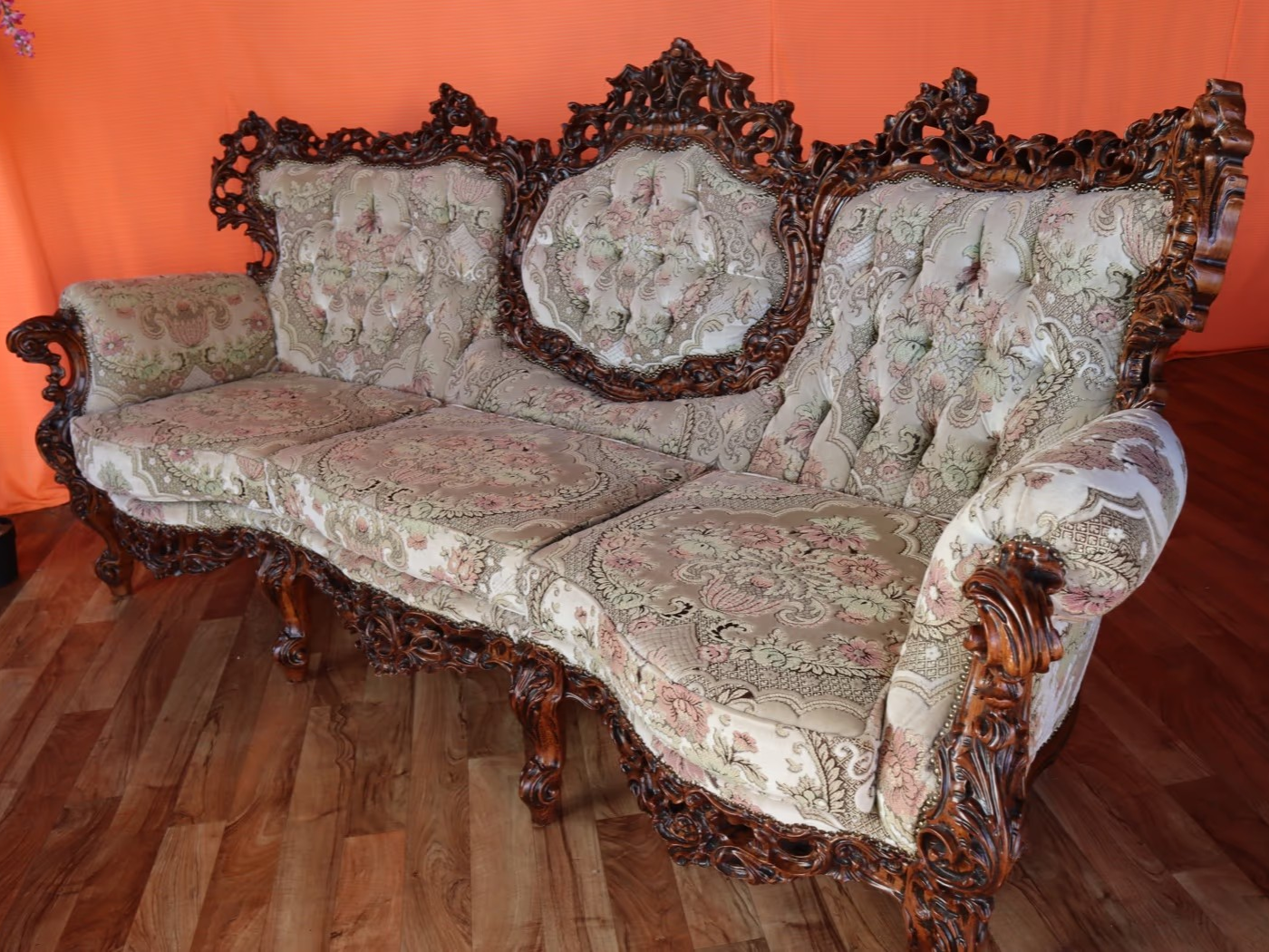W skład kompletu z drewna orzechowego wchodzi: sofa 3-osobowa, 2 x fotel.