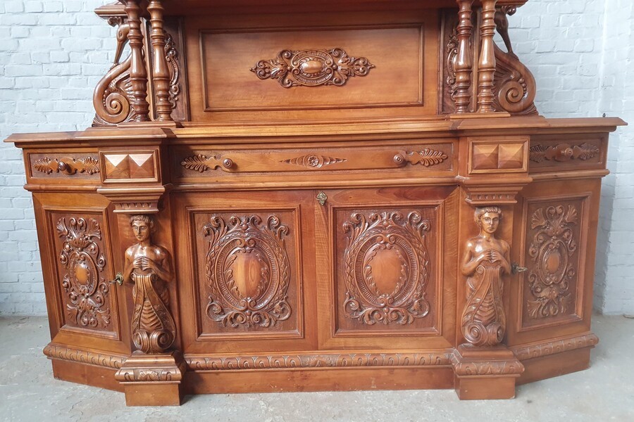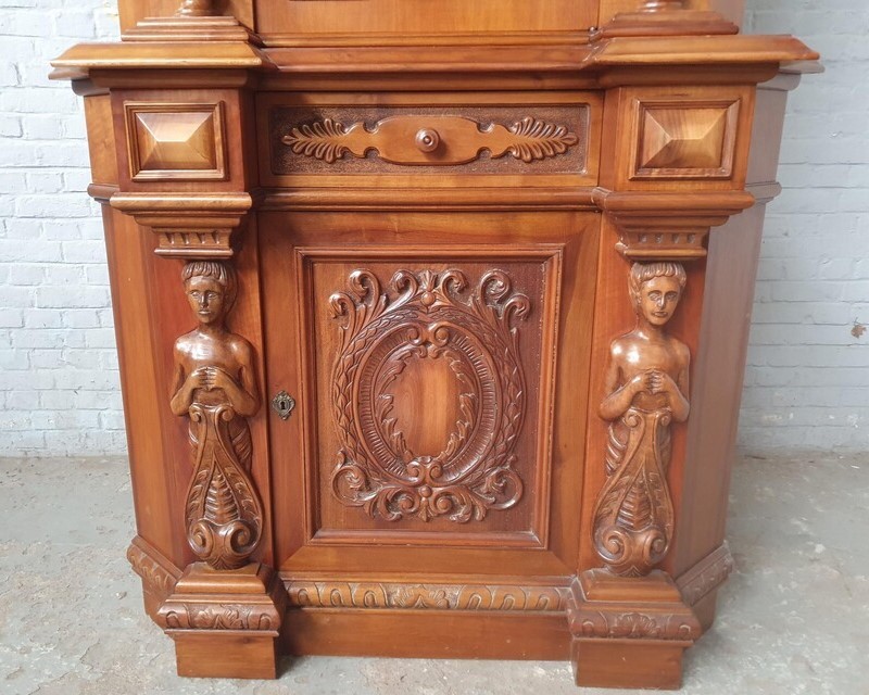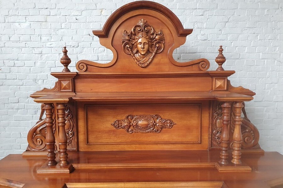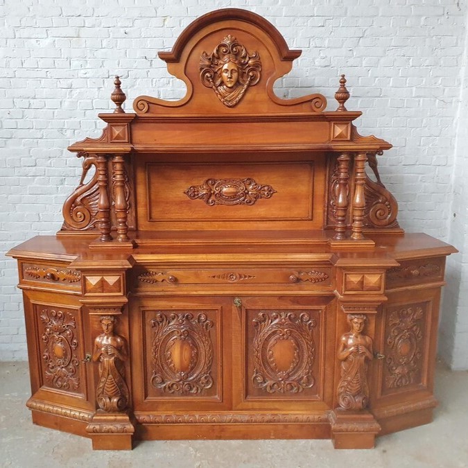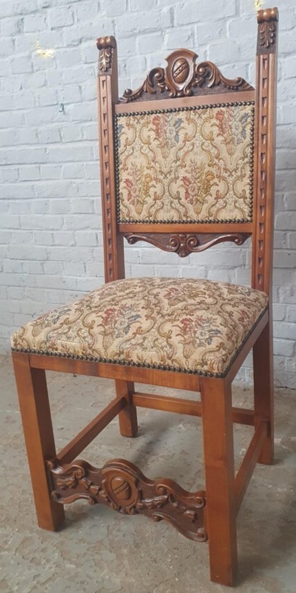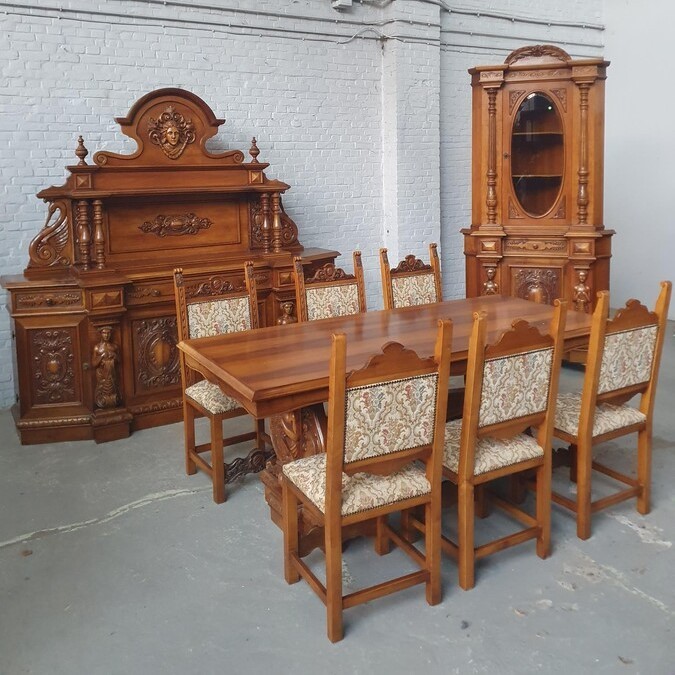 W skład kompletu z drewna orzechowego wchodzi: kredens narożny, pomocnik, stół, 6 x krzesło.