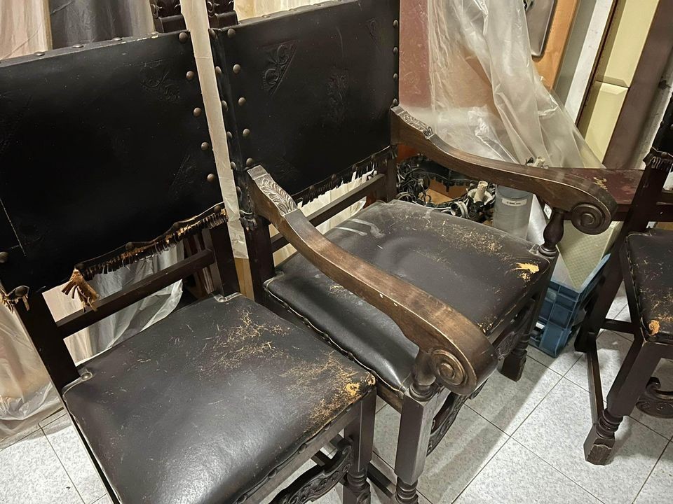 W skład kompletu wchodzą: biblioteka, biurko, krzesło z podłokietnikami, 2 x krzesło.