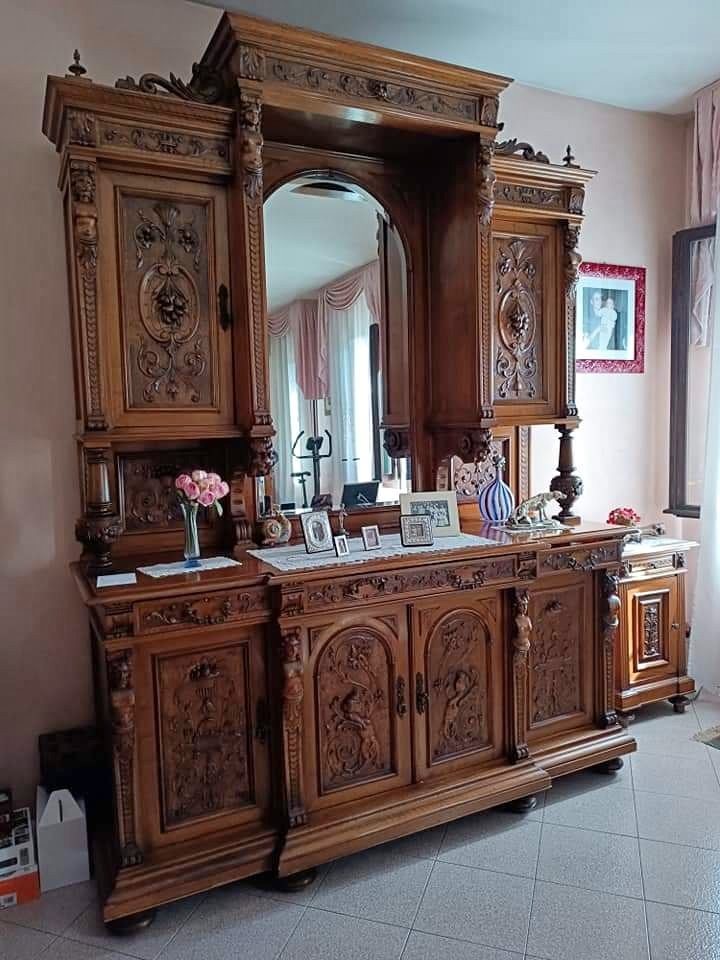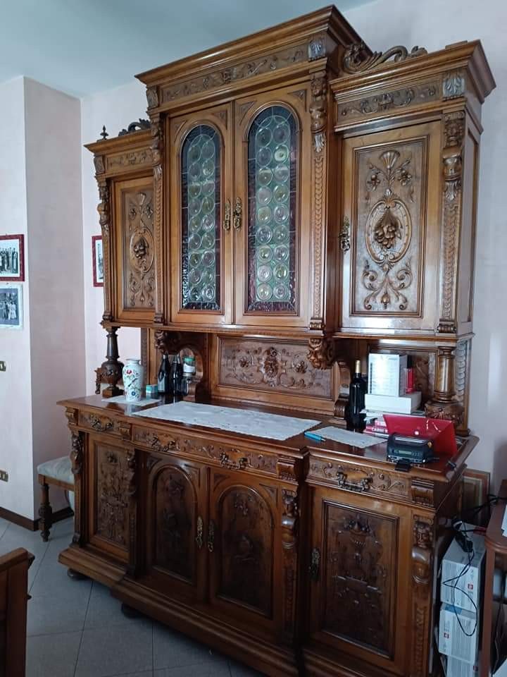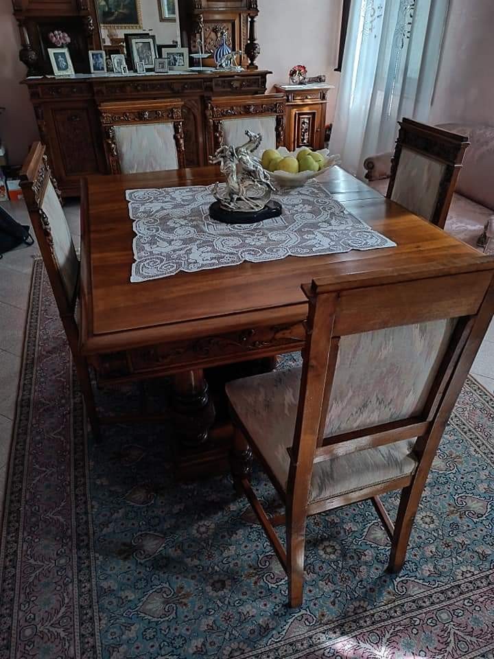 W skład kompletu wchodzą: 2 x kredens, stół, krzesła, 2 x sofa.