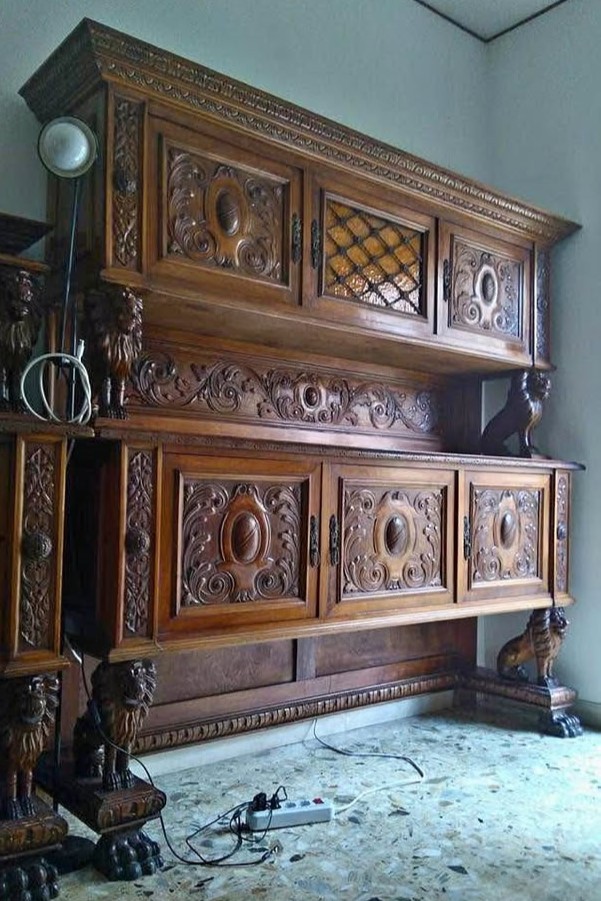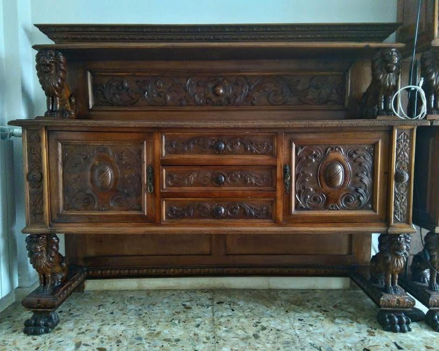 W skład kompletu z drewna orzechowego wchodzi: kredens, pomocnik, stół.
