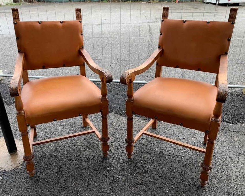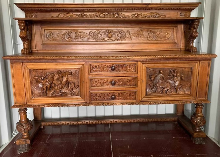 W skład kompletu z drewna orzechowego wchodzi: kredens, pomocnik, stół, krzesła.
