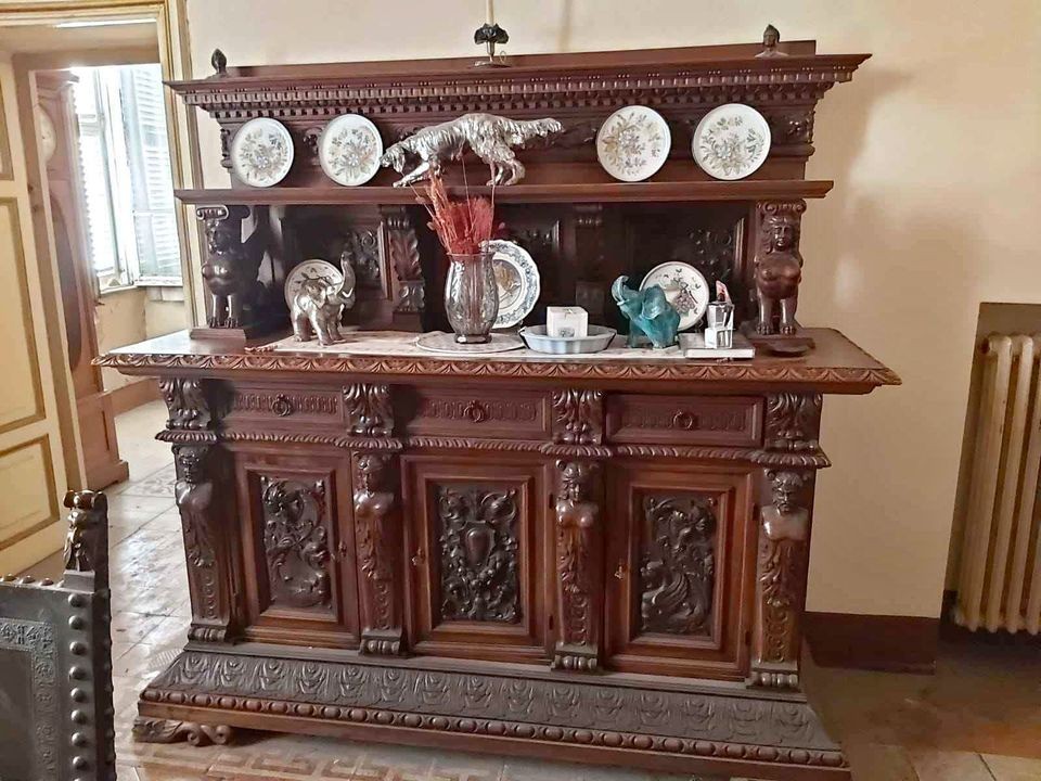 W skład kompletu wchodzą: 2 x kredens, stół, 6 x krzesło.